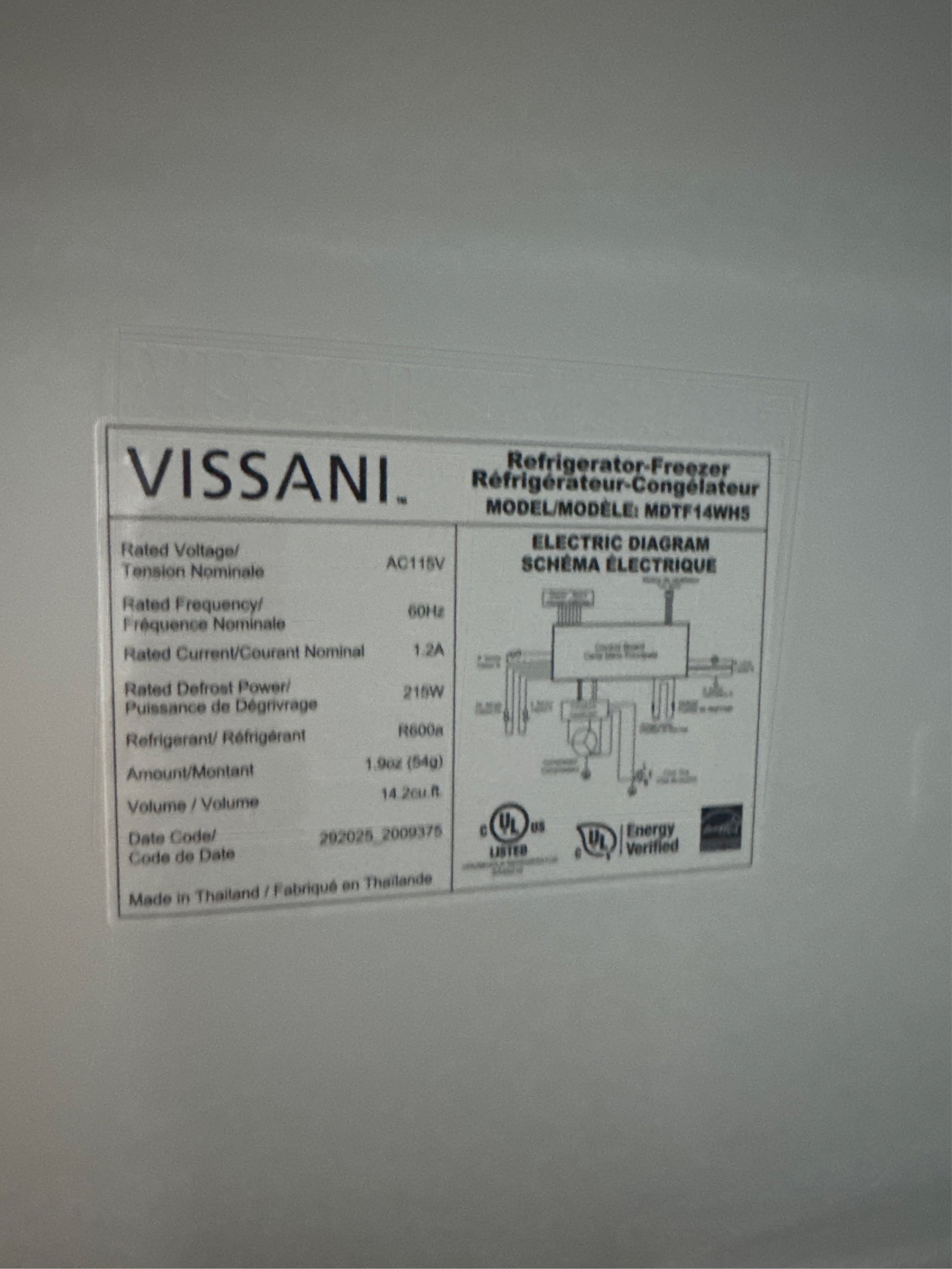 Style and design meet affordability and function in this 14.2 cu. ft. refrigerator with top freezer by Vissani. The adjustable shelving allows for easy organization and plenty of space for products of all shapes and sizes. Easily removable shelves made from safety glass allow for quick cleaning. The crisper drawer allow ample space to keep your fruit and vegetables fresher longer. With an integrated LED light for increased visibility, you will have no problem seeing inside your fridge in the dark.. Appliance Category: Refrigerator. Appliance Series: Vissani. Appliance Type: Top Freezer Refrigerator. Built-In and Standard Type: Top Freezer. Color - Appliance Cabinet: White. Color - Door Handle(s): White. Color/Finish: White. Color/Finish Family: White. Defrost Type: Frost Free. Dispenser Location: No Dispenser. Door Finish: Smooth. Energy Consumption (kWh/year): 333. Energy Efficiency Tier Rating: Tier I. Freezer Capacity (cu. ft.): 3.67 cu ft. Freezer Door Type: Swing Door. Freezer Features: In-door Storage. Freezer Type: Top Door Freezer. General Features: Flat-back Design,Self-Closing Door. Handle Type: Recessed Handle. Hardware Color/Finish: White. Hardware Color/Finish Family: White. Ice Maker Features: No Ice Maker. Ice/Water Dispenser: None. Indoor/Outdoor: Indoor. Installation Depth: Counter Depth. Installation Type: Free Standing. Number of Doors: 2 Door. Number of Freezer Baskets/Bins: 2 Baskets/Bins. Number of Freezer Shelves: 1 Shelf. Number of Refrigerator Shelves: 2 Shelves. Operational Features: Humidity Controlled Crisper,LED Temperature Controls,Self-Closing Door. Overall Product Height (in.): 61 in. Product Weight (lb.): 137.8 lb. Refrigeration Dispenser Features: No Dispenser. Refrigerator Capacity (cu. ft.): 10.53 cu ft. Returnable: 90-Day. Shelf Material - Freezer: Glass. Shelf Material - Refrigerator: Glass. Storage Features: Adjustable Shelves/Racks,Crisper Drawer,Gallon Door Storage,Removable Shelves. Temperature Control Type: Internal Electric. Total Capacity (cu. ft.): 14.2 cu ft. Water Filter Replacement Model#: NA. Certifications and Listings: UL Certified. Depth (Excluding Handles) (in.): 28.78 in. Depth (Including Handles) (in.): 28.78 in. Depth (Less Door) (in.): 26 in. Depth With Door Open 90 Degrees (in.): 54.4 in. Height to Top of Door Hinge (in.): 60.63 in. Height to Top of Refrigerator Case (in.): 60 in. Height to Top of Refrigerator Door (in.): 60.63 in. Product Depth (in.): 28.78 in. Product Height (in.): 60.63 in. Product Width (in.): 27.56 in. Refrigerator Width (in.): 27.56 in. Overall Product Height (in.): 61 in. Total Capacity (cu. ft.): 14.2 cu ft. Depth (Excluding Handles) (in.): 28.78 in. Height to Top of Door Hinge (in.): 60.63 in. Height to Top of Refrigerator Case (in.): 60 in. Ice Maker Features: No Ice Maker. Installation Depth: Counter Depth. Dispenser Location: No Dispenser