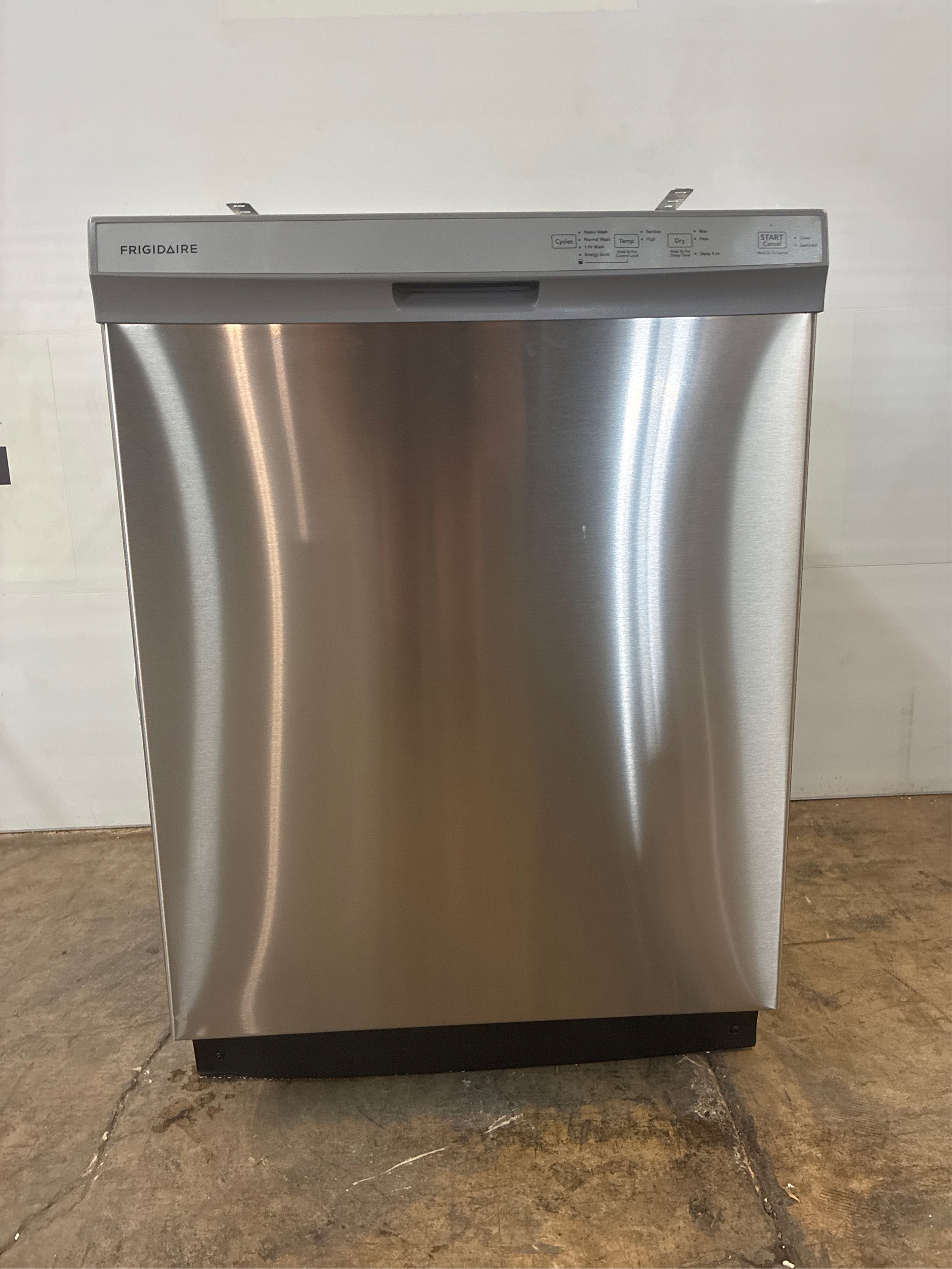 The Frigidaire 24 built-in dishwasher offers triple the cleaning power giving your dishes a more effective clean with our three spray arms that achieve better water coverage. Plus, enjoy an enhanced dry with MaxDry, which delivers better results reducing the need for towel drying. This quiet dishwasher (54 dBA) also includes DishSense Sensor Technology, a sanitize option and is Energy Star certified.. Amperage (A): 10 A. Appliance Category: Dishwasher. Appliance Series: Not Applicable. Appliance Type: Dishwasher. Color/Finish: Stainless Steel. Color/Finish Family: Stainless Steel. Control Location: Front Control. Control Type: Electronic. Custom Door Panel Ready: No. Decibel (Sound) Rating: 54 dBA. Dishwasher Features: Self-Cleaning Filter. Dishwasher Rack Configuration: 1st Rack- Silverware Basket,Removable Silverware Basket,Standard Rack Only. Dishwasher Wash Cycles: Delay Start,Eco,Pots and Pans,Quick Wash,Standard Wash. Dry Options: Heated Dry. Energy Consumption (kWh/year): 240. Energy Efficiency Tier Rating: Tier I. Handle Type: Pocket Handle. Hardware Color/Finish: Stainless Steel. Hardware Color/Finish Family: Stainless. Hose Length (ft.): 6 ft. Number of Cycles: 4. Number of Place Settings: 14. Product Weight (lb.): 56 lb. Rack Material: PVC. Returnable: Non-Returnable. Silverware Basket Location: In Rack. Sound Rating Range (Decibels): Quiet. Steam Function: Without Steam. Tub Material: Plastic Tub. Voltage (V): 120 V. Certifications and Listings: ASSE Listed,Energy Star,NSF Certified,UL Listed,cUL Listed. Cut-Out Depth (in.): 24 in. Cut-Out Height (in.): 34.25 in. Cut-Out Width (in.): 24 in. Depth - Door Shut (with Handle) (in.): 25 in. Depth - Door Shut (without Handle) (in.): 25 in. Depth With Door Open 90 Degrees (in.): 49.25 in. Dishwasher Size: 24 In.. Height - Maximum (in): 35 in. Height - Minimum (in): 33.5 in. Product Depth (in.): 25 in. Product Height (in.): 35 in. Product Width (in.): 24 in. Dishwasher Size: 24 In.. Height - Max (in): 35 in. Sound Rating Range (Decibels): Quiet. Control Location: Front Control. Handle Type: Pocket Handle. Features: Self-Cleaning Filter. Dry Options: Heated Dry. Dishwasher Wash Cycles: Quick Wash