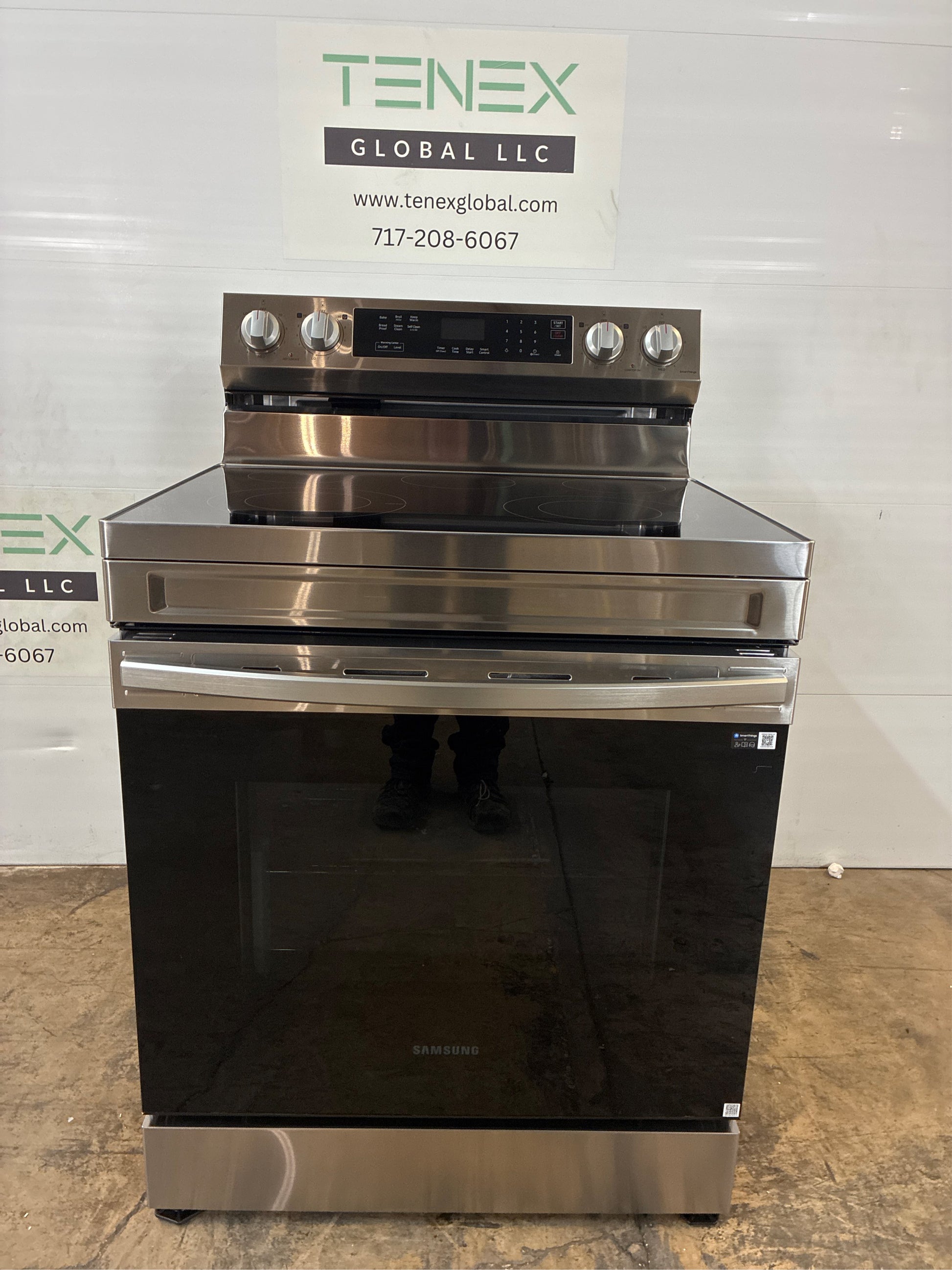 Elevate the look of your kitchen with Samsung's new Smart Freestanding Electric Range. Our Stainless Steel design elegantly wraps around cooktop sides and up through the slim control panel. Upgraded technology makes cooking simple and fun.. Amperage (A): 40 A. Appliance Category: Range. Appliance Series: Not Applicable. Appliance Type: Electric Range. Capacity of Oven (cu. ft.): 6.3 cu ft. Cleaning Type: Self Cleaning. Color of Cooktop: Black. Color/Finish: Stainless Steel. Color/Finish Family: Stainless Steel. Commercial/Residential: Residential. Control Type: Manual. Controls Location: Back Control. Cooktop Features: Indicator Light- Heating Element On,Radiant. Cooktop Surface Type: Glass Top. Drawer Type: Lower Storage Drawer. Element No.1 Type: Radiant. Element No.1 Wattage: 3300. Element No.2 Type: Radiant. Element No.2 Wattage: 1200. Element No.3 Type: Radiant. Element No.3 Wattage: 3300. Element No.4 Type: Radiant. Element No.4 Wattage: 1200. Element No.5 Type: Radiant. Element No.5 Wattage: 100. Fuel Type: Electric. Hardware Color/Finish: Stainless Steel. Hardware Color/Finish Family: Stainless Steel. Included: No Additional Items Included. Number of Elements: 5 element. Number of Oven Racks: 2. Number of Rack Positions: 8. Oven Cleaning Options: Manual Clean,Steam Clean. Oven Cooking Process: Standard. Oven Features: Standard Features Only. Product Weight (lb.): 150 lb. Range Installation Type: Freestanding. Returnable: Non-Returnable. Voltage (V): 240 V. Certifications and Listings: CSA Certified. Depth With Door(s) Open 90 Degrees (in.): 48 in. Element No.1 Size (in.): 9 in. Element No.2 Size (in.): 9 in. Element No.3 Size (in.): 6 in. Element No.4 Size (in.): 6 in. Element No.5 Size (in.): 7 in. Oven Interior Depth (in): 19.75. Oven Interior Height (in): 22.4. Oven Interior Width (in): 24.8. Product Depth (in.): 28.6 in. Product Height (in.): 46.6 in. Product Width (in.): 29.9 in. Range Size (Width): 30 in.. Range Size (Width): 30 in.. Range Installation Type: Freestanding. No of Elements: 5 element. Capacity (cu. ft.): 6.3 cu ft. Capacity (cu. ft.): 6.3 cu ft.. Surface Type: Glass Top. Cleaning Type: Self Cleaning. Oven Cooking Process: Standard