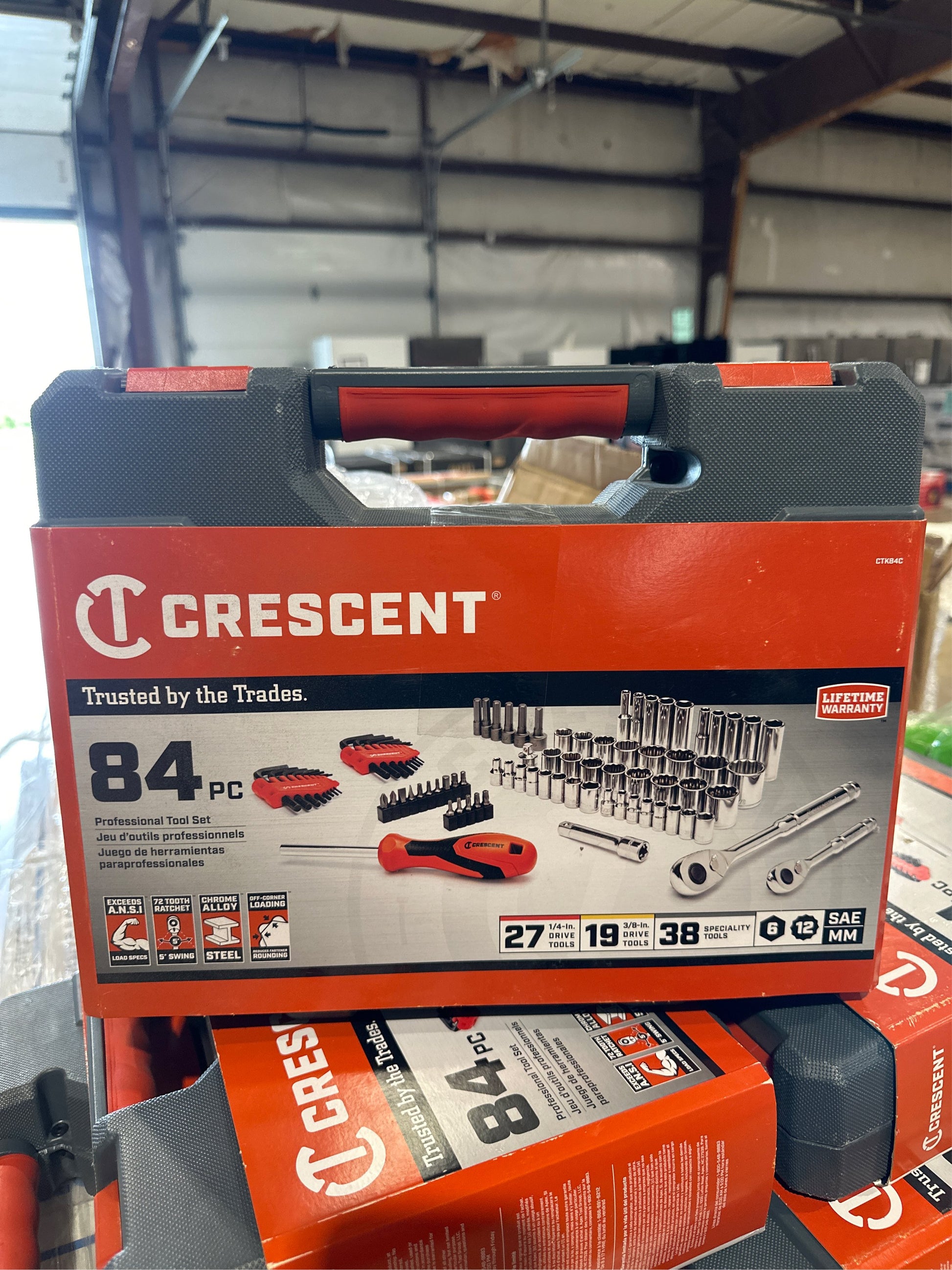 Crescent mechanics tools are made from chrome alloy steel, which is specially formulated and heat treated for high strength and superior resistance to abrasion and corrosion. Wrenches, ratchets, sockets, and drive tools all have a flawless chrome finish to extend tool life. The sockets feature off-corner loading, which greatly reduces fastener rounding. The wide selection of Crescent tools satisfies today's rigorous mechanics tool demands.. Carrier Type: Hard Shell Carrier. Color Family: Chrome. Hand Tool Type: Multi-tool. Individual/Set: Set. Measurement Standard: Metric,SAE. Multiple Tool Set Type: Mechanic Sets. Number of Pieces: 84. Returnable: 90-Day. Socket Depth: Deep,Intermediate. Socket Type: Hex. Tools Included: Combination Wrench,Hex Keys,Nut Driver,Ratchet,Socket Adapter,Socket Extender,Sockets. Tools Product Type: Hand Tool. Drive Size: 1/4 in,3/8 in. Product Depth (in.): 12.800 in. Product Height (in.): 2.800 in. Product Width (in.): 10.00 in. Number of Pieces: 84. Carrier Type: Hard Shell Carrier. Drive Size: 3/8 in. Drive Size: 1/4 in. Measurement Standard: Metric. Socket Type: Hex. Measurement Standard: SAE. Individual/Set: Set