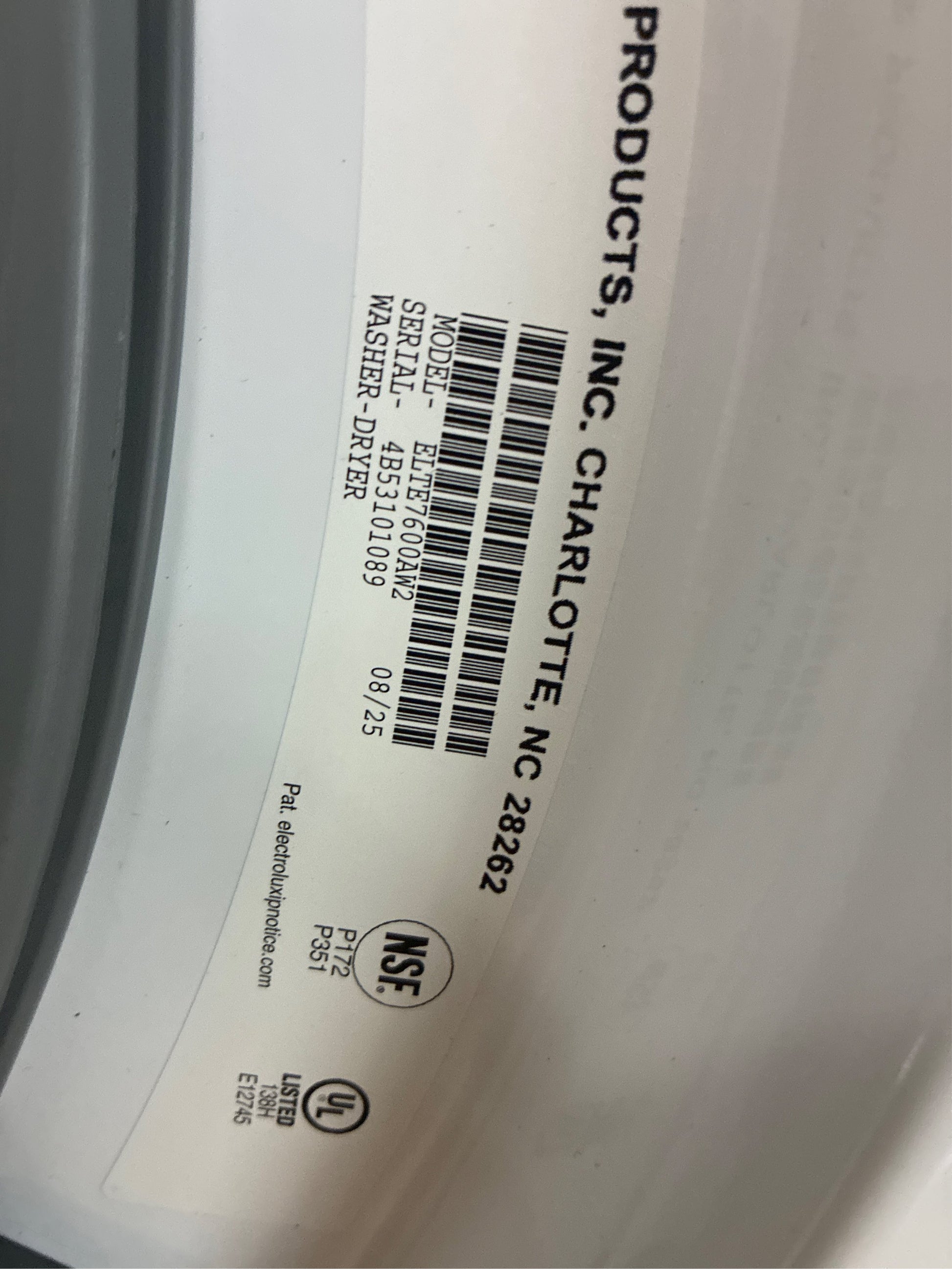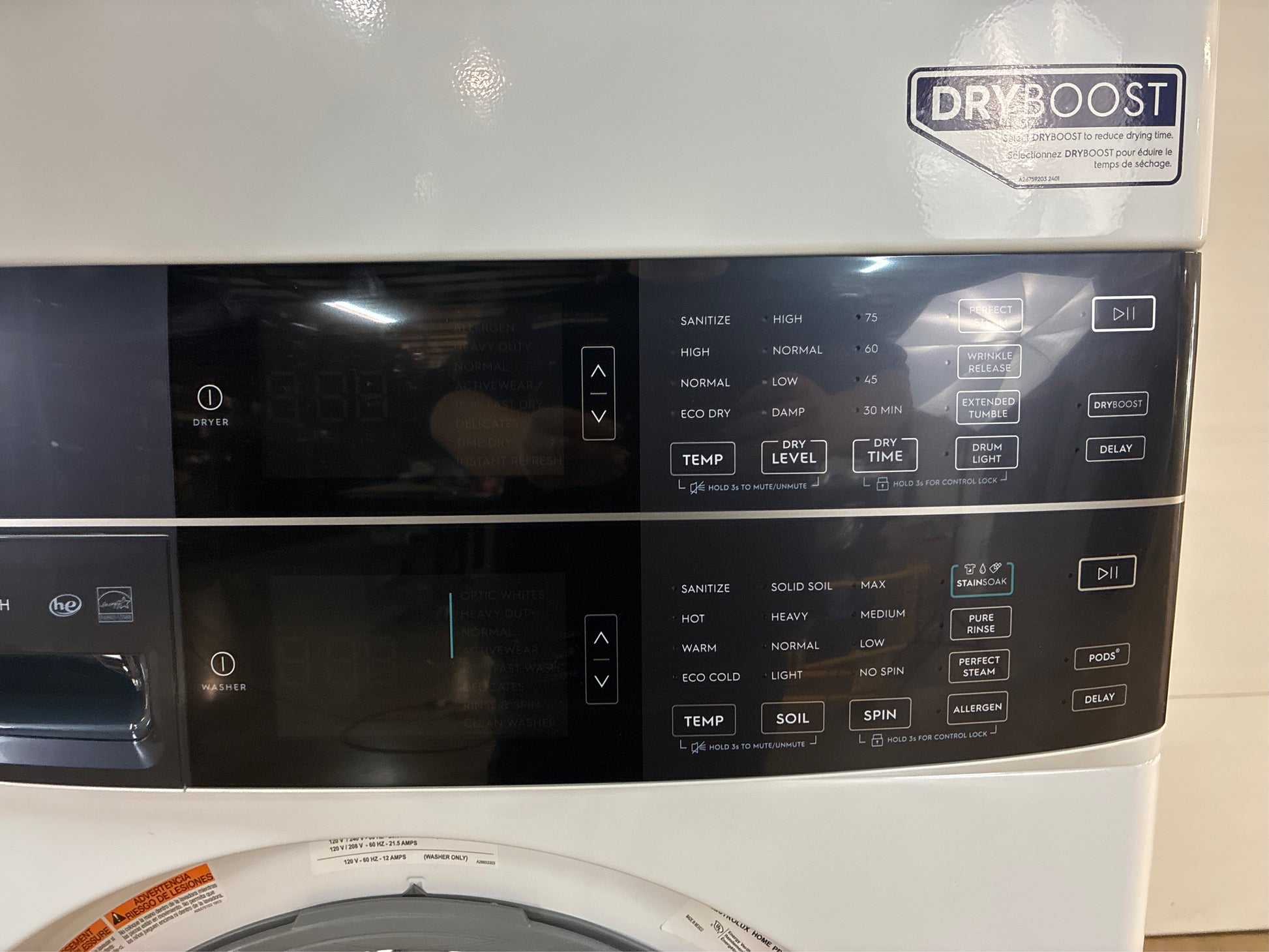 Full-size and fully integrated front load Electrolux Laundry Tower features a stacked design that takes up half the floor space, freeing up the laundry room for extra storage, all with an easy to reach control panel. The washer provides the most effective stain removal with SmartBoost premixing technology*. The dryer with LuxCare Dry uses an moisture sensor to prevent over or under-drying.. Agitator/Impeller Type: Impeller. Amperage (A): 30 A. Appliance Series: Not Applicable. Appliance Type: Washer & Dryer Combo. Capacity - Dryer (cu. ft.): 8. Color/Finish: White. Color/Finish Family: White. Control Type: Electronic. Door Material: Glass. Dry Cycles: Active Wear,Bulky Items,Delicates,Quick Dry,Sanitize,Timed Dry,Touch Up. Dryer Door Style: Reversible. Dryer Drum Material: Stainless Steel Drum. Dryer Features: Adjustable End-of-Cycle Signal,Control Lock,Control Sounds On/Off,Delay Start,Digital Cycle Countdown,Door Window,Energy Saver,Front Control,Interior Light,Lint Filter,Moisture Sensor,Sensor Dry,Timed Dry. Dryer Fuel Type: Electric. Energy Consumption (kWh/year): 85. Energy Efficiency Tier Rating: Tier II. Exhaust Vent Location: Rear. Hardware Color/Finish: White. Hardware Color/Finish Family: White. Included: Power Cord. Lint Filter Location: Front. Maximum Spin Speed (RPM): 1300. Number of Drying Cycles: 8. Number of Drying Temperatures: 4. Number of Rinse Cycles: 1. Number of Rinse Temperatures: 1. Number of Wash Cycles: 8. Number of Wash Speeds: 4. Number of Wash Temperatures: 4. Product Weight (lb.): 339 lb. Returnable: Non-Returnable. Steam Function: Steam. Vent Type: Vented. Voltage (volts): 240. Wash Cycles: Active Wear,Delicates,Heavy Duty,Normal,Rinse & Spin,Sanitize,Tub Clean,Whites. Washer Dispensers: Bleach,Detergent Packs,Fabric Softener,Liquid Detergent,Powdered Detergent,Prewash Detergent. Washer Features: Delay Start,Door Window,End-Of-Cycle Signal,Front Control,Interior Light. Washer Tub/Drum Material: Stainless Steel Drum. Certifications and Listings: Energy Star,NSF Certified,UL Listed. Capacity - Washer (cu. ft.): 4.5. Depth With Door Open 90 Degrees (in.): 50.6 in. Door Opening Height (In.): 12.4. Door Opening Width (In.): 16.6. Dryer Door Opening Height (in.): 14.25. Dryer Door Opening Width (in.): 16.125. Product Depth (in.): 32 in. Product Height (in.): 76.25 in. Product Width (in.): 27 in. Capacity (cu. ft.): 4.5. Dryer Fuel Type: Electric. Vent Type: Vented. Width (in.): 27 in. Features: Front Control. Features: Door Window. Features: End-Of-Cycle Signal. Features: Interior Light
