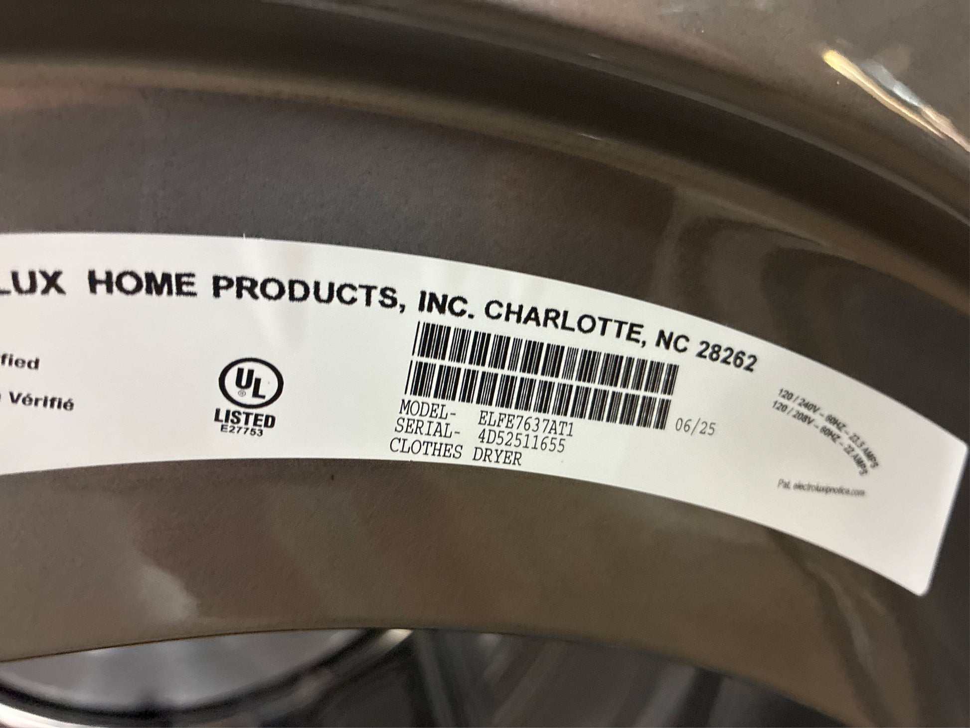 The Electrolux front load electric dryer with Balanced Dry technology prevents temperature spikes to keep fabrics cooler throughout the dry cycle. LuxCare Dry uses an advanced moisture sensor to prevent over or under-drying. The Electrolux Perfect Steam electric dryer with Predictive Dry has a more precise sensor to protect fabrics from overdrying. Instant Refresh cycle revives fabrics without washing. Compatible with Electrolux's Stacking Kit (model: STACKIT7XL) and Pedestal (model: EPWD257UTT). Awarded Best Overall washer and dryer set of 2023 by Reviewed.com.. Amperage (A): 30 A. Appliance Category: Dryer. Appliance Series: Not Applicable. Appliance Type: Electric Dryer. Capacity - Dryer (cu. ft.): 8. Color/Finish: Titanium. Color/Finish Family: Slate. Control Type: LED. Door Material: Plastic. Door Shape: Round Door. Door Style: Reversible. Dry Cycles: Active Wear,Delicates,Heavy Duty,Mixed Loads,Quick Dry,Timed Dry,Towels and Sheets,Wrinkle Free. Dryer Drum Material: Stainless Steel Drum. Dryer Features: Adjustable End-of-Cycle Signal,Automatic Temperature Control,Delay Start,Digital Cycle Countdown,Door Window,Four-Way Venting,Interior Light,Lint Filter,Moisture Sensor,Timed Dry. Dryer Fuel Type: Electric. Exhaust Vent Location: Rear. Hardware Color/Finish: Titanium. Hardware Color/Finish Family: Slate. Included: No Additional Items Included. Lint Filter Location: Front. Matching Washer Type: Front Load Matching. Number of Drying Cycles: 11. Number of Drying Temperatures: 5. Pedestal Model#: EPWD257UTT. Product Weight (lb.): 130 lb. Returnable: Non-Returnable. Stackable: Stackable. Stacking Kit Model#: STACKIT7X. Steam Function: Steam. Vent Type: Vented. Voltage (volts): 240. Certifications and Listings: Energy Star,UL Listed. Depth With Door Open 90 Degrees (in.): 53 in. Door Opening Height (In.): 14.25. Door Opening Width (In.): 16.125. Product Depth (in.): 31.5 in. Product Height (in.): 38 in. Product Width (in.): 27 in. Capacity (cu. ft.): 8. Voltage (volts): 240. Features: Lint Filter. Vent Type: Vented. Appliance Type: Electric Dryer. Features: Timed Dry. Features: Moisture Sensor. Features: Interior Light