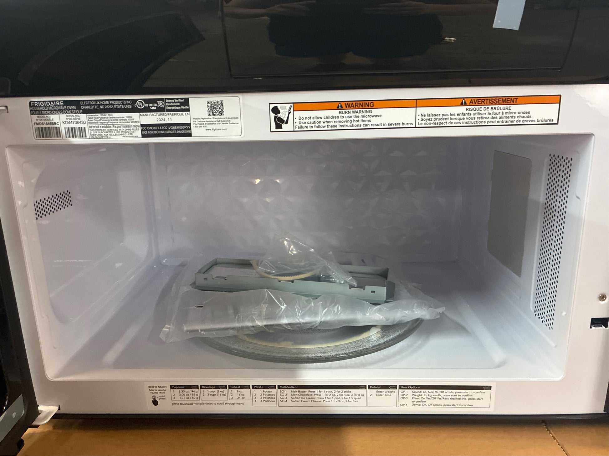 This Frigidaire 1.8 cu. ft. Over the range Microwave makes meal time easier with Convenient Quick Start cooking options that help you put delicious meals on the table in minutes. Plus, changing your filter has never been more convenient with our Push to Open PureAir Filter Door and filter indicator light. Also includes a Frigidaire PureAir Filter and features interior and exterior bright LED lighting.. Start cooking yummy meals faster with 3 Quick Start options. Capture odors and circulate fresher air with PureAir Filter. Filter change made easy with Push-to-Open PureAir Filter Door. Start cooking yummy meals faster with 3-Quick Start options. Capture odors and circulate fresher air with PureAir Filter. Filter change made easy with Push-to-Open PureAir Filter Door. Clear, bright view of cooktop with bright LED lighting. Know when it's time to change your filter. Doubles as a hood, offering ventilation with two fan speeds. Easily see your dish while it cooks with bright LED lighting. Microwave door opens up 90 , perfect for compact spaces. Spacious 1.8 cu. ft. can fit almost any dish size. OneTouch Cooking. Click here for more information on Electronic Recycling Programs . Appliance Category: Microwave. Appliance Type: Over the Range Microwave. Color/Finish: Black. Color/Finish Family: Black. Compatible Trim Kit Model Number: MWBOK15TB. Controls Location: Side Controls. Door Swing/Style: Right to Left Swing. Exhaust Fan Speeds: 2. Exhaust Maximum CFM: 300. Hardware Color/Finish: Black. Hardware Color/Finish Family: Black. Interior Light Type: LED. Light Source: LED. Microwave Door Release: Pull. Microwave Features: Auto-Touch Control Panel,Charcoal Filter,One Touch Cooking,Safety Lock,Timer,Turntable,With Vent. Microwave Settings: Beverage,Control Lock,Defrost,Defrost by Weight,Popcorn,Reheat,Start/ +30 Sec. Microwave Size: Large. Number of One-Touch Settings: 3. Number of Power Levels: 10. Product Weight (lb.): 55 lb. Vent Fan Location: Front. Vent Location: Front. Vent Type: Convertible. Wattage (W): 1000 W. Certifications and Listings: UL Listed,cULus Listed. Safety Listing: UL. Capacity of Microwave (cu. ft.): 1.8. Cut-Out Front to Back Depth (in.): 13. Cut-Out Height (in.): 16.5. Cut-Out Left to Right Width (in.): 30. Depth With Door(s) Open 90 Degrees (in.): 39.375. Interior Depth (in.): 14.5625. Interior Height (in.): 10.5625. Interior Width (in.): 21.09. Product Depth (in.): 15.75 in. Product Height (in.): 16.375 in. Product Width (in.): 29.875 in. Turntable Width (in.): 12 in
