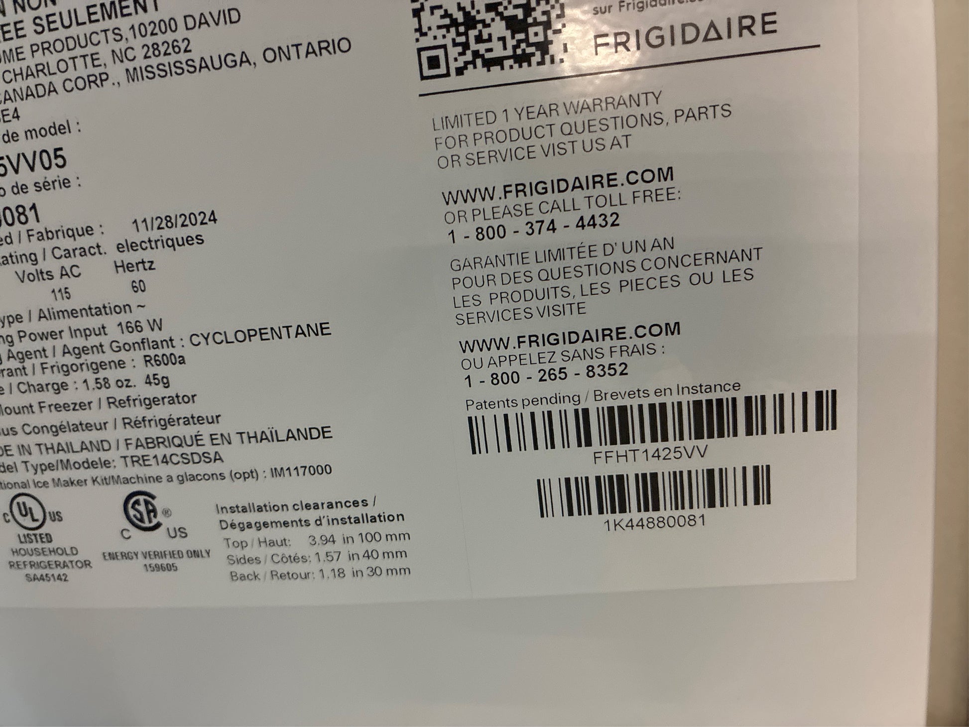 The Frigidaire 13.9 cu. ft. Top Freezer Refrigerator features 2 full-width glass shelves, a humidity-controlled crisper drawer for storing fruits and vegetables, and flexible sliding deli for meats and cheeses. Equipped with bright LED lighting to keep contents clearly visible, the refrigerator is easy to control with a single temperature knob inside. The freezer compartment offers a full-width glass shelf for flexible storage options as well as two full-width door racks to house additional frozen food.. Appliance Category: Refrigerator. Appliance Series: Not Applicable. Appliance Type: Top Freezer Refrigerator. Built-In and Standard Type: Top Freezer. Color - Appliance Cabinet: Gray. Color - Door Handle(s): Gray. Color/Finish: Brushed Steel. Color/Finish Family: Stainless Look. Defrost Type: Frost Free. Dispenser Location: No Dispenser. Door Finish: Smooth. Energy Consumption (kWh/year): 322. Energy Efficiency Tier Rating: Tier III. Freezer Capacity (cu. ft.): 3.9 cu ft. Freezer Door Type: Swing Door. Freezer Features: Adjustable Temperature Control,In-door Storage. Freezer Type: Top Door Freezer. General Features: Flat-back Design,LED Light Type,Self-Closing Door. Handle Type: Recessed Handle. Hardware Color/Finish: White. Hardware Color/Finish Family: White. Ice Maker Features: No Ice Maker. Ice/Water Dispenser: None. Indoor/Outdoor: Indoor. Installation Depth: Counter Depth. Installation Type: Free Standing. Number of Doors: 2 Door. Number of Freezer Baskets/Bins: 2 Baskets/Bins. Number of Freezer Shelves: 1 Shelf. Number of Refrigerator Shelves: 3 Shelves. Operational Features: Humidity Controlled Crisper,Self-Closing Door. Overall Product Height (in.): 60.5 in.. Product Weight (lb.): 135 lb. Refrigeration Dispenser Features: No Dispenser. Refrigerator Capacity (cu. ft.): 10 cu ft. Returnable: Non-Returnable. Shelf Material - Freezer: Glass. Shelf Material - Refrigerator: Glass. Storage Features: Adjustable Shelves/Racks,Crisper Drawer,Deli Drawer,Gallon Door Storage. Temperature Control Type: Internal Analog. Total Capacity (cu. ft.): 13.9 cu ft. Water Filter Replacement Model#: N/A. Certifications and Listings: ADA Compliant,UL Listed. Depth (Excluding Handles) (in.): 31.25 in. Depth (Including Handles) (in.): 31.25 in. Depth (Less Door) (in.): 25.25. Depth With Door Open 90 Degrees (in.): 54. Height to Top of Door Hinge (in.): 60.5 in. Height to Top of Refrigerator Case (in.): 59.875 in. Product Depth (in.): 29.375 in. Product Height (in.): 60.5 in. Product Width (in.): 27.625 in. Refrigerator Width (in.): 27.625 in. Total Capacity (cu. ft.): 13.9 cu ft. Depth (Excluding Handles) (in.): 31.25 in. Height to Top (in.): 59.875 in. Overall Product Height (in.): 60.5 in.. Height to Top of Door Hinge (in.): 60.5 in. Ice Maker Features: No Ice Maker. Installation Depth: Counter Depth. Refrigerator Capacity (cu. ft.): 10 cu ft