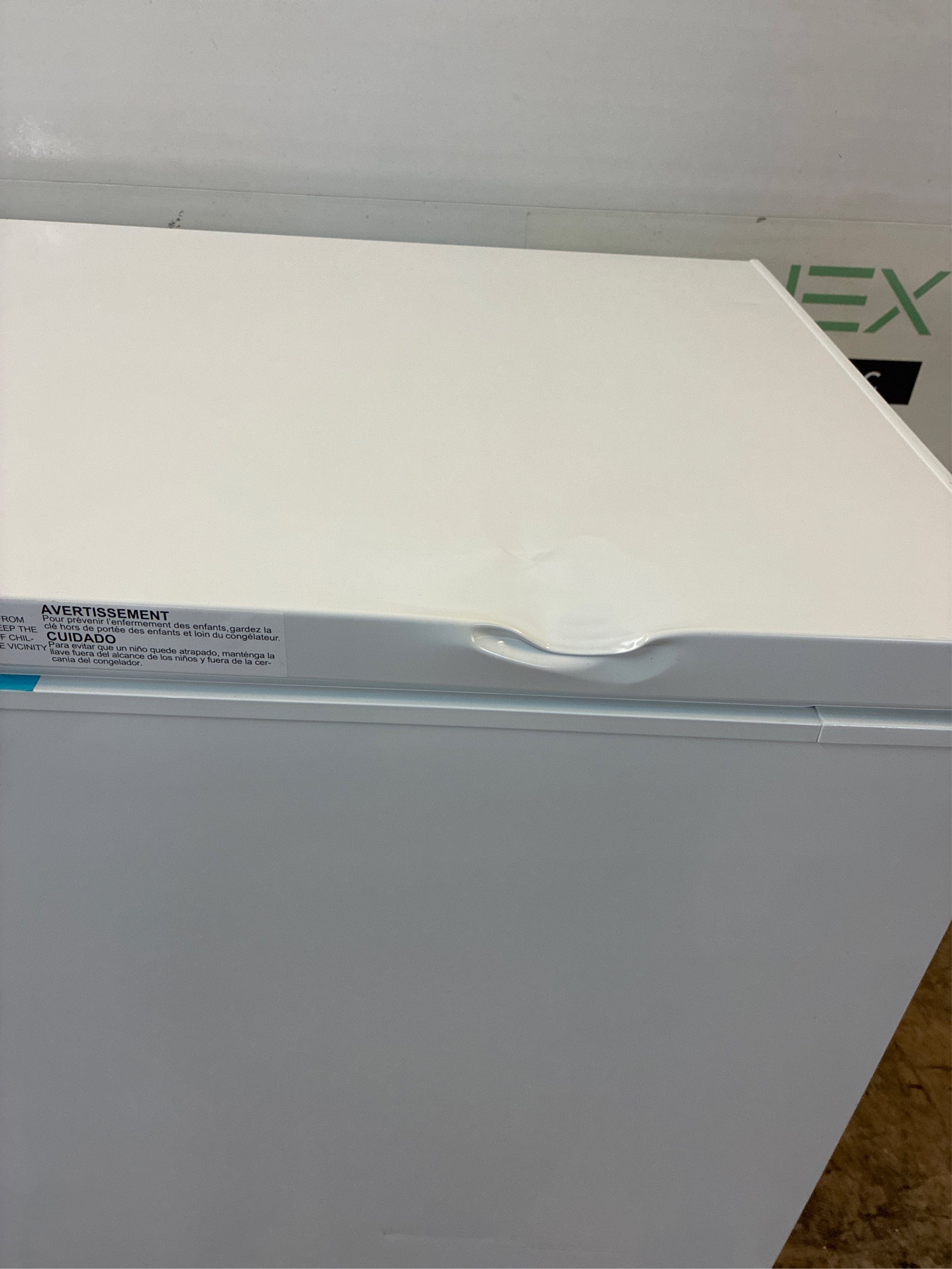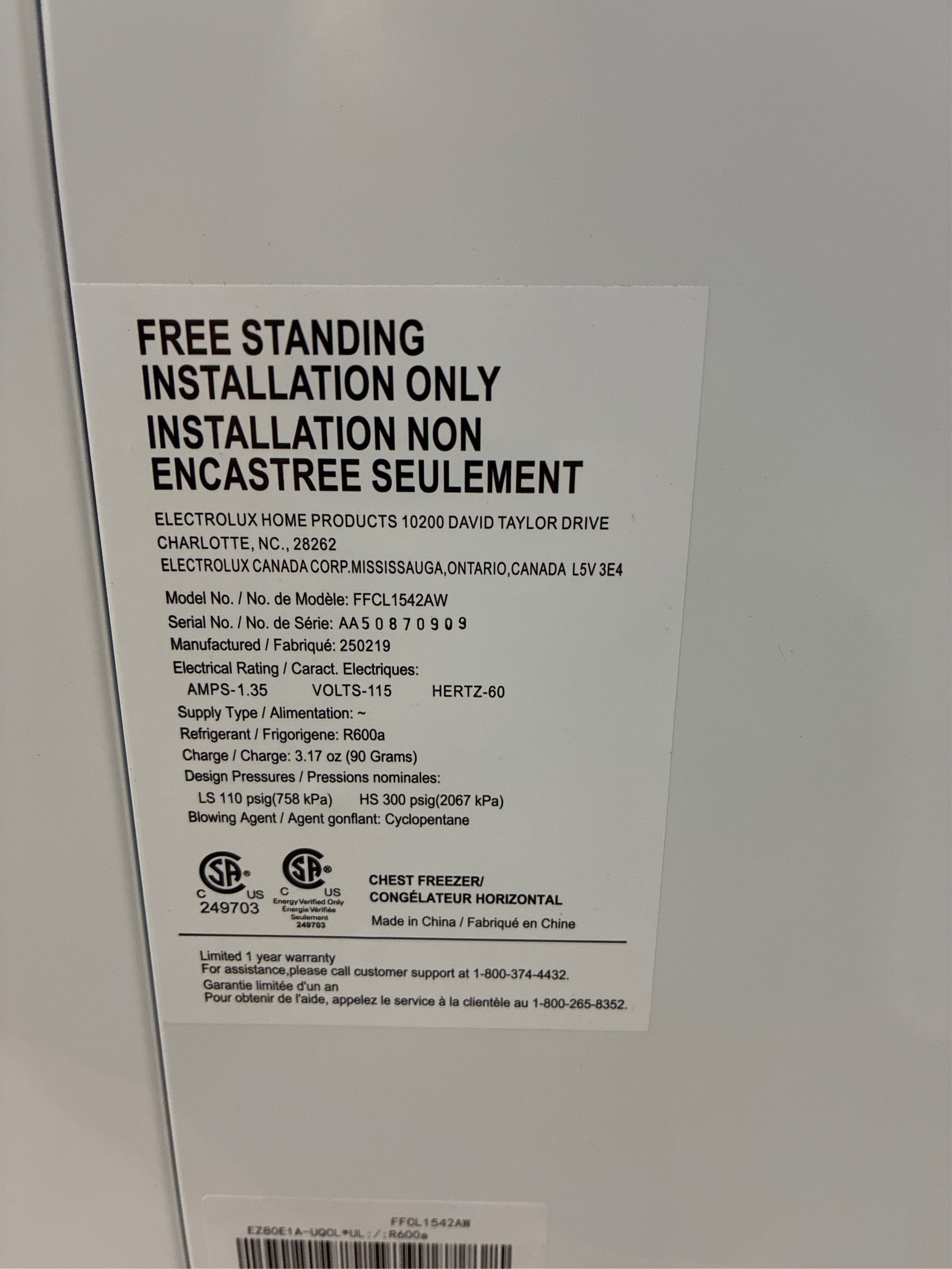 The Frigidaire 14.8 cu. ft. Chest Freezer with Adjustable Temperature Control allows you to select the correct temperature for your needs. Know at a glance that your freezer is working with Power-On Indicator Light. Also features lock with pop-out key that automatically ejects after locking the door so you won't leave it in the door.. Appliance Series: Not Applicable. Appliance Type: Chest Freezer. Bulk Storage Baskets (number): 2. Capacity (cu. ft.) - Freezer: 14.8 cu ft. Color/Finish: White. Color/Finish Family: White. Control Type: Manual. Defrost Type: Manual. Energy Consumption (kWh/year): 296. Freezer Features: LED Light Type,Lift-Out Bulk Storage Baskets. Freezer Type: Chest. Hardware Color/Finish: White. Hardware Color/Finish Family: White. Minimum Back Air Clearance (In): 3. Product Weight (lb.): 137 lb. Returnable: Non-Returnable. Temperature Range: 10 to -10 degrees. Voltage (V): 110 V. Certifications and Listings: CSA Listed. Height With Lid Open 90 Degrees (In): 59.875. Minimum Side Air Clearance (In): 3. Product Depth (in.): 29.563 in. Product Height (in.): 32.5 in. Product Width (in.): 55.75 in. Capacity (cu. ft.): 14.8 cu ft. Capacity (cu. ft.) - Freezer: 14.8 cu ft. Freezer Features: Lift-Out Bulk Storage Baskets. Defrost Type: Manual. Freezer Features: LED Light Type. Width (in.): 55.75 in. Appliance Type: Chest Freezer. Voltage (V): 110 V