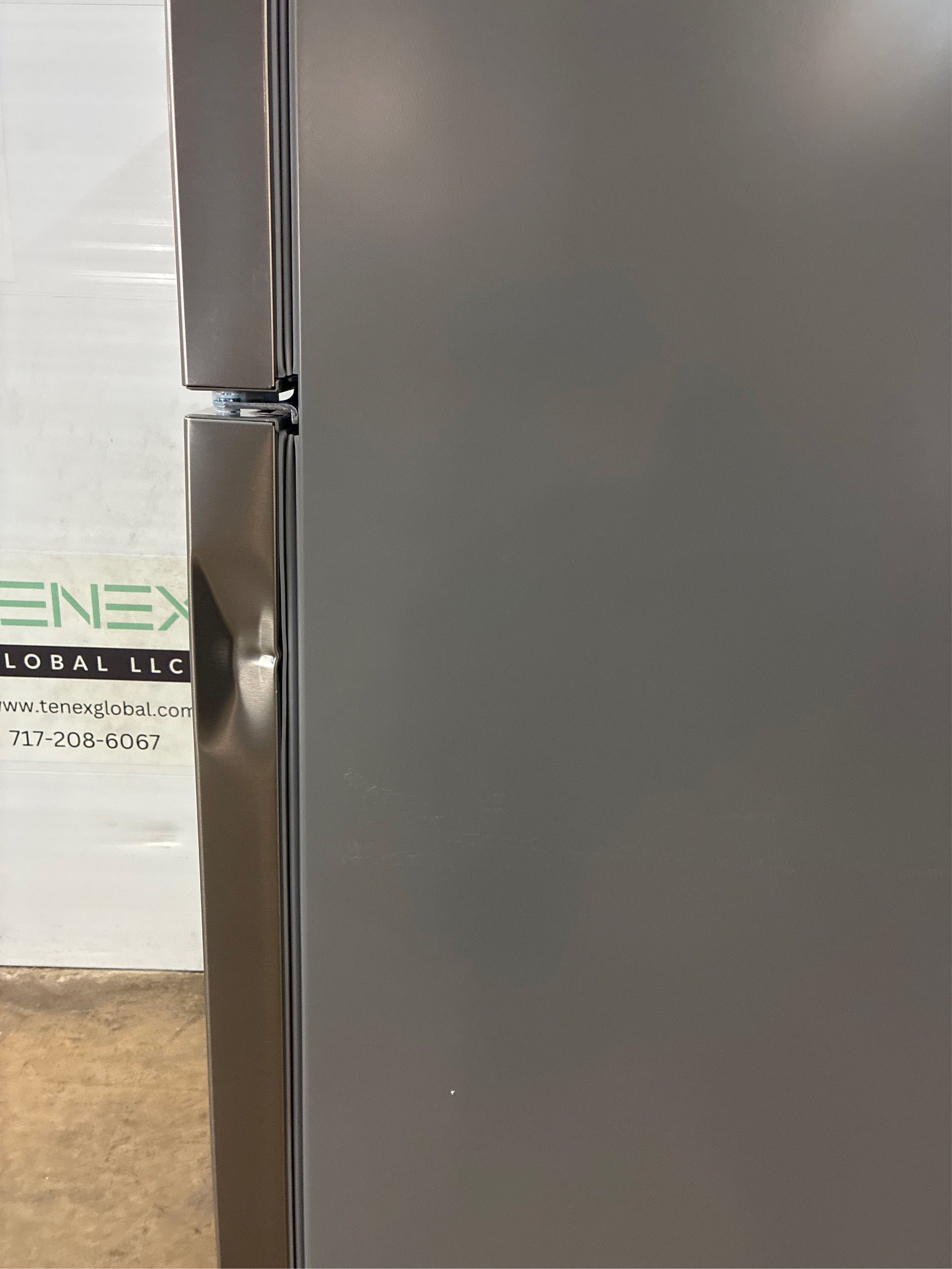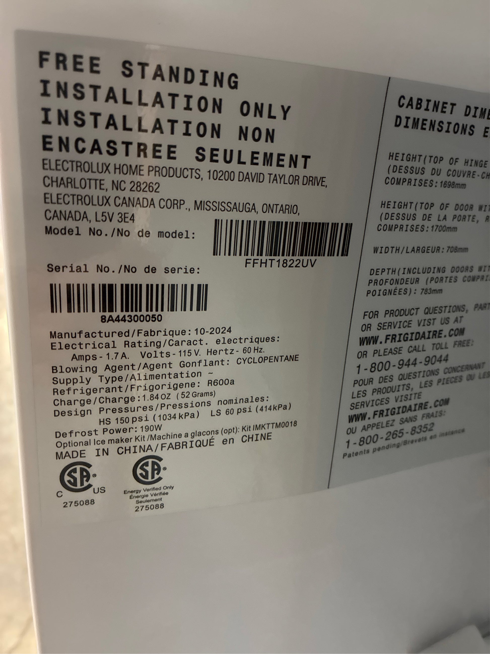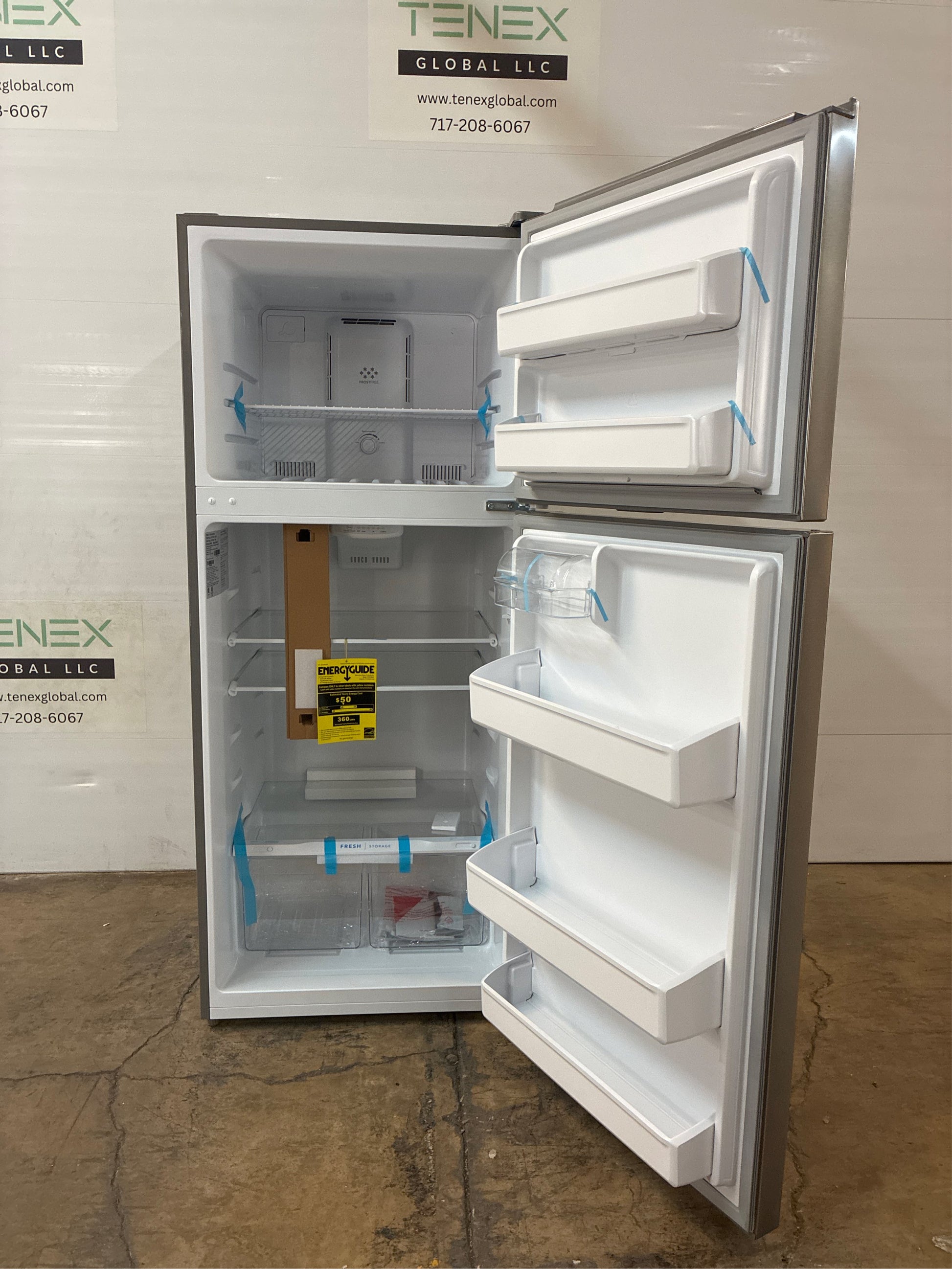 This Frigidaire 18 cubic foot top freezer refrigerator includes spacious interior storage options designed for busy families, including two edge-to-edge glass shelves, gallon door bins, full-width wire freezer shelf, and a dairy bin. Our humidity-controlled crispers keep produce fresh for longer, allowing you to waste less and save money. Additionally, the bright LED lighting makes it easier to see what's inside.. Appliance Category: Refrigerator. Appliance Series: Not Applicable. Appliance Type: Top Freezer Refrigerator. Built-In and Standard Type: Top Freezer. Color - Appliance Cabinet: Gray. Color - Door Handle(s): N/A. Color/Finish: Brushed Steel. Color/Finish Family: Stainless Steel. Defrost Type: Auto / Cycle. Dispenser Location: No Dispenser. Door Finish: Smooth. Energy Consumption (kWh/year): 360. Energy Efficiency Tier Rating: Not CEE rated. Freezer Capacity (cu. ft.): 4.3 cu ft. Freezer Door Type: Swing Door. Freezer Features: In-door Storage. Freezer Type: Top Door Freezer. General Features: Door Alarm,Interior Light,LED Light Type,Reversible Door Hinge. Handle Type: Recessed Handle. Hardware Color/Finish: Stainless Steel. Hardware Color/Finish Family: Stainless. Ice Maker Features: No Ice Maker. Ice/Water Dispenser: None. Indoor/Outdoor: Indoor. Installation Depth: Counter Depth. Installation Type: Free Standing. Number of Doors: 2 Door. Number of Freezer Baskets/Bins: 2 Baskets/Bins. Number of Freezer Shelves: 1 Shelf. Number of Refrigerator Shelves: 3 Shelves. Operational Features: Humidity Controlled Crisper. Overall Product Height (in.): 67 in. Product Weight (lb.): 158 lb. Refrigeration Dispenser Features: No Dispenser. Refrigerator Capacity (cu. ft.): 13.3 cu ft. Returnable: Non-Returnable. Shelf Material - Freezer: Wire. Shelf Material - Refrigerator: Glass. Storage Features: Adjustable Door Storage,Adjustable Shelves/Racks,Crisper Drawer,Gallon Door Storage. Temperature Control Type: Internal Digital. Total Capacity (cu. ft.): 17.6 cu ft. Water Filter Replacement Model#: N/A. Certifications and Listings: ADA Compliant,CSA Listed,Energy Star. Depth (Excluding Handles) (in.): 30.8 in. Depth (Including Handles) (in.): 30.8 in. Depth (Less Door) (in.): 27.6 in. Depth With Door Open 90 Degrees (in.): 56.5 in. Height to Top of Door Hinge (in.): 66.9375 in. Height to Top of Refrigerator Case (in.): 66.2 in. Height to Top of Refrigerator Door (in.): 66.2 in. Product Depth (in.): 30.8 in. Product Height (in.): 66.9375 in. Product Width (in.): 27.875 in. Refrigerator Width (in.): 27.875 in. Total Capacity (cu. ft.): 17.6 cu ft. Depth (Excluding Handles) (in.): 30.8 in. Height to Top (in.): 66.2 in. Overall Product Height (in.): 67 in. Ice Maker Features: No Ice Maker. Height to Top of Door Hinge (in.): 66.9375 in. Installation Depth: Counter Depth. Features: Reversible Door Hinge
