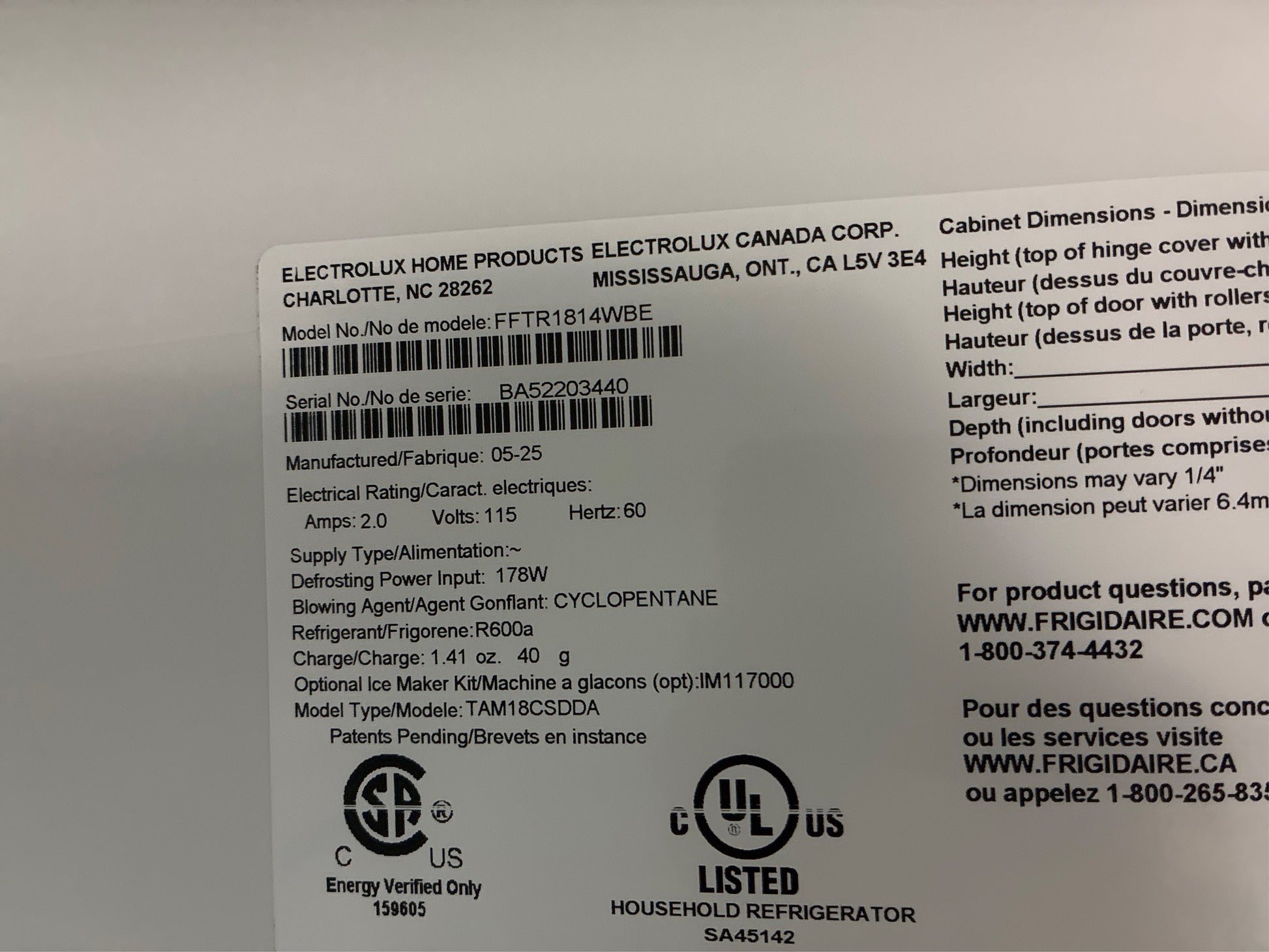 18 cu. ft. wire and glass top freezer refrigerators. Timeless style meets the latest in cooling technology, innovative storage solutions, and precision temperature control. Equipped with bright lighting to keep contents clearly visible.. Appliance Category: Refrigerator. Appliance Series: Not Applicable. Appliance Type: Top Freezer Refrigerator. Built-In and Standard Type: Top Freezer. Color - Appliance Cabinet: Black. Color - Door Handle(s): Black. Color/Finish: Black. Color/Finish Family: Black. Defrost Type: Frost Free. Dispenser Location: No Dispenser. Door Finish: Textured. Energy Consumption (kWh/year): 410. Energy Efficiency Tier Rating: Not CEE rated. Freezer Capacity (cu. ft.): 4.9 cu ft. Freezer Door Type: Swing Door. Freezer Features: Adjustable Leveling Legs,In-door Storage. Freezer Type: Top Door Freezer. General Features: Incandescent Light Type. Handle Type: Recessed Handle. Hardware Color/Finish: White. Hardware Color/Finish Family: White. Ice Maker Features: No Ice Maker. Ice/Water Dispenser: None. Indoor/Outdoor: Indoor. Installation Depth: Counter Depth. Installation Type: Free Standing. Number of Doors: 2 Door. Number of Freezer Baskets/Bins: No Baskets/Bins. Number of Freezer Shelves: 1 Shelf. Number of Refrigerator Shelves: 2 Shelves. Operational Features: Humidity Controlled Crisper. Overall Product Height (in.): 66 in. Product Weight (lb.): 153 lb. Refrigeration Dispenser Features: No Dispenser. Refrigerator Capacity (cu. ft.): 13.4 cu ft. Returnable: Non-Returnable. Shelf Material - Freezer: Wire. Shelf Material - Refrigerator: Wire. Storage Features: Gallon Door Storage,Slide-Out Fresh Food Shelves. Temperature Control Type: Internal Analog. Total Capacity (cu. ft.): 18.3 cu ft. Water Filter Replacement Model#: NA. Certifications and Listings: ADA Compliant,CSA Listed,UL Listed. Depth (Excluding Handles) (in.): 30.375 in. Depth (Including Handles) (in.): 30.375 in. Depth (Less Door) (in.): 26.625 in. Depth With Door Open 90 Degrees (in.): 57 in. Height to Top of Door Hinge (in.): 66.375 in. Height to Top of Refrigerator Case (in.): 65.875 in. Product Depth (in.): 30.375 in. Product Height (in.): 66.375 in. Product Width (in.): 30 in. Refrigerator Width (in.): 30 in. Total Capacity (cu. ft.): 18.3 cu ft. Depth (Excluding Handles) (in.): 30.375 in. Height to Top (in.): 65.875 in. Overall Product Height (in.): 66 in. Ice Maker Features: No Ice Maker. Height to Top of Door Hinge (in.): 66.375 in. Installation Depth: Counter Depth. Refrigerator Capacity (cu. ft.): 13.4 cu ft