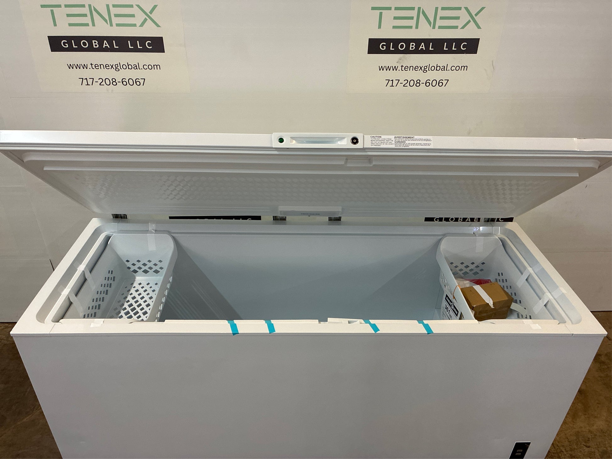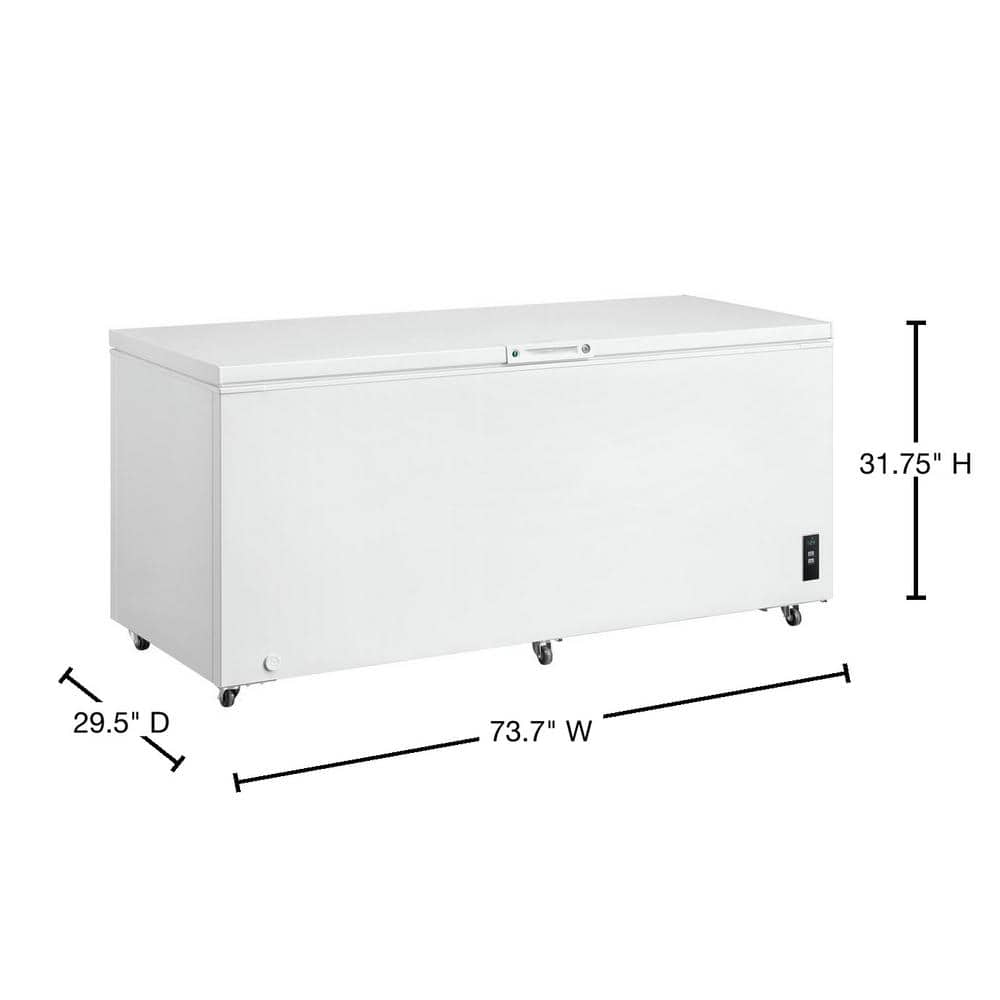 The Frigidaire 19.8 cu. ft. Chest Freezer offers more storage so you can stock up on frozen foods. Take organization to the next level with our heavy-duty sliding plastic basket with color-coordinated clips that Snap-On and can be used to organize items by categories or purchase date so items are much easier to find, and the Exterior Dial Temperature Control is easy to reach and operate. Bright lighting makes it easy to see what's inside.. Appliance Series: Not Applicable. Appliance Type: Chest Freezer. Bulk Storage Baskets (number): 2. Capacity (cu. ft.) - Freezer: 19.8 cu ft. Color/Finish: White. Color/Finish Family: White. Control Type: Digital. Defrost Type: Manual. Energy Consumption (kWh/year): 361. Freezer Features: Adjustable Temperature Control,Drain,LED Light Type,Power On Light Indicator,Safety Lock,Sliding-Bulk Storage Baskets. Freezer Type: Chest. Hardware Color/Finish: White. Hardware Color/Finish Family: White. Minimum Back Air Clearance (In): 27.5. Product Weight (lb.): 181 lb. Returnable: Non-Returnable. Temperature Range: 10 -10. Voltage (V): 115 V. Certifications and Listings: CSA Certified. Height With Lid Open 90 Degrees (In): 59.125. Minimum Side Air Clearance (In): 7.87. Product Depth (in.): 29.5 in. Product Height (in.): 31.75 in. Product Width (in.): 73.7 in. Capacity (cu. ft.): 19.8 cu ft. Capacity (cu. ft.) - Freezer: 19.8 cu ft. Freezer Features: Drain. Freezer Features: Adjustable Temperature Control. Freezer Features: Power On Light Indicator. Freezer Features: Sliding-Bulk Storage Baskets. Defrost Type: Manual. Freezer Features: LED Light Type