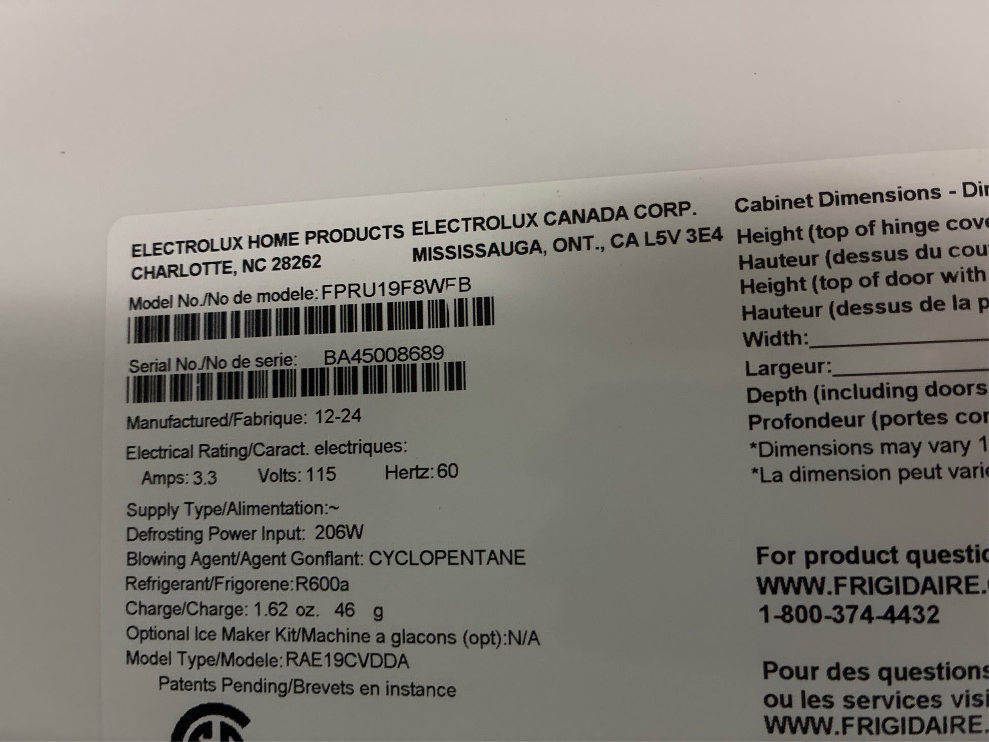 Model: FPRU19F8WF