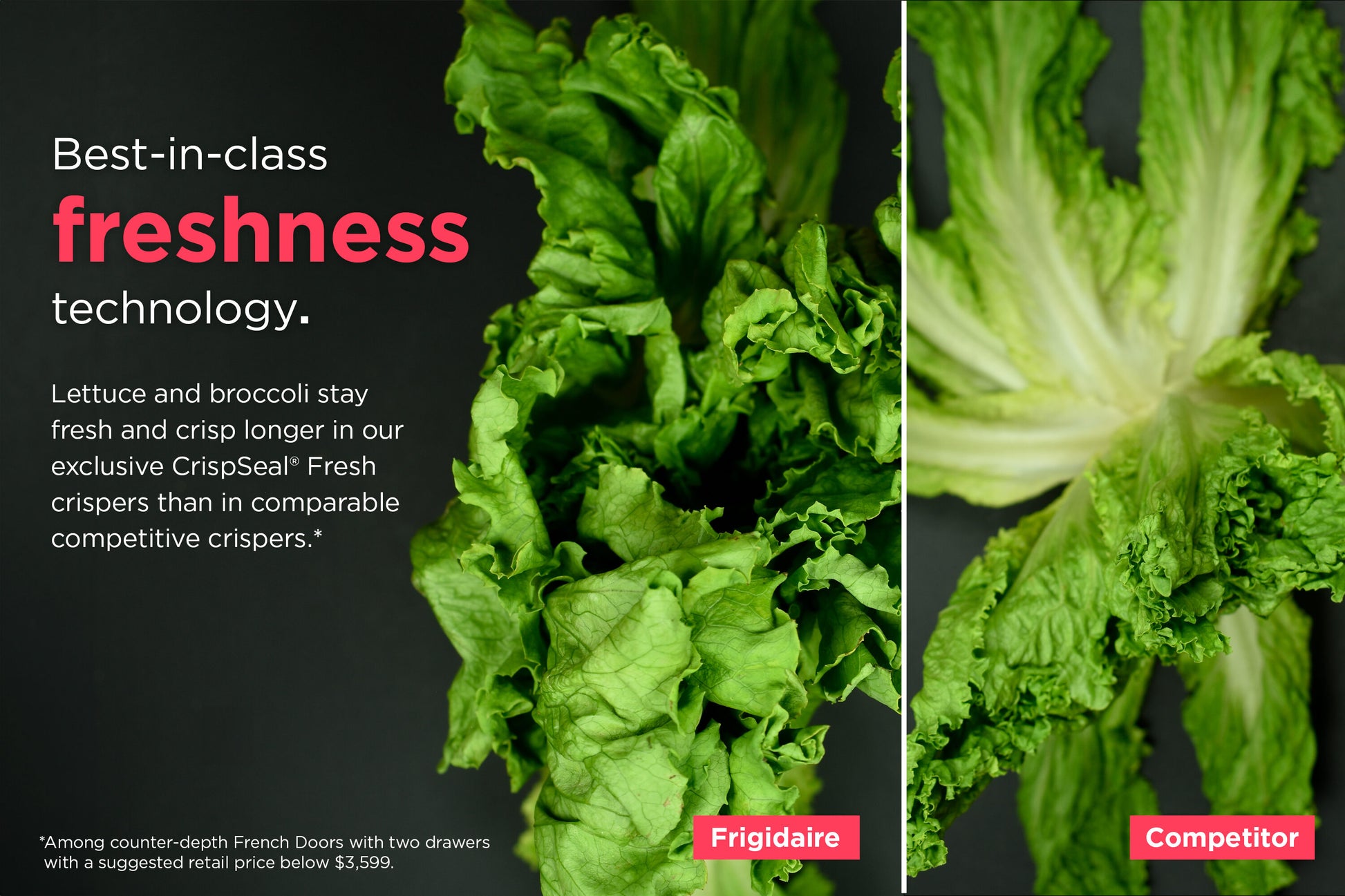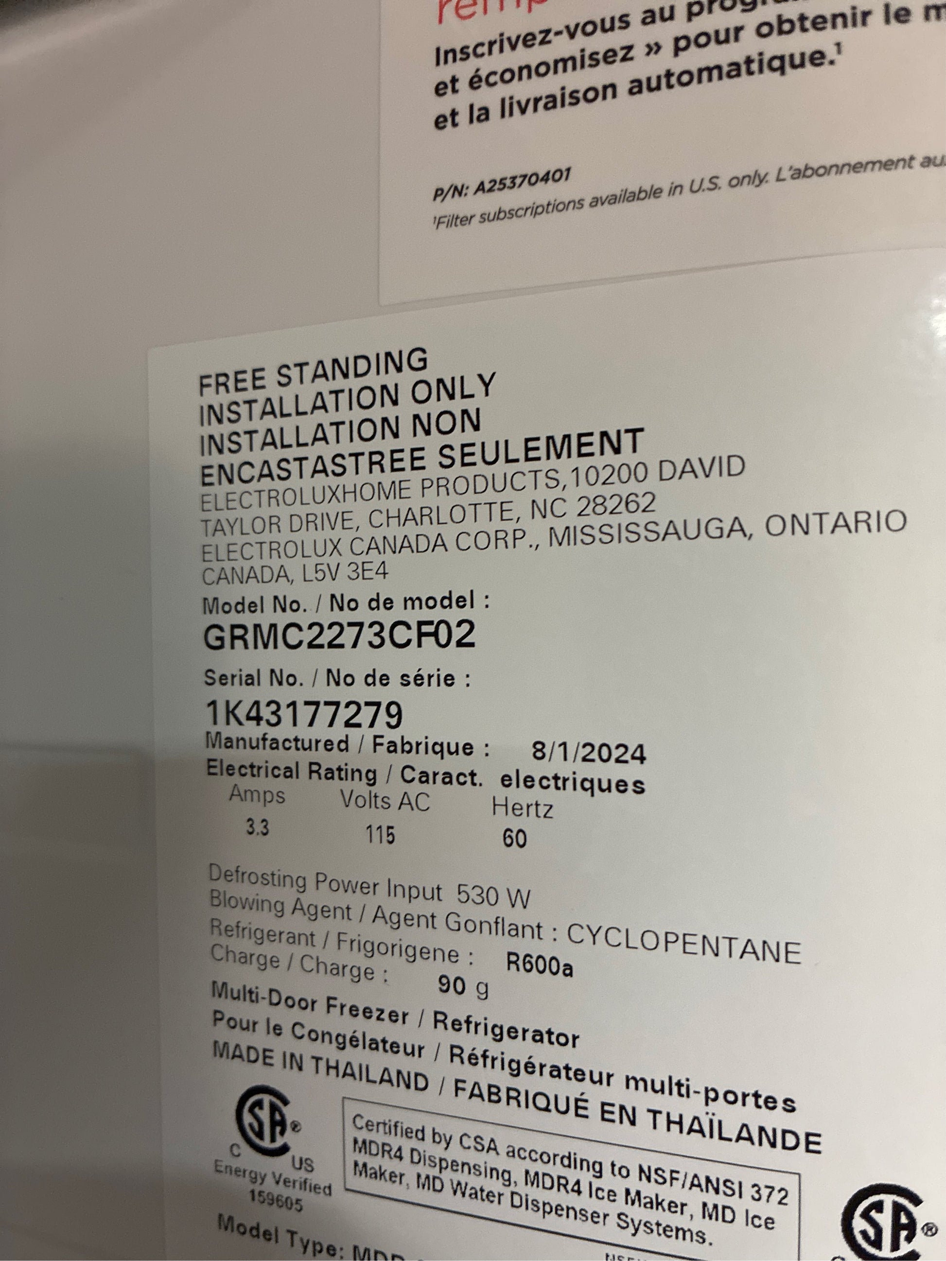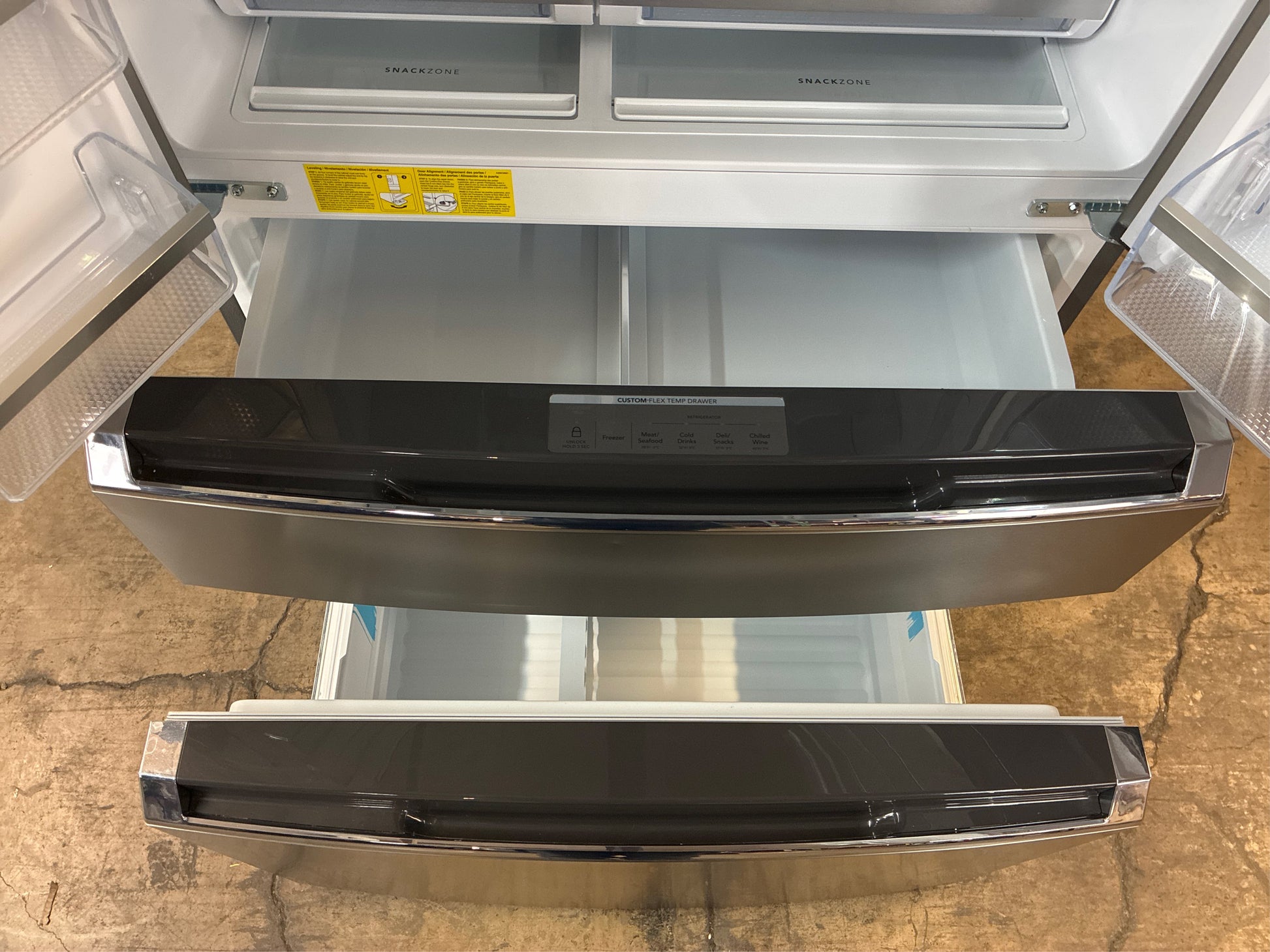 This Frigidaire Gallery French door refrigerator maintains the taste and texture of even your most delicate foods. Lettuce and broccoli stay fresh and crisp for longer in our exclusive CrispSeal fresh crispers than in any comparable crispers. Our 3 advanced technologies block out dry air, automatically optimize humidity while removing excess moisture, and our built-in antioxidant filter reduces ethylene gas, odors and preserves produce color. Get more storage out of your refrigerator with clever organization solutions that maximize usable space, including in-door condiment storage, a slide-under shelf, a snack zone, a flexible bin which can be used as crisper or an open compartment, and accessory railing system which works with our optional storage pan and wine rack. Get extra space for all your most used items with the custom-flex temp drawer. Store yogurt, beer, or even frozen pizzas with the middle drawer that can be a refrigerator or a freezer. Awarded Editor's Choice French Door Refrigerator of 2023 by Reviewed.com (USA Today). Crispers keep produce fresh with 3 advanced technologies Maximize usable space with our clever organization system Switch from fridge to freezer with the Custom-Flex Temp Drawer Packed with technologies that reduce food waste and energy consumption, our refrigerator is a smart option for the environment and your wallet Keep safer, great tasting water flowing and reduce up to 99% of contaminants while cutting back on plastic and the cost of bottled water with our water filter Our cooling system ensures temperature and airflow distribution is even, minimizing common issues, such as freezer burn and warm spots Save money and maximize energy efficiency with ENERGY STAR certification Easily access your favorites - reach up to 75% of your food with only one door open Smudge-Proof Stainless Steel resists fingerprints and cleans easily Appliance Color/Finish: Stainless steel Cabinet Color: Gray Handle Color: Stainless steel Manufacturer Color/Finish: Smudge-Proof Stainless Steel Toe Grille Color: Stainless steel Appliance Type: French door refrigerator Actual Width (Inches): 35.9 Common Width (Inches): 36 Popular Widths: 36-in Depth (Excluding Handles) (Inches): 29.5 Depth (Including Handles) (Inches): 32 Depth (Less Door) (Inches): 24.6 Depth Type: Counter-Depth Depth with Door Open (Inches): 46.9 Height to Top of Case (Inches): 70 Height to Top of Door (Inches): 70 Height to Top of Door Hinge (Inches): 70.16 Overall Capacity (Cu. Feet): 21.5 Refrigerator Capacity (Cu. Feet): 13.1 Freezer Capacity (Cu. Feet): 5.8 Refrigerator Size: Medium (33 - 36-in) Weight (lbs.): 313 Ice and Water Dispensers: Both Ice/Water Location: External dispenser Ice Maker: Single Ice Type: Cubed/Crushed Space-Saving In-Door Ice: No Water Filtration: Yes Water Filter Indicator: Yes Matching Replacement Water Filter Model: FPPWFU02 Freezer Door Style: Pull-out drawer Freezer Door Bins: 1 Freezer Baskets: 1 Freezer Drawers: 2 Freezer Shelves: 1 Freezer Light: Yes Frost-Free: Yes Reversible Freezer Door: No ADA Compliant: No Air Filtration: Yes Built-In: No Bulb Type: LED Child Safety Locks: Yes Customizable: No Dispenser Light: Yes Door Alarm: Yes Door Shelves: 7 Door Style: Flat Door Texture: Smooth Door within Door: No Dual Evaporator Cooling System: Yes Electronic Temperature Control: Yes Fingerprint-Resistant: Yes Gallon Door Storage: Yes Garage Ready: No Handle Type: Standard Hidden Hinge: Yes Hub Required: No Humidity-Controlled Crispers: 2 LED Light: Yes Lowe's Exclusive: No Number of Doors: 4 Panel Ready: No Pantry Drawer: Temperature-controlled Professional: No Refrigerator Interior Lighting: LED See-Thru Door: No Shelf Options: Adjustable glass shelves Snack/Deli Drawer: No Temperature Controlled Drawer: Yes Voice Controlled: No App Compatibility: No Bluetooth Compatibility: No Custom Door Kit Compatible: No Matching Air Filter (Model #): FRGPAAF2 Smart Compatible: No Wi-Fi Compatibility: No Works with Amazon Alexa: No Works with Android: No Works with Apple HomeKit: No Works with iOS: No Works with SmartThings: No Works with Sonos: No Works with the Google Assistant: No Approved for Outdoor Use: No CA Residents: Prop 65 Warning(s): Yes ENERGY STAR Certified: Yes Safety Listing: CSA safety listing UNSPSC: 52141500