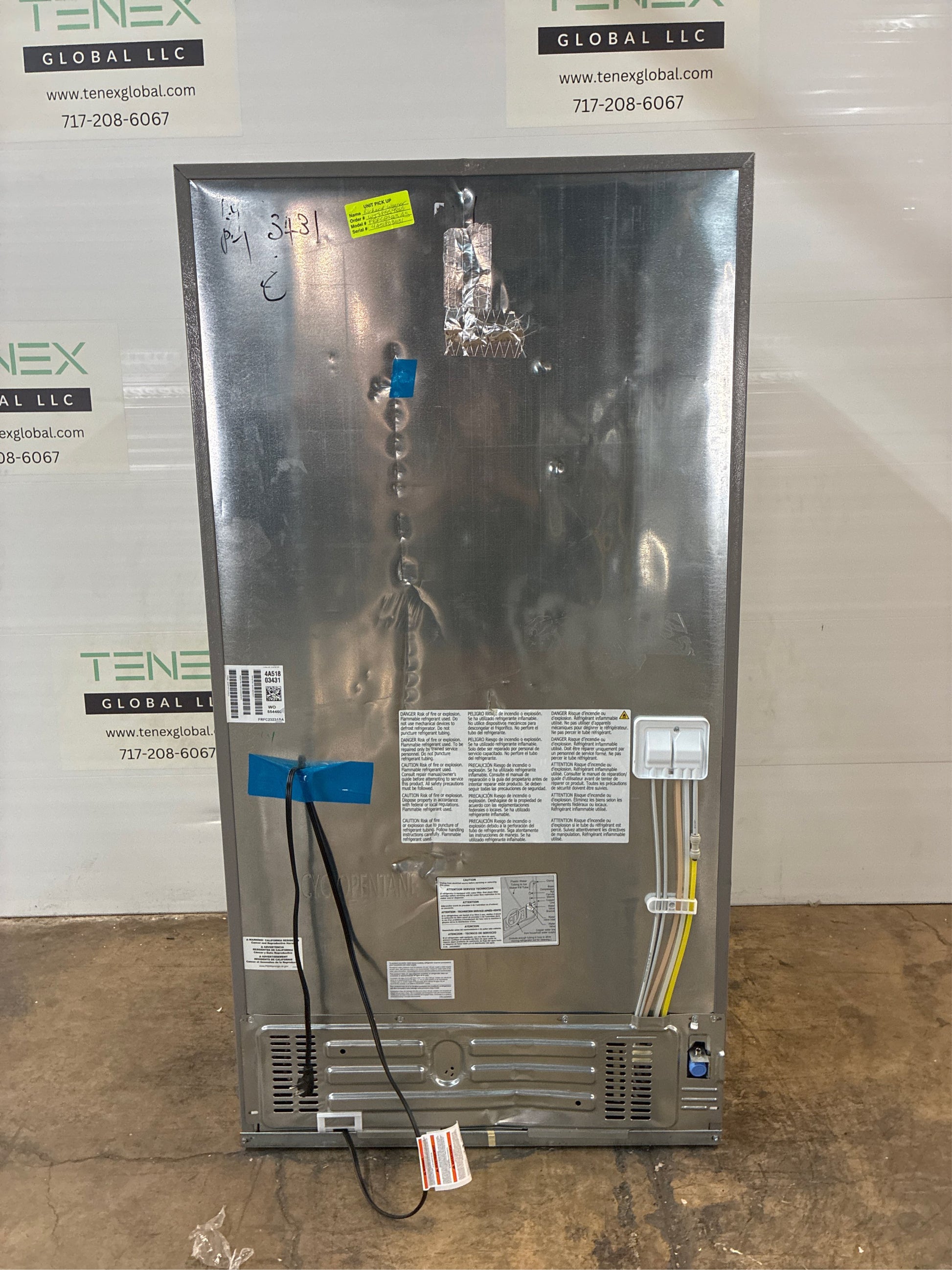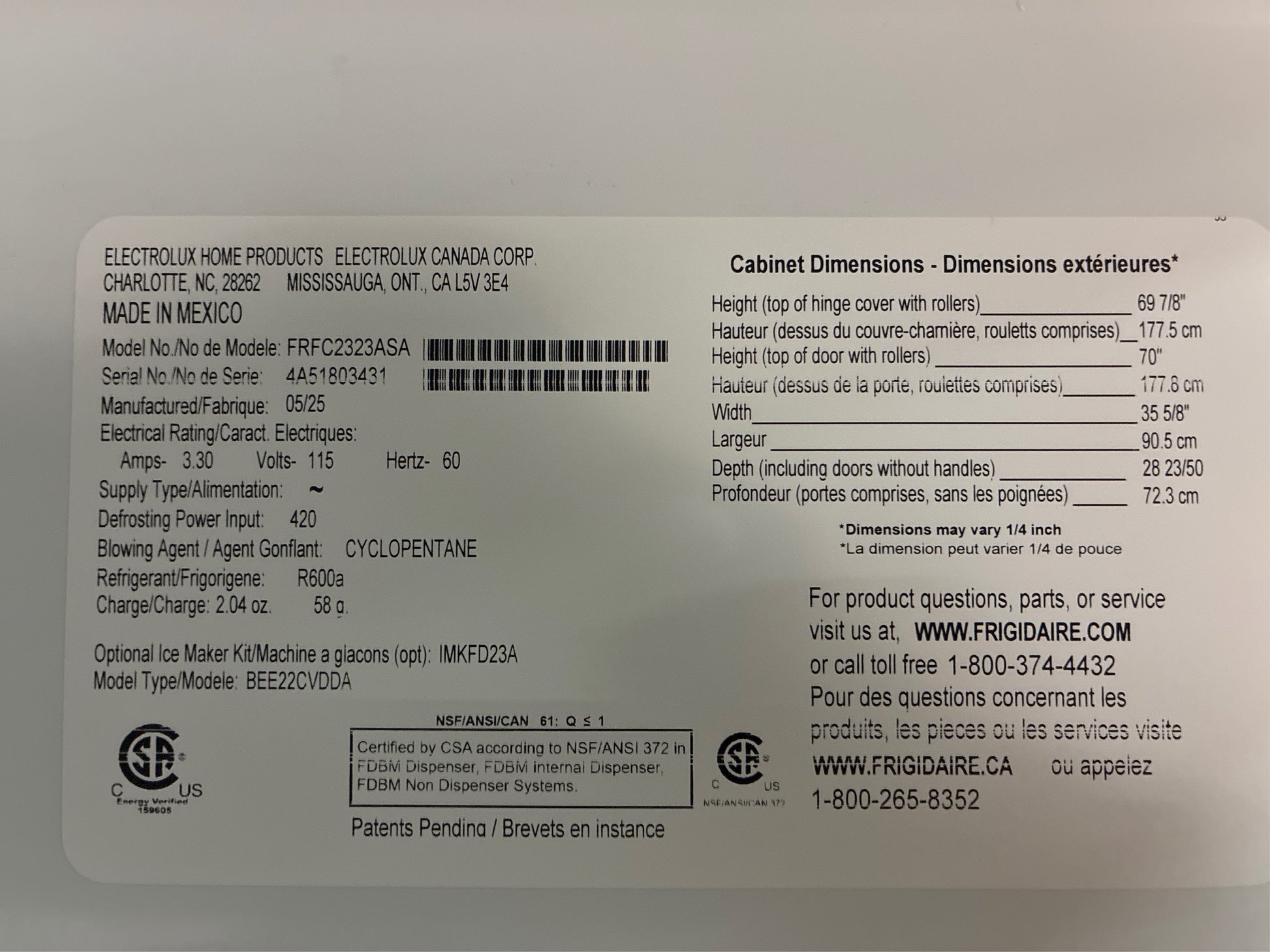 This Frigidaire French door refrigerator helps keep fruits and vegetables fresh longer with CrispSeal crispers which blocks dry air from entering your crisper. Easily stay organized with a full width deli drawer and Large door bin storage. Keep safe, great tasting water flowing. Our filter reduces up to 99% of contaminants, cuts back on plastic and saves the cost of bottled water. NSF and WQA certified.. Appliance Category: Refrigerator. Appliance Series: Not Applicable. Appliance Type: French Door Refrigerator. Built-In and Standard Type: French Door. Color - Appliance Cabinet: Stainless Look. Color - Door Handle(s): Stainless Steel. Color/Finish: Stainless Steel. Color/Finish Family: Stainless Steel. Defrost Type: Frost Free. Dispenser Location: External Ice Dispenser,External Water Dispenser. Door Finish: Smooth. Energy Consumption (kWh/year): 670. Energy Efficiency Tier Rating: Not CEE rated. Freezer Capacity (cu. ft.): 7.1 cu ft. Freezer Door Type: Pull Out Drawer. Freezer Features: Adjustable Temperature Control,LED Light Type,Open Door Alarm. Freezer Type: Drawer Freezer. General Features: Child Lock,Digital Temperature Control,Door Alarm,LED Light Type,Wheels. Handle Type: Bar Handle. Hardware Color/Finish: White. Hardware Color/Finish Family: White. Ice Maker Features: Ice Maker. Ice/Water Dispenser: Both. Indoor/Outdoor: Indoor. Installation Depth: Counter Depth. Installation Type: Free Standing. Number of Doors: 3 Door. Number of Drawers: Single Drawer. Number of Freezer Baskets/Bins: 1 Basket/Bin. Number of Freezer Shelves: 1 Shelf. Number of Refrigerator Shelves: 3 Shelves. Operational Features: Fresh Air Filter,Humidity Control,Sabbath Mode,Self-Closing Door. Overall Product Height (in.): 70 in. Product Weight (lb.): 334 lb. Refrigeration Dispenser Features: Crushed Ice,Cubed Ice,Dispenser Control Lock-Out,Filtration Replacement Indicator Light,Water Dispenser,Water Filtration. Refrigerator Capacity (cu. ft.): 15.5 cu ft. Returnable: Non-Returnable. Shelf Material - Freezer: Glass. Shelf Material - Refrigerator: Glass. Storage Features: Adjustable Door Storage,Adjustable Shelves/Racks,Crisper Drawer,Deli Drawer,Gallon Door Storage. Temperature Control Type: External Digital. Total Capacity (cu. ft.): 22.6 cu ft. Water Filter Replacement Model#: FPPWFU01. Certifications and Listings: CSA Listed,Energy Star. Depth (Excluding Handles) (in.): 28.5 in. Depth (Including Handles) (in.): 30.8 in. Depth (Less Door) (in.): 23.6 in. Depth With Door Open 90 Degrees (in.): 42.6 in. Height to Top of Door Hinge (in.): 70 in. Height to Top of Refrigerator Case (in.): 68.3 in. Height to Top of Refrigerator Door (in.): 70 in. Product Depth (in.): 30.8 in. Product Height (in.): 70 in. Product Width (in.): 36 in. Refrigerator Width (in.): 36 in. Depth (Excluding Handles) (in.): 28.5 in. Installation Depth: Counter Depth. Total Capacity (cu. ft.): 22.6 cu ft. Overall Product Height (in.): 70 in. Dispenser Features: Water Dispenser. Dispenser Features: Cubed Ice. Height to Top (in.): 68.3 in. Dispenser Features: Crushed Ice