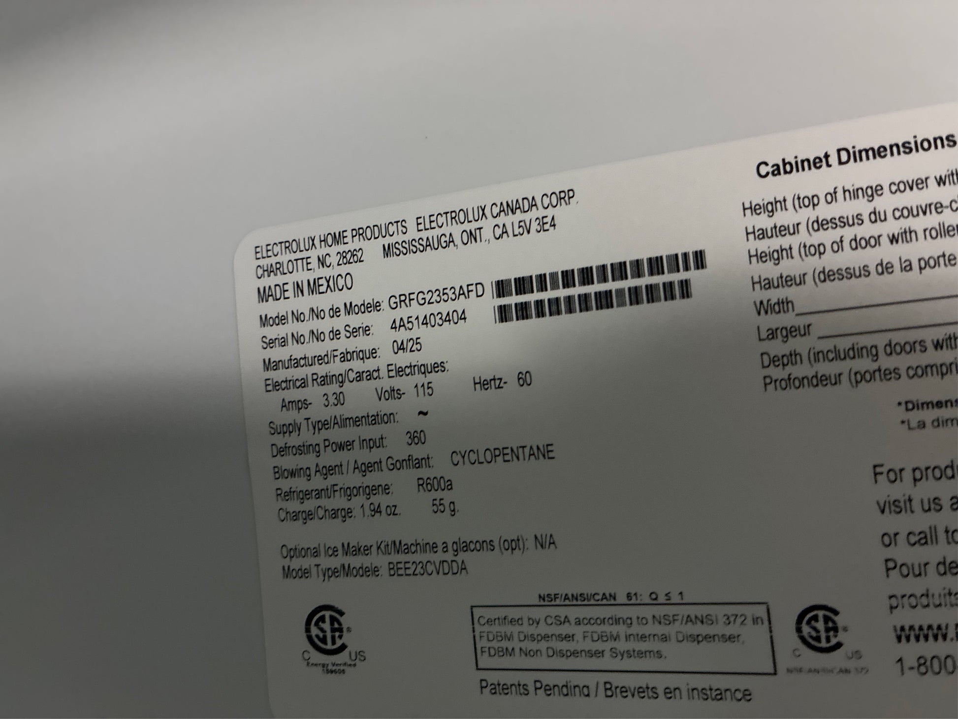 This FRIGIDAIRE GALLERY French door refrigerator offers a freshness system that maintains the taste and texture of even your most delicate foods. Our freshness system is packed with technologies that keep food fresh and reduce food waste, such as our cooling system, advanced crispers, and our genuine air and water filtration. Get more storage out of your refrigerator with clever organization solutions that maximize usable space, including in-door condiment storage, slide under shelf and accessory railing system.. Appliance Category: Refrigerator. Appliance Series: Frigidaire Gallery. Appliance Type: French Door Refrigerator. Built-In and Standard Type: French Door. Color - Appliance Cabinet: Stainless. Color - Door Handle(s): Stainless Steel. Color/Finish: Smudge-Proof Stainless Steel. Color/Finish Family: Stainless Steel. Defrost Type: Auto / Cycle. Dispenser Location: Internal Water Dispenser. Door Finish: Smooth. Energy Consumption (kWh/year): 598. Energy Efficiency Tier Rating: Tier I. Freezer Capacity (cu. ft.): 7.1 cu ft. Freezer Door Type: Pull Out Drawer. Freezer Features: Adjustable Leveling Legs,Garage Ready Freezer,LED Light Type,Lift-Out Bulk Storage Baskets. Freezer Type: Drawer Freezer. General Features: Door Alarm,Hidden Hinge,LED Light Type. Handle Type: Bar Handle. Hardware Color/Finish: Stainless Steel. Hardware Color/Finish Family: Stainless. Ice Maker Features: Filtered Ice,Ice Maker,Removable Basket. Ice/Water Dispenser: Both. Indoor/Outdoor: Indoor. Installation Depth: Counter Depth. Installation Type: Free Standing. Number of Doors: 3 Door. Number of Drawers: Single Drawer. Number of Freezer Baskets/Bins: 1 Basket/Bin. Number of Freezer Shelves: 1 Shelf. Number of Refrigerator Shelves: 3 Shelves. Operational Features: Fresh Air Filter,Humidity Control,Humidity Controlled Crisper,LED Controls,Sabbath Mode. Overall Product Height (in.): 70 in. Product Weight (lb.): 334 lb. Refrigeration Dispenser Features: Crushed Ice,Cubed Ice,Dispenser Control Lock-Out,Filtration Replacement Indicator Light,Water Dispenser,Water Filtration. Refrigerator Capacity (cu. ft.): 15.5 cu ft. Returnable: Non-Returnable. Shelf Material - Freezer: Glass. Shelf Material - Refrigerator: Glass. Storage Features: Adjustable Door Storage,Adjustable Shelves/Racks,Crisper Drawer,Removable Shelves. Temperature Control Type: External Digital. Total Capacity (cu. ft.): 23.3 cu ft. Water Filter Replacement Model#: FPPWFU01. Certifications and Listings: CSA Listed,Energy Star. Depth (Excluding Handles) (in.): 28.5 in. Depth (Including Handles) (in.): 30.8 in. Depth (Less Door) (in.): 23.6 in. Depth With Door Open 90 Degrees (in.): 42.6 in. Height to Top of Door Hinge (in.): 70 in. Height to Top of Refrigerator Case (in.): 68.3 in. Height to Top of Refrigerator Door (in.): 70 in. Product Depth (in.): 30.8 in. Product Height (in.): 70 in. Product Width (in.): 36 in. Refrigerator Width (in.): 36 in. Depth (Excluding Handles) (in.): 28.5 in. Installation Depth: Counter Depth. Total Capacity (cu. ft.): 23.3 cu ft. Overall Product Height (in.): 70 in. Dispenser Features: Water Dispenser. Dispenser Features: Cubed Ice. Height to Top (in.): 68.3 in. Dispenser Features: Crushed Ice