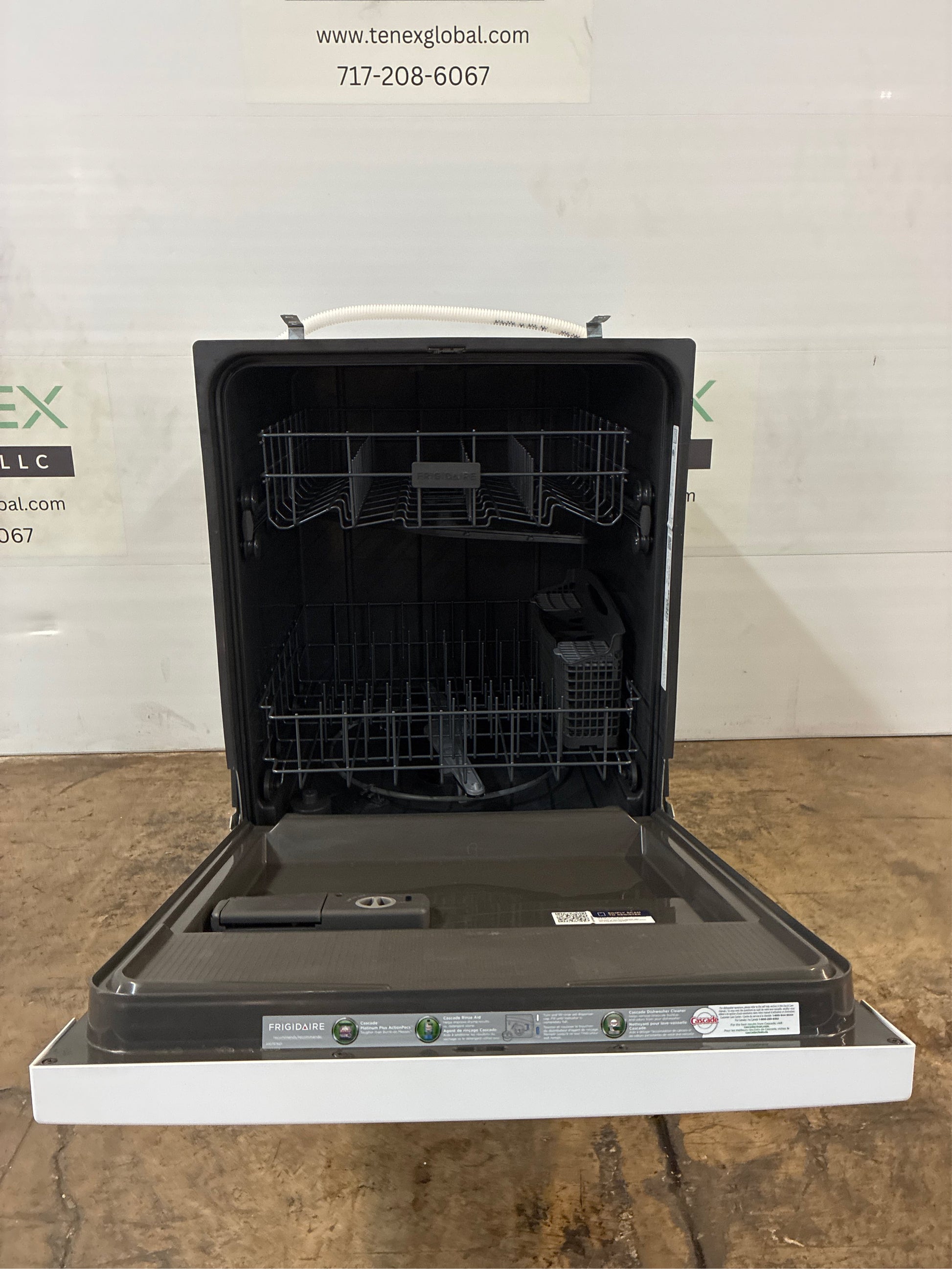 The Frigidaire 24 built-in dishwasher offers triple the cleaning power giving your dishes a more effective clean with our three spray arms that achieve better water coverage. Plus, enjoy an enhanced dry with MaxDry, which delivers better results reducing the need for towel drying. This quiet dishwasher (54 dBA) also includes DishSense Sensor Technology, a sanitize option and is Energy Star certified.. Amperage (A): 10 A. Appliance Category: Dishwasher. Appliance Series: Not Applicable. Appliance Type: Dishwasher. Color/Finish: White. Color/Finish Family: White. Control Location: Front Control. Control Type: Electronic. Custom Door Panel Ready: No. Decibel (Sound) Rating: 54 dBA. Dishwasher Features: Self-Cleaning Filter. Dishwasher Rack Configuration: 1st Rack- Silverware Basket,Removable Silverware Basket,Standard Rack Only. Dishwasher Wash Cycles: Delay Start,Eco,Pots and Pans,Quick Wash,Standard Wash. Dry Options: Heated Dry. Energy Consumption (kWh/year): 240. Energy Efficiency Tier Rating: Tier I. Handle Type: Pocket Handle. Hardware Color/Finish: White. Hardware Color/Finish Family: White. Hose Length (ft.): 6 ft. Number of Cycles: 4. Number of Place Settings: 14. Product Weight (lb.): 56 lb. Rack Material: PVC. Returnable: Non-Returnable. Silverware Basket Location: In Rack. Sound Rating Range (Decibels): Quiet. Steam Function: Without Steam. Tub Material: Plastic Tub. Voltage (V): 120 V. Certifications and Listings: ASSE Listed,Energy Star,NSF Certified,UL Listed,cUL Listed. Cut-Out Depth (in.): 24 in. Cut-Out Height (in.): 34.25 in. Cut-Out Width (in.): 24 in. Depth - Door Shut (with Handle) (in.): 25 in. Depth - Door Shut (without Handle) (in.): 25 in. Depth With Door Open 90 Degrees (in.): 49.25 in. Dishwasher Size: 24 In.. Height - Maximum (in): 35 in. Height - Minimum (in): 33.5 in. Product Depth (in.): 25 in. Product Height (in.): 35 in. Product Width (in.): 24 in. Dishwasher Size: 24 In.. Height - Max (in): 35 in. Sound Rating Range (Decibels): Quiet. Control Location: Front Control. Handle Type: Pocket Handle. Features: Self-Cleaning Filter. Dry Options: Heated Dry. Dishwasher Wash Cycles: Quick Wash