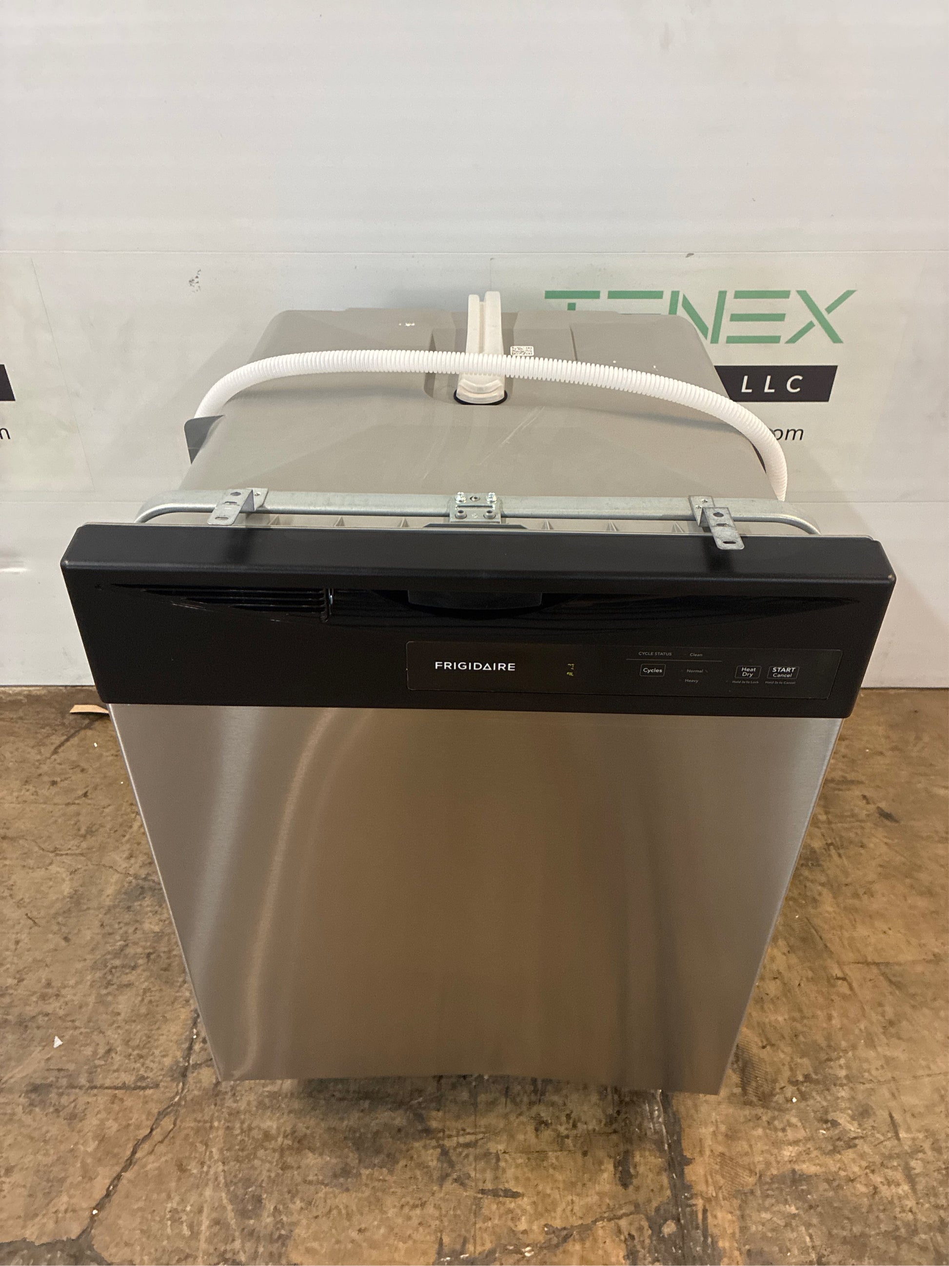The Frigidaire 24 in. built-in dishwasher offers a complete clean with the 5-level wash system, featuring an upper spray nozzle, middle spray arm, and lower spray arm. Reduce energy use with the no heat dry option. Clean 14-place settings in one cycle.. Amperage (A): 10 A. Appliance Category: Dishwasher. Appliance Series: Not Applicable. Appliance Type: Dishwasher. Color/Finish: Stainless Steel. Color/Finish Family: Stainless Steel. Control Location: Front Control. Control Type: Mechanical. Custom Door Panel Ready: No. Decibel (Sound) Rating: 62 dBA. Dishwasher Features: Filtered Water,Hard Food Disposer,Self-Cleaning Filter,Tall Tub. Dishwasher Rack Configuration: 2nd Rack- Silverware Basket,Removable Silverware Basket,Standard Rack Only. Dishwasher Wash Cycles: Standard Wash. Dry Options: Heated Dry. Energy Consumption (kWh/year): 330. Energy Efficiency Tier Rating: Tier I. Handle Type: Pocket Handle. Hardware Color/Finish: Stainless Steel. Hardware Color/Finish Family: Stainless Steel. Hose Length (ft.): 10 ft. Number of Cycles: 2. Number of Place Settings: 12. Product Weight (lb.): 58 lb. Rack Material: PVC. Returnable: Non-Returnable. Silverware Basket Location: In Rack. Sound Rating Range (Decibels): Average. Steam Function: Without Steam. Tub Material: Plastic Tub. Voltage (V): 120 V. Certifications and Listings: ASSE Listed,UL Listed. Cut-Out Depth (in.): 24 in. Cut-Out Height (in.): 35.75 in. Cut-Out Width (in.): 25 in. Depth - Door Shut (with Handle) (in.): 25 in. Depth - Door Shut (without Handle) (in.): 25 in. Depth With Door Open 90 Degrees (in.): 49 in. Dishwasher Size: 24 In.. Height - Maximum (in): 35 in. Height - Minimum (in): 34 in. Product Depth (in.): 25 in. Product Height (in.): 35 in. Product Width (in.): 24 in. Dishwasher Size: 24 In.. Control Location: Front Control. Height - Max (in): 35 in. Sound Rating Range (Decibels): Average. Features: Hard Food Disposer. Handle Type: Pocket Handle. Features: Tall Tub. Features: Self-Cleaning Filter
