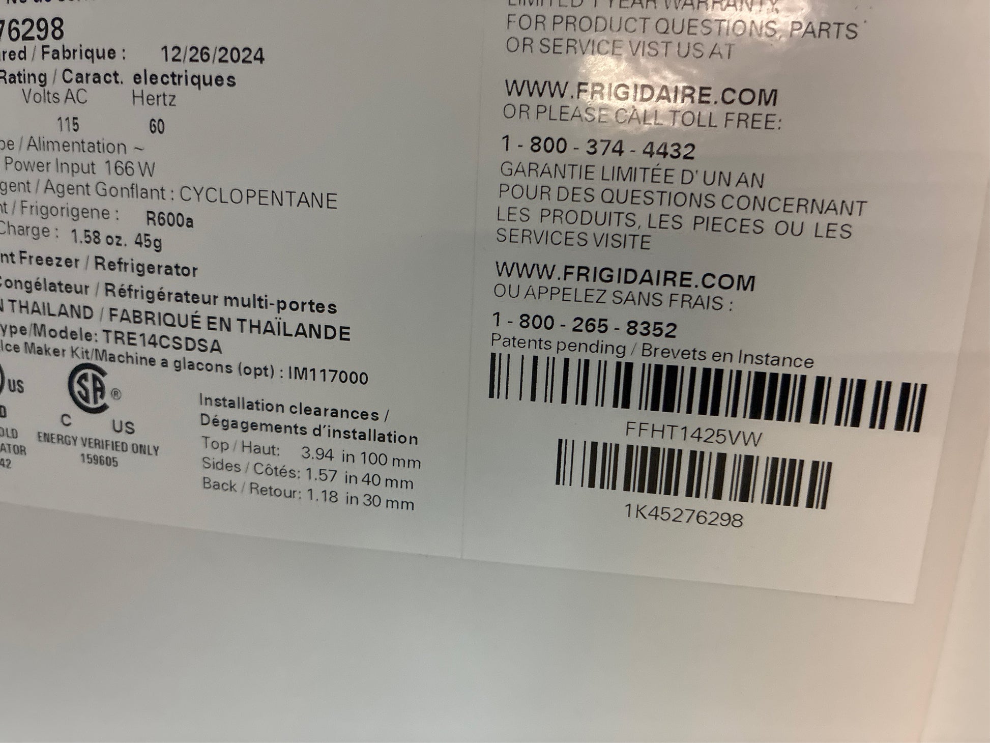 The Frigidaire 13.9 cu. ft. Top Freezer Refrigerator features 2 full-width glass shelves, a humidity-controlled crisper drawer for storing fruits and vegetables, and flexible sliding deli for meats and cheeses. Equipped with bright LED lighting to keep contents clearly visible, the refrigerator is easy to control with a single temperature knob inside. The freezer compartment offers a full-width glass shelf for flexible storage options as well as 2 full-width door racks to house additional frozen food.. Appliance Category: Refrigerator. Appliance Series: Not Applicable. Appliance Type: Top Freezer Refrigerator. Built-In and Standard Type: Top Freezer. Color - Appliance Cabinet: White. Color - Door Handle(s): White. Color/Finish: White. Color/Finish Family: White. Defrost Type: Frost Free. Dispenser Location: No Dispenser. Door Finish: Smooth. Energy Consumption (kWh/year): 322. Energy Efficiency Tier Rating: Tier III. Freezer Capacity (cu. ft.): 3.9 cu ft. Freezer Door Type: Swing Door. Freezer Features: Adjustable Temperature Control,In-door Storage. Freezer Type: Top Door Freezer. General Features: Flat-back Design,LED Light Type,Self-Closing Door. Handle Type: Recessed Handle. Hardware Color/Finish: White. Hardware Color/Finish Family: White. Ice Maker Features: No Ice Maker. Ice/Water Dispenser: None. Indoor/Outdoor: Indoor. Installation Depth: Counter Depth. Installation Type: Free Standing. Number of Doors: 2 Door. Number of Freezer Baskets/Bins: 2 Baskets/Bins. Number of Freezer Shelves: 1 Shelf. Number of Refrigerator Shelves: 3 Shelves. Operational Features: Humidity Controlled Crisper,Self-Closing Door. Overall Product Height (in.): 61 in. Product Weight (lb.): 135 lb. Refrigeration Dispenser Features: No Dispenser. Refrigerator Capacity (cu. ft.): 10 cu ft. Returnable: Non-Returnable. Shelf Material - Freezer: Glass. Shelf Material - Refrigerator: Glass. Storage Features: Adjustable Shelves/Racks,Crisper Drawer,Deli Drawer,Gallon Door Storage. Temperature Control Type: Internal Analog. Total Capacity (cu. ft.): 13.9 cu ft. Water Filter Replacement Model#: N/A. Certifications and Listings: ADA Compliant,UL Listed. Depth (Excluding Handles) (in.): 31.25 in. Depth (Including Handles) (in.): 29-3/8. Depth (Less Door) (in.): 25.25. Depth With Door Open 90 Degrees (in.): 54. Height to Top of Door Hinge (in.): 60.5 in. Height to Top of Refrigerator Case (in.): 59.875 in. Product Depth (in.): 29.375 in. Product Height (in.): 60.5 in. Product Width (in.): 27.625 in. Refrigerator Width (in.): 27.625 in. Total Capacity (cu. ft.): 13.9 cu ft. Overall Product Height (in.): 61 in. Depth (Excluding Handles) (in.): 31.25 in. Height to Top (in.): 59.875 in. Ice Maker Features: No Ice Maker. Height to Top of Door Hinge (in.): 60.5 in. Installation Depth: Counter Depth. Dispenser Features: No Dispenser
