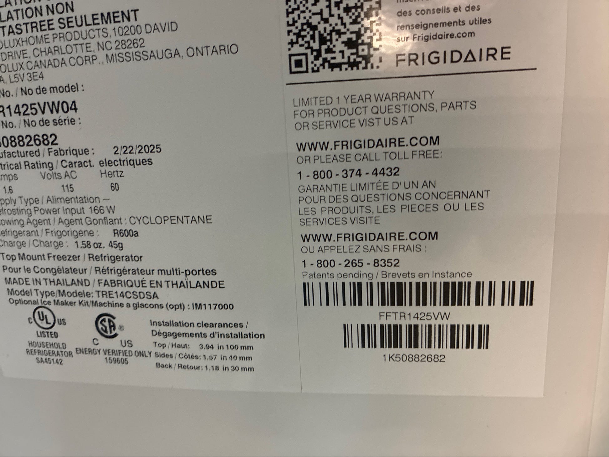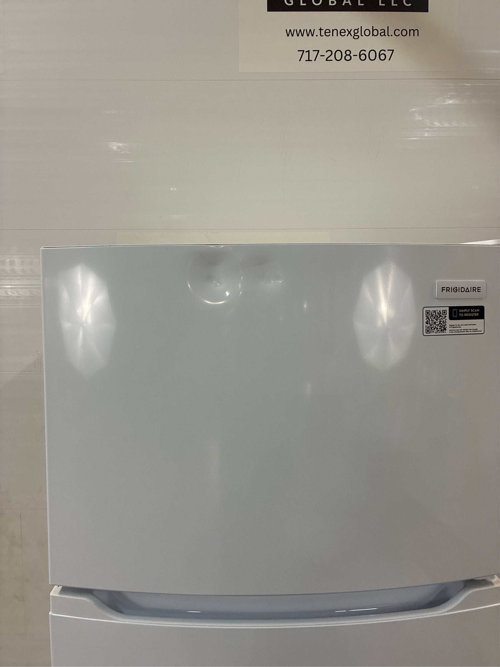 The Frigidaire 13.9 cu. ft. top freezer features the latest cooling technology with the EvenTemp cooling system, which optimizes air flow to ensure consistent temperature throughout your refrigerator. The flexible interior organization system features full-width glass shelving in the freezer and refrigerator, a sliding half-width deli drawer, and spacious door bins. Avoid spoiled food and soupy ice cream with our auto-close doors, which ensure your doors are never left slightly open by automatically closing once the door is ajar 5 or less.. Consistent temperature throughout with EvenTemp cooling system. Humidity-controlled crisper drawer. Sliding half-width deli drawer and full-width glass shelves. EvenTemp Cooling System - Prevent warm spots and unwanted freezing with our EvenTemp cooling system's optimized airflow that ensures a consistent temperature throughout your refrigerator. Flexible Interior Storage System - Find a place for everything with our flexible interior storage options designed for busy families, including full-width glass shelving in the freezer and refrigerator, a sliding half-width deli drawer, and spacious door bins. Humidity-Controlled Crisper Drawer - Keep produce fresher longer, so you waste less and save money with our humidity-controlled crisper drawer. Avoid spoiled food and soupy ice cream with our auto-close doors, which ensure your doors are never left slightly open by automatically closing once the door is ajar 5 or less. Ice maker ready - enjoy the flexibility of later adding an ice maker without sacrificing valuable freezer space thanks to our optional slim ice maker (sold separately - model # IM117000). Reversible door can be installed to open left or right based on your needs. Door storage includes 3 full-width racks that give you room for larger items like a gallon of milk. Bright LED lighting makes it easy to see what's inside. Humidity-controlled crisper drawer keeps your fruits and vegetables fresh. Large 10.0 cu. ft. fresh food capacity has the space to keep foods organized while 3.9 cu. ft. freezer capacity gives you room for storing all your frozen foods. Single knob control inside refrigerator for easy temperature management. Ice maker ready - Enjoy the flexibility of later adding an ice maker without sacrificing valuable freezer space thanks to our optional slim ice maker (sold separately - model # IM117000) . Compatible with air filter model : FRGPAAF1 . Click here to shop all Frigidaire appliances . Click here for more information on Electronic Recycling Programs . Appliance Category: Refrigerator. Appliance Series: Not Applicable. Appliance Type: Top Freezer Refrigerator. Built-In and Standard Type: Top Freezer. Color - Appliance Cabinet: White. Color - Door Handle(s): White. Color/Finish: White. Color/Finish Family: White. Defrost Type: Frost Free. Dispenser Location: No Dispenser. Door Finish: Smooth. Energy Consumption (kWh/year): 369. Energy Efficiency Tier Rating: Tier III. Freezer Capacity (cu. ft.): 3.9 cu ft. Freezer Door Type: Swing Door. Freezer Features: Adjustable Temperature Control,In-door Storage. Freezer Type: Top Door Freezer. General Features: Flat-back Design,LED Light Type,Reversible Door Hinge,Self-Closing Door. Handle Type: Recessed Handle. Hardware Color/Finish: White. Hardware Color/Finish Family: White. Ice Maker Features: No Ice Maker. Ice/Water Dispenser: None. Indoor/Outdoor: Indoor. Installation Depth: Counter Depth. Installation Type: Free Standing. Number of Doors: 2 Door. Number of Freezer Baskets/Bins: 2 Baskets/Bins. Number of Freezer Shelves: 1 Shelf. Number of Refrigerator Shelves: 3 Shelves. Operational Features: Humidity Controlled Crisper,Self-Closing Door. Overall Product Height (in.): 61 in. Product Weight (lb.): 138 lb. Refrigeration Dispenser Features: No Dispenser. Refrigerator Capacity (cu. ft.): 10 cu ft. Shelf Material - Freezer: Glass. Shelf Material - Refrigerator: Glass. Storage Features: Adjustable Shelves/Racks,Crisper Drawer,Deli Drawer,Gallon Door Storage. Temperature Control Type: Internal Analog. Total Capacity (cu. ft.): 13.9 cu ft. Water Filter Replacement Model#: N/A. Certifications and Listings: ADA Compliant,UL Listed. Depth (Excluding Handles) (in.): 25.25 in. Depth (Including Handles) (in.): 29.375 in. Depth (Less Door) (in.): 25.25. Depth With Door Open 90 Degrees (in.): 54. Height to Top of Door Hinge (in.): 60.5 in. Height to Top of Refrigerator Case (in.): 59.875 in. Height to Top of Refrigerator Door (in.): 59.875 in. Product Depth (in.): 29.375 in. Product Height (in.): 60.5 in. Product Width (in.): 27.625 in. Refrigerator Width (in.): 27.625 in