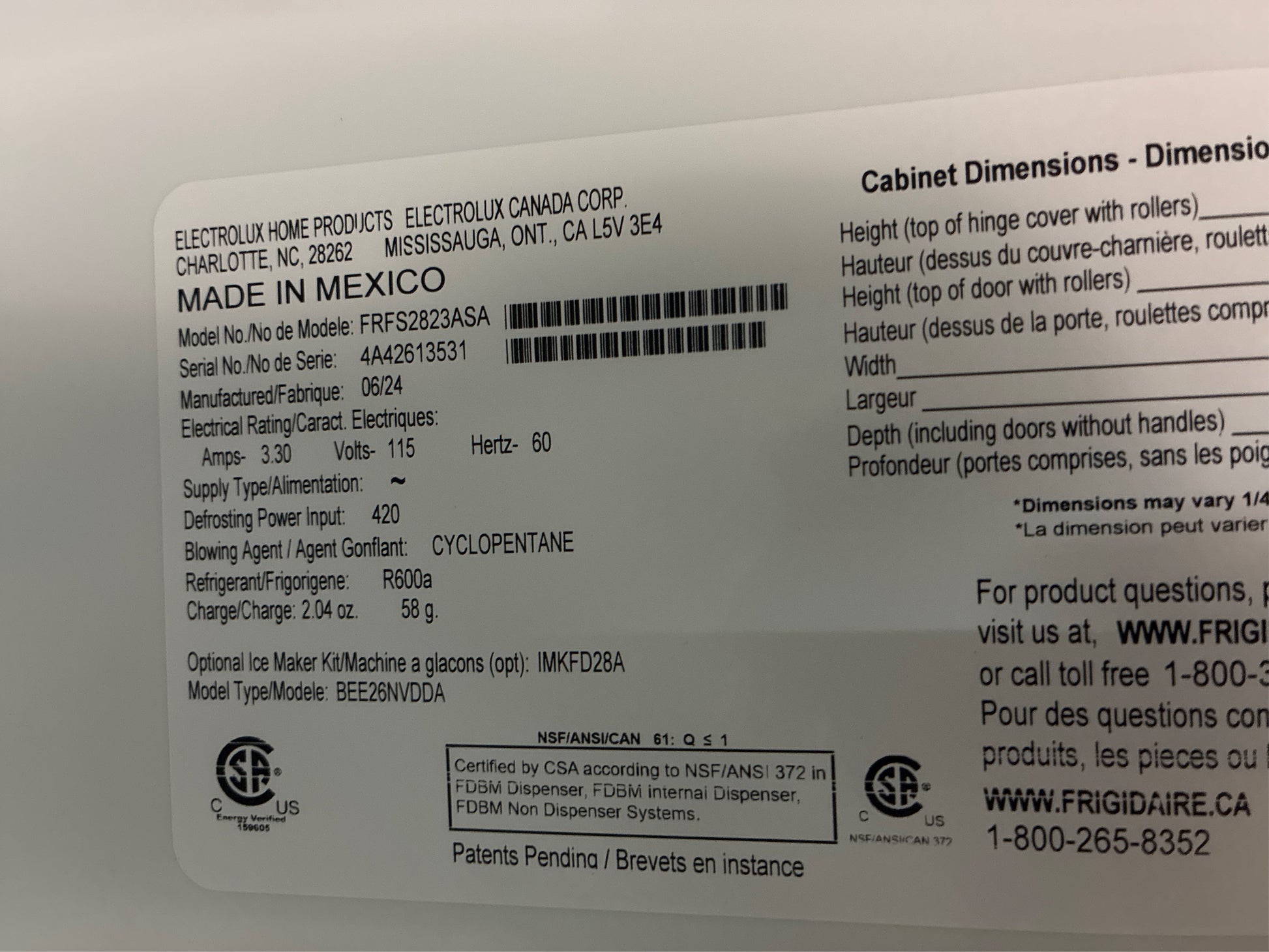 This Frigidaire French door refrigerator helps keep fruits and vegetables fresh longer with CrispSeal crispers which blocks dry air from entering your crisper to avoid premature shriveling. Easily stay organized with a full width deli drawer and large door bin storage. Keep safe, great tasting water flowing. Our filter reduces up to 99% of contaminants, cuts back on plastic and saves the cost of bottled water (NSF and WQA certified). Keep produce fresh longer with our sealed crispers Large door bin storage, without sacrificing valuable shelf space Enjoy safe, great tasting filtered water and ice Avoid spoiled food with our auto-close doors Keep your food fresh and reduce freezer burn with our variable speed compressor that reacts quickly to temperature fluctuations and constantly circulates cold air throughout the fresh food and freezer compartments Easily access and organize your deli meat and cheeses within our full width deli drawer Our air filter performs better than baking soda, capturing undesirable smells to keep your fridge fresh for longer Dual ice maker ready (kit sold separately model IMKFD28A) Appliance Color/Finish: Stainless steel Cabinet Color: Gray Handle Color: Stainless steel Manufacturer Color/Finish: Stainless Steel Toe Grille Color: No toe grille Actual Width (Inches): 36 Common Width (Inches): 36 Popular Widths: 36-in Depth (Excluding Handles) (Inches): 33.3 Depth (Including Handles) (Inches): 35.7 Depth (Less Door) (Inches): 28.5 Depth Type: Standard-Depth Depth with Door Open (Inches): 48.5 Height to Top of Case (Inches): 68.3 Height to Top of Door (Inches): 68.3 Height to Top of Door Hinge (Inches): 70 Overall Capacity (Cu. Feet): 27.8 Refrigerator Capacity (Cu. Feet): 18.8 Freezer Capacity (Cu. Feet): 9 Refrigerator Size: Medium (33 - 36-in) Weight (lbs.): 352 ADA Compliant: No Air Filtration: Yes Automatic Door Sensor: No Automatic Drawer Sensor: No Built-In: No Child Safety Locks: Yes Customizable: No Dispenser Light: Yes Door Alarm: Yes Door Shelves: 9 Door Style: Flat Door Texture: Smooth Door within Door: No Dual Evaporator Cooling System: No Electronic Temperature Control: Yes Fingerprint-Resistant: No Gallon Door Storage: Yes Garage Ready: No Handle Type: Standard Hidden Hinge: Yes Hub Required: No Humidity-Controlled Crispers: 2 LED Light: Yes Lowe's Exclusive: No Number of Doors: 3 Panel Ready: No Pantry Drawer: No Professional: No Refrigerator Interior Lighting: LED See-Thru Door: No Shelf Options: Adjustable glass shelves Snack/Deli Drawer: Yes Soft Close Drawers: No Temperature Controlled Drawer: No Voice Controlled: No Frost-Free: Yes Space-Saving In-Door Ice: No Water Filtration: Yes Water Filter Indicator: Yes Reversible Freezer Door: No Appliance Type: French door refrigerator Built-in Water Pitcher: No Ice Maker: Single Matching Replacement Water Filter Model: FPPWFU01 Ice and Water Dispensers: Both Ice Type: Cubed/Crushed Ice/Water Location: External dispenser Freezer Baskets: 0 Freezer Door Style: Pull-out drawer Freezer Door Bins: 1 Freezer Shelves: 1 Freezer Light: Yes Freezer Drawers: 1 App Compatibility: No Bluetooth Compatibility: No Custom Door Kit Compatible: No Matching Air Filter (Model #): FRGPAAF2 Matching Previous (Model #): FFHB2750TS Smart Compatible: No Wi-Fi Compatibility: No Works with Amazon Alexa: No Works with Android: No Works with Apple HomeKit: No Works with iOS: No Works with SmartThings: No Works with Sonos: No Works with the Google Assistant: No Approved for Outdoor Use: No CA Residents: Prop 65 Warning(s): Yes ENERGY STAR Certified: Yes Safety Listing: CSA safety listing UNSPSC: 52141500