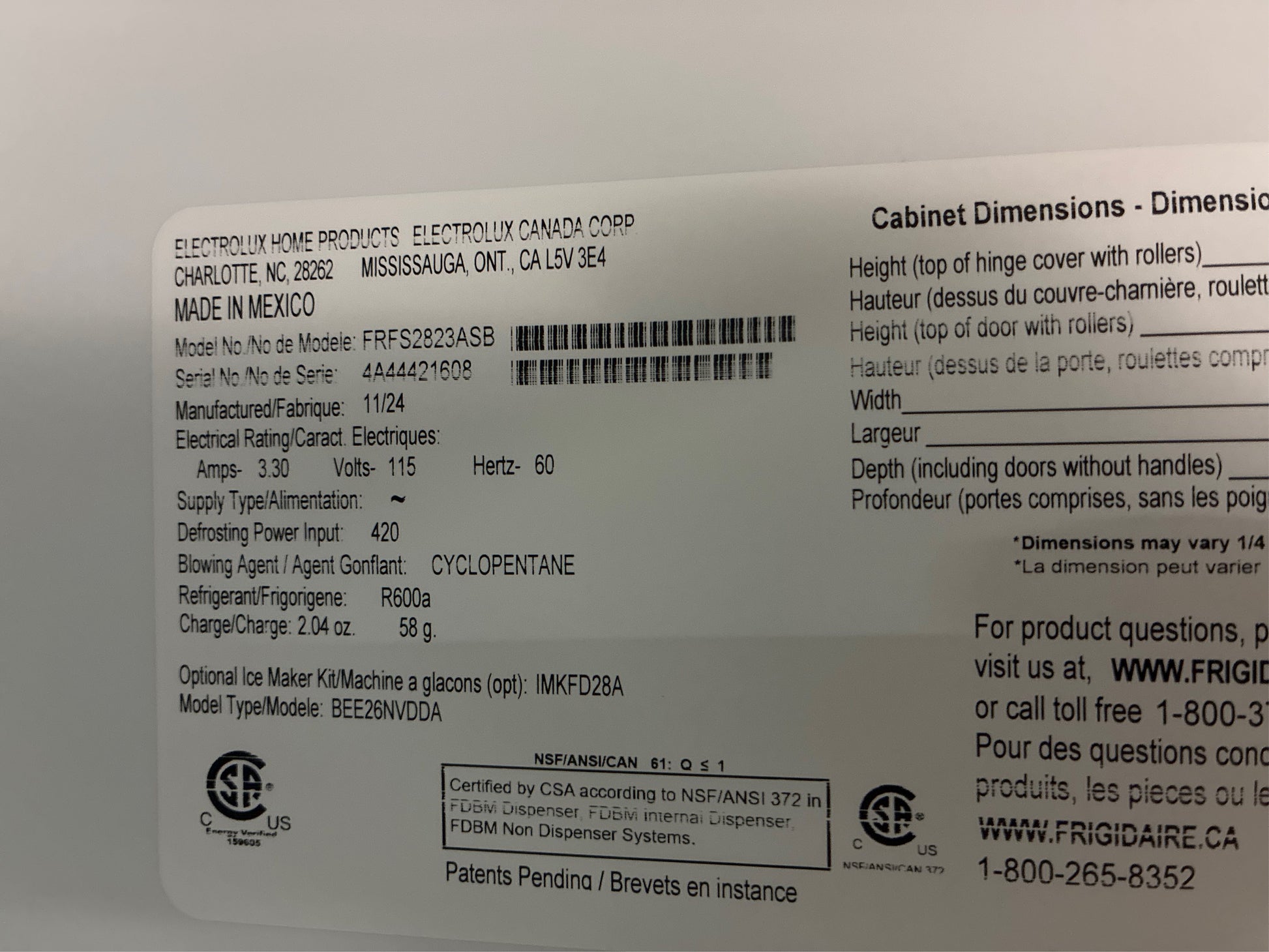 This Frigidaire French door refrigerator helps keep fruits and vegetables fresh longer with CrispSeal crispers which blocks dry air from entering your crisper. Easily stay organized with a full width deli drawer & Large door bin storage. Our large bins offer more door storage, without sacrificing valuable shelf space.. Keep produce fresh longer with our sealed crispers. Large door bin storage. Enjoy safe, great tasting filtered water and ice. Keep produce fresh longer with our sealed crispers. More door bin storage than any other French Door. Enjoy safe, great tasting filtered water and ice. Avoid spoiled food with our auto-close doors. EvenTemp Cooling System. Full Width Deli Drawer. PureAir Ultra II Air Filter. Dual Ice Maker Ready. Energy Star. Sabbath Mode. Front Rollers. Freezer drawer glides out smoothly and fully extends giving you easy access to 2 sliding full-width baskets. Water filter change indicator signal lets you know when the filter needs to be replaced. Compatible with air filter model : FRGPAAF2 . Optional 2nd ice maker sold separately. Compatible with water filter model : HDFPPWFU01 . Click Here for details on the services included with Delivery & Basic Hook-up, Installation options for Major Appliances, and Appliance Return Policy Information . Click here for more information on Electronic Recycling Programs . Appliance Category: Refrigerator. Appliance Series: Not Applicable. Appliance Type: French Door Refrigerator. Built-In and Standard Type: French Door. Color - Appliance Cabinet: Gray. Color - Door Handle(s): Stainless Steel. Color/Finish: Stainless Steel. Color/Finish Family: Stainless Steel. Defrost Type: Auto / Cycle. Dispenser Location: External Water Dispenser. Door Finish: Smooth. Energy Consumption (kWh/year): 717. Energy Efficiency Tier Rating: Tier I. Freezer Capacity (cu. ft.): 8.7 cu ft. Freezer Door Type: Pull Out Drawer. Freezer Features: Incandescent Light Type. Freezer Type: Drawer Freezer. General Features: Hidden Hinge,Incandescent Light Type. Hardware Color/Finish: White. Hardware Color/Finish Family: White. Ice Maker Features: Automatic Ice Level Control/Shutoff. Ice/Water Dispenser: Both. Indoor/Outdoor: Indoor. Installation Depth: Standard Depth. Installation Type: Free Standing. Number of Doors: 3 Door. Number of Drawers: No Drawers. Number of Freezer Baskets/Bins: 1 Basket/Bin. Number of Freezer Shelves: No Shelves. Number of Refrigerator Shelves: 4 Shelves. Operational Features: Fresh Air Filter,Humidity Controlled Crisper,Sabbath Mode. Product Weight (lb.): 352 lb. Refrigeration Dispenser Features: Crushed Ice,Dispenser Control Lock-Out,Filtration Replacement Indicator Light,Water Dispenser,Water Filtration. Refrigerator Capacity (cu. ft.): 27.8 cu ft. Shelf Material - Freezer: No Shelf. Shelf Material - Refrigerator: Glass. Storage Features: Adjustable Door Storage,Deli Drawer,Gallon Door Storage,Slide-Out Fresh Food Shelves,Spill Proof Shelves. Temperature Control Type: External Digital. Total Capacity (cu. ft.): 26.8 cu ft. Water Filter Replacement Model#: FPPWFU01. Certifications and Listings: CSA Listed,Energy Star. Depth (Excluding Handles) (in.): 33.05 in. Depth (Including Handles) (in.): 35.875 in. Depth (Less Door) (in.): 28.75 in. Depth With Door Open 90 Degrees (in.): 47.375 in. Height to Top of Door Hinge (in.): 69.875 in. Height to Top of Refrigerator (in.): 68.625 in. Product Depth (in.): 33.375 in. Product Height (in.): 69.785 in. Product Width (in.): 36 in. Refrigerator Width (in.): 36 in
