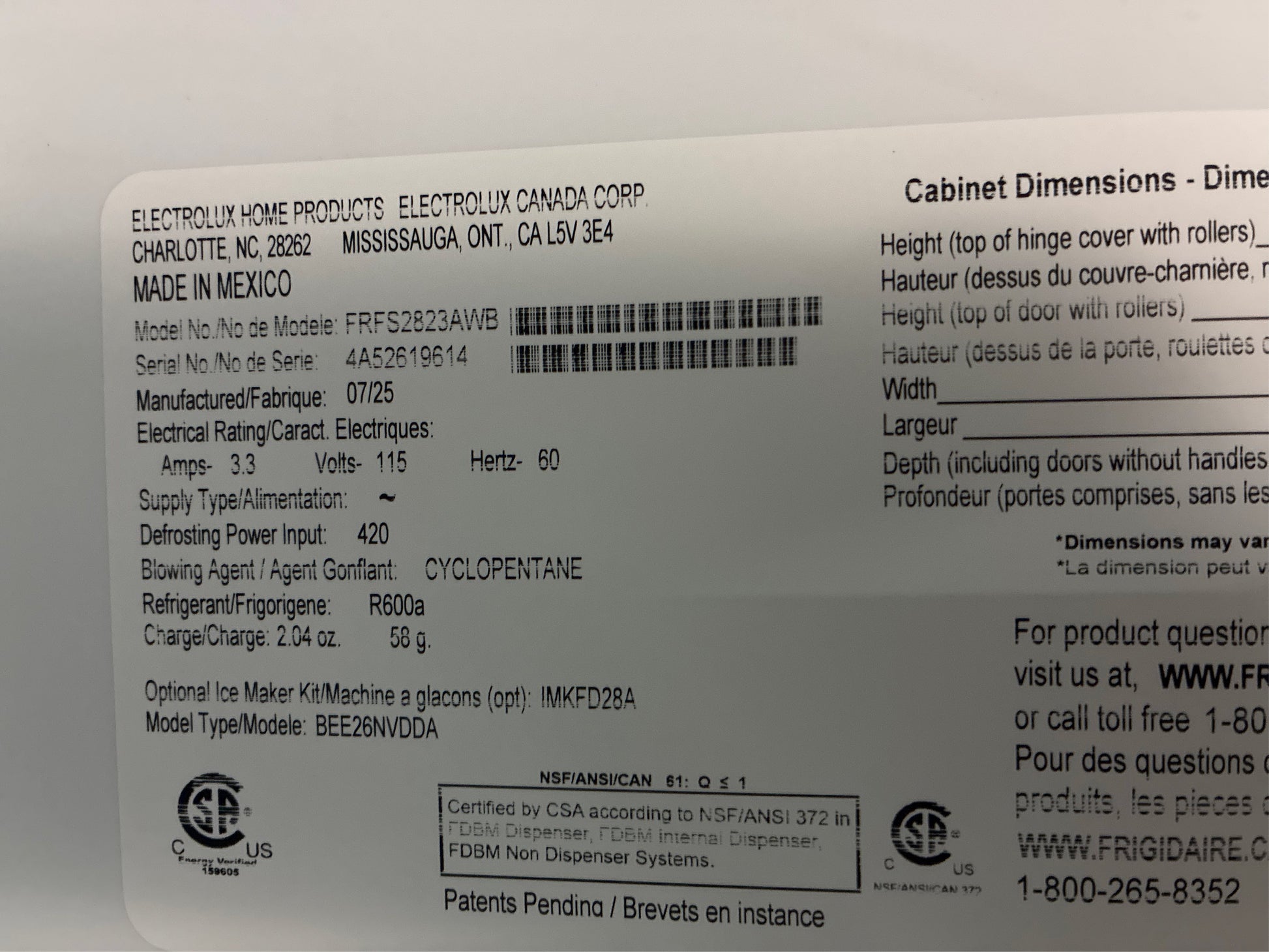 This Frigidaire French door refrigerator helps keep fruits and vegetables fresh longer with CrispSeal crispers which blocks dry air from entering your crisper. Easily stay organized with a full width deli drawer & Large door bin storage. Our large bins offer more door storage, without sacrificing valuable shelf space.. Appliance Category: Refrigerator. Appliance Series: Not Applicable. Appliance Type: French Door Refrigerator. Built-In and Standard Type: French Door. Color - Appliance Cabinet: White. Color - Door Handle(s): White. Color/Finish: White. Color/Finish Family: White. Defrost Type: Frost Free. Dispenser Location: External Ice Dispenser,External Water Dispenser. Door Finish: Smooth. Energy Consumption (kWh/year): 725. Energy Efficiency Tier Rating: Not CEE rated. Freezer Capacity (cu. ft.): 9 cu ft. Freezer Door Type: Pull Out Drawer. Freezer Features: LED Light Type. Freezer Type: Bottom Door Freezer. General Features: Dispenser Light,LED Light Type. Handle Type: Bar Handle. Hardware Color/Finish: White. Hardware Color/Finish Family: White. Ice Maker Features: Automatic Ice Level Control/Shutoff,Filtered Ice. Ice/Water Dispenser: Ice Only. Indoor/Outdoor: Indoor. Installation Depth: Standard Depth. Installation Type: Free Standing. Number of Doors: 3 Door. Number of Drawers: Single Drawer. Number of Freezer Baskets/Bins: 1 Basket/Bin. Number of Freezer Shelves: 1 Shelf. Number of Refrigerator Shelves: 4 Shelves. Operational Features: Fresh Air Filter,Humidity Controlled Crisper,Sabbath Mode. Overall Product Height (in.): 70 in. Product Weight (lb.): 352 lb. Refrigeration Dispenser Features: Crushed Ice,Cubed Ice,Filtration Replacement Indicator Light,Water Dispenser,Water Filtration. Refrigerator Capacity (cu. ft.): 18.8 cu ft. Returnable: Non-Returnable. Shelf Material - Freezer: Glass. Shelf Material - Refrigerator: Glass. Storage Features: Adjustable Door Storage,Deli Drawer,Gallon Door Storage,Slide-Out Fresh Food Shelves,Spill Proof Shelves. Temperature Control Type: Internal Electric. Total Capacity (cu. ft.): 27.8 cu ft. Water Filter Replacement Model#: FPPWFU01. Certifications and Listings: CSA Listed,Energy Star. Depth (Excluding Handles) (in.): 33.3 in. Depth (Including Handles) (in.): 35.7 in. Depth (Less Door) (in.): 28.5 in. Depth With Door Open 90 Degrees (in.): 48.5 in. Height to Top of Door Hinge (in.): 70 in. Height to Top of Refrigerator Case (in.): 68.3 in. Product Depth (in.): 33.375 in. Product Height (in.): 70 in. Product Width (in.): 36 in. Refrigerator Width (in.): 36 in. Installation Depth: Standard Depth. Depth (Excluding Handles) (in.): 33.3 in. Total Capacity (cu. ft.): 27.8 cu ft. Dispenser Features: Water Dispenser. Overall Product Height (in.): 70 in. Dispenser Features: Cubed Ice. Dispenser Features: Crushed Ice. Dispenser Features: Water Filtration