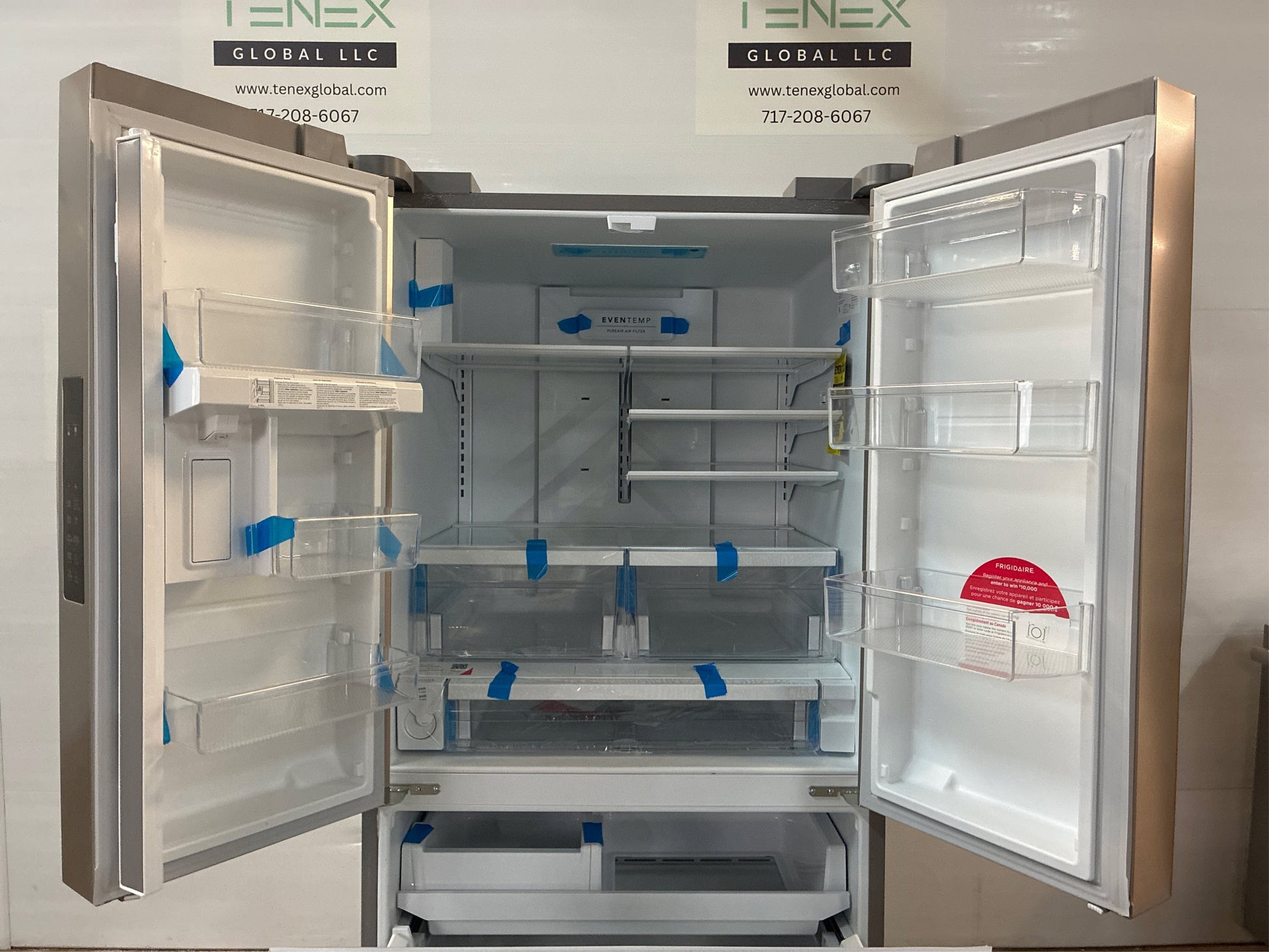 Frigidaire French Door refrigerator with Internal Water offers our EvenTemp Cooling System which reacts quickly to temperature fluctuations and constantly circulates cold air throughout the fresh food and freezer compartments, ensuring a consistent cool from top to bottom. Prevent warm spots and unwanted freezing with our cooling system that optimizes airflow to ensure a consistent temperature throughout your refrigerator. Fresh, filtered water right from your internal dispenser, while allowing for a clean exterior look. Keep fruits and vegetables fresh in our crispers that offer a seal to block out dry air. Our large bins offer more door storage, without sacrificing valuable shelf space. Smudge-Proof Stainless Steel resists fingerprints and cleans easily. Keep safer, great tasting water flowing and reduce up to 99% of contaminants while cutting back on plastic and the cost of bottled water with our water filter. Full-width drawer for spacious storage that you can easily access everything inside. ENERGY STAR Certified. Our air filter performs better than baking soda, capturing undesirable smells to keep your fridge fresh for longer. Appliance Color/Finish: Stainless steel. Cabinet Color: Gray. Handle Color: Stainless steel. Manufacturer Color/Finish: Smudge-Proof Stainless Steel. Toe Grille Color: No toe grille. Actual Width (Inches): 36. Common Width (Inches): 36. Depth (Excluding Handles) (Inches): 33.3. Depth (Including Handles) (Inches): 35.7. Depth (Less Door) (Inches): 28.5. Depth Type: Standard-Depth. Depth with Door Open (Inches): 48.5. Freezer Capacity (Cu. Feet): 9. Height to Top of Case (Inches): 68. Height to Top of Door (Inches): 68.3. Height to Top of Door Hinge (Inches): 70. Overall Capacity (Cu. Feet): 28.8. Popular Widths: 36-in. Refrigerator Capacity (Cu. Feet): 19.8. Refrigerator Size: Medium (33 - 36-in). Weight (lbs.): 352. ADA Compliant: No. Air Filtration: Yes. Appliance Type: French door refrigerator. Automatic Door Sensor: No. Automatic Drawer Sensor: No. Built-In: No. Built-in Water Pitcher: No. Child Safety Locks: Yes. Customizable: No. Dispenser Light: No. Door Alarm: Yes. Door Shelves: 6. Door Style: Flat. Door Texture: Smooth. Door within Door: No. Dual Evaporator Cooling System: No. Electronic Temperature Control: Yes. Fingerprint-Resistant: Yes. Freezer Baskets: 0. Freezer Door Bins: 1. Freezer Door Style: Pull-out drawer. Freezer Drawers: 0. Freezer Light: Yes. Freezer Shelves: 1. Frost-Free: No. Gallon Door Storage: Yes. Garage Ready: No. Handle Type: Standard. Hidden Hinge: Yes. Hub Required: No. Humidity-Controlled Crispers: 2. Ice and Water Dispensers: Water only. Ice Maker: Single. Ice Type: Cubed. Ice/Water Location: Internal dispenser. LED Light: Yes. Lowe's Exclusive: No. Matching Replacement Water Filter Model: FPPWFU01. Number of Doors: 3. Panel Ready: No. Pantry Drawer: No. Professional: No. Refrigerator Interior Lighting: LED. Reversible Freezer Door: No. See-Thru Door: No. Shelf Options: Glass shelves. Snack/Deli Drawer: Yes. Soft Close Drawers: No. Space-Saving In-Door Ice: No. Temperature Controlled Drawer: No. Voice Controlled: No. Water Filter Indicator: Yes. Water Filtration: Yes. App Compatibility: No. Bluetooth Compatibility: No. Custom Door Kit Compatible: No. Matching Air Filter (Model #): FRGPAAF1. Matching Previous (Model #): FRFN2823AS. Smart Compatible: No. Wi-Fi Compatibility: No. Works with Amazon Alexa: No. Works with Android: No. Works with Apple HomeKit: No. Works with iOS: No. Works with SmartThings: No. Works with Sonos: No. Works with the Google Assistant: No. Approved for Outdoor Use: No. CA Residents: Prop 65 Warning(s): Yes. ENERGY STAR Certified: Yes. Safety Listing: CSA safety listing. UNSPSC: 52141500.