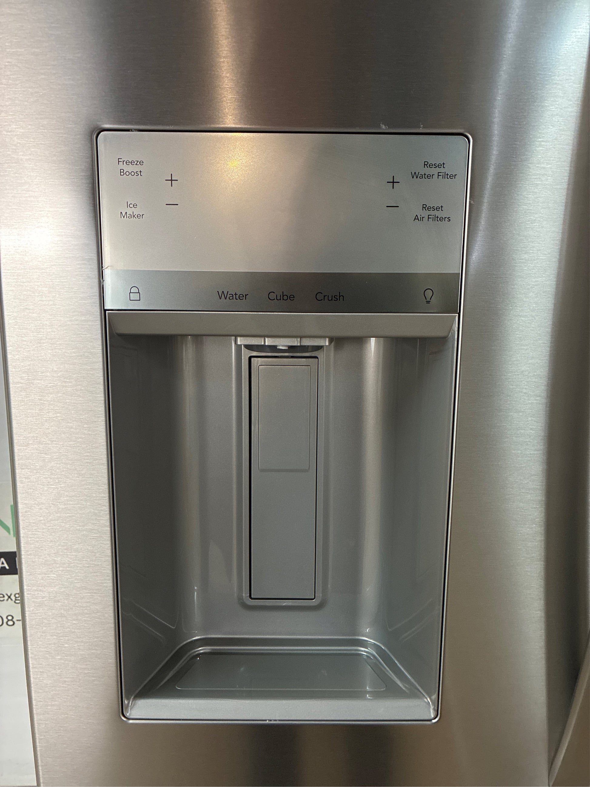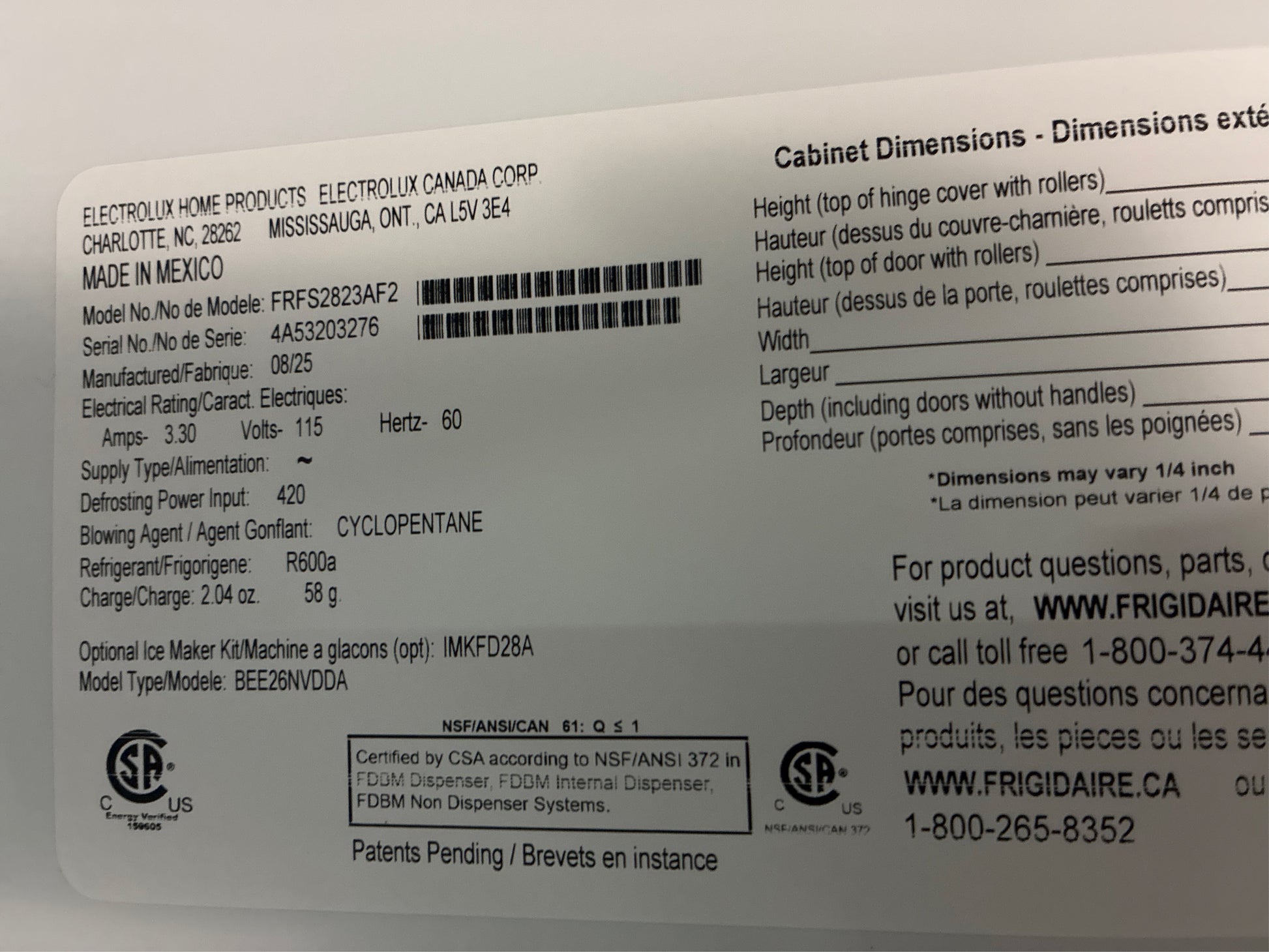 This Frigidaire French door refrigerator helps keep fruits and vegetables fresh longer with CrispSeal crispers which blocks dry air from entering your crisper. Easily stay organized with a full width deli drawer & Large door bin storage. Our large bins offer more door storage, without sacrificing valuable shelf space.. Appliance Category: Refrigerator. Appliance Series: Not Applicable. Appliance Type: French Door Refrigerator. Built-In and Standard Type: French Door. Color - Appliance Cabinet: Stainless. Color - Door Handle(s): Stainless Steel. Color/Finish: Smudge-Proof Stainless Steel. Color/Finish Family: Stainless Steel. Defrost Type: Auto / Cycle. Dispenser Location: External Water Dispenser. Door Finish: Smooth. Energy Consumption (kWh/year): 717. Energy Efficiency Tier Rating: Tier I. Freezer Capacity (cu. ft.): 8.7 cu ft. Freezer Door Type: Pull Out Drawer. Freezer Features: Incandescent Light Type. Freezer Type: Drawer Freezer. General Features: Hidden Hinge,Incandescent Light Type. Handle Type: Bar Handle. Hardware Color/Finish: Stainless Look. Hardware Color/Finish Family: Stainless Look. Ice Maker Features: Automatic Ice Level Control/Shutoff. Ice/Water Dispenser: Both. Indoor/Outdoor: Indoor. Installation Depth: Standard Depth. Installation Type: Free Standing. Number of Doors: 3 Door. Number of Drawers: Triple Drawer. Number of Freezer Baskets/Bins: 1 Basket/Bin. Number of Freezer Shelves: No Shelves. Number of Refrigerator Shelves: 4 Shelves. Operational Features: Fresh Air Filter,Humidity Controlled Crisper,Sabbath Mode. Overall Product Height (in.): 70 in. Product Weight (lb.): 352 lb. Refrigeration Dispenser Features: Crushed Ice,Dispenser Control Lock-Out,Filtration Replacement Indicator Light,Water Dispenser,Water Filtration. Refrigerator Capacity (cu. ft.): 27.8 cu ft. Returnable: Non-Returnable. Shelf Material - Freezer: No Shelf. Shelf Material - Refrigerator: Glass. Storage Features: Adjustable Door Storage,Deli Drawer,Gallon Door Storage,Slide-Out Fresh Food Shelves,Spill Proof Shelves. Temperature Control Type: External Digital. Total Capacity (cu. ft.): 27.8 cu ft. Water Filter Replacement Model#: FPPWFU01. Certifications and Listings: CSA Listed,Energy Star. Depth (Excluding Handles) (in.): 33.05 in. Depth (Including Handles) (in.): 35.875 in. Depth (Less Door) (in.): 28.75 in. Depth With Door Open 90 Degrees (in.): 47.375 in. Height to Top of Door Hinge (in.): 69.875 in. Height to Top of Refrigerator Case (in.): 68.625 in. Height to Top of Refrigerator Door (in.): 69.875 in. Product Depth (in.): 33.375 in. Product Height (in.): 69.875 in. Product Width (in.): 36 in. Refrigerator Width (in.): 36 in. Depth (Excluding Handles) (in.): 33.05 in. Total Capacity (cu. ft.): 27.8 cu ft. Overall Product Height (in.): 70 in. Installation Depth: Standard Depth. Dispenser Features: Water Dispenser. Dispenser Location: External Water Dispenser. No of Doors: 3 Door. Dispenser Features: Crushed Ice