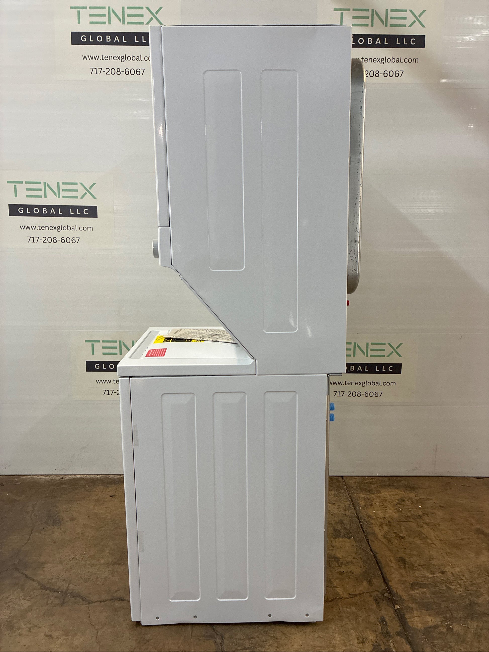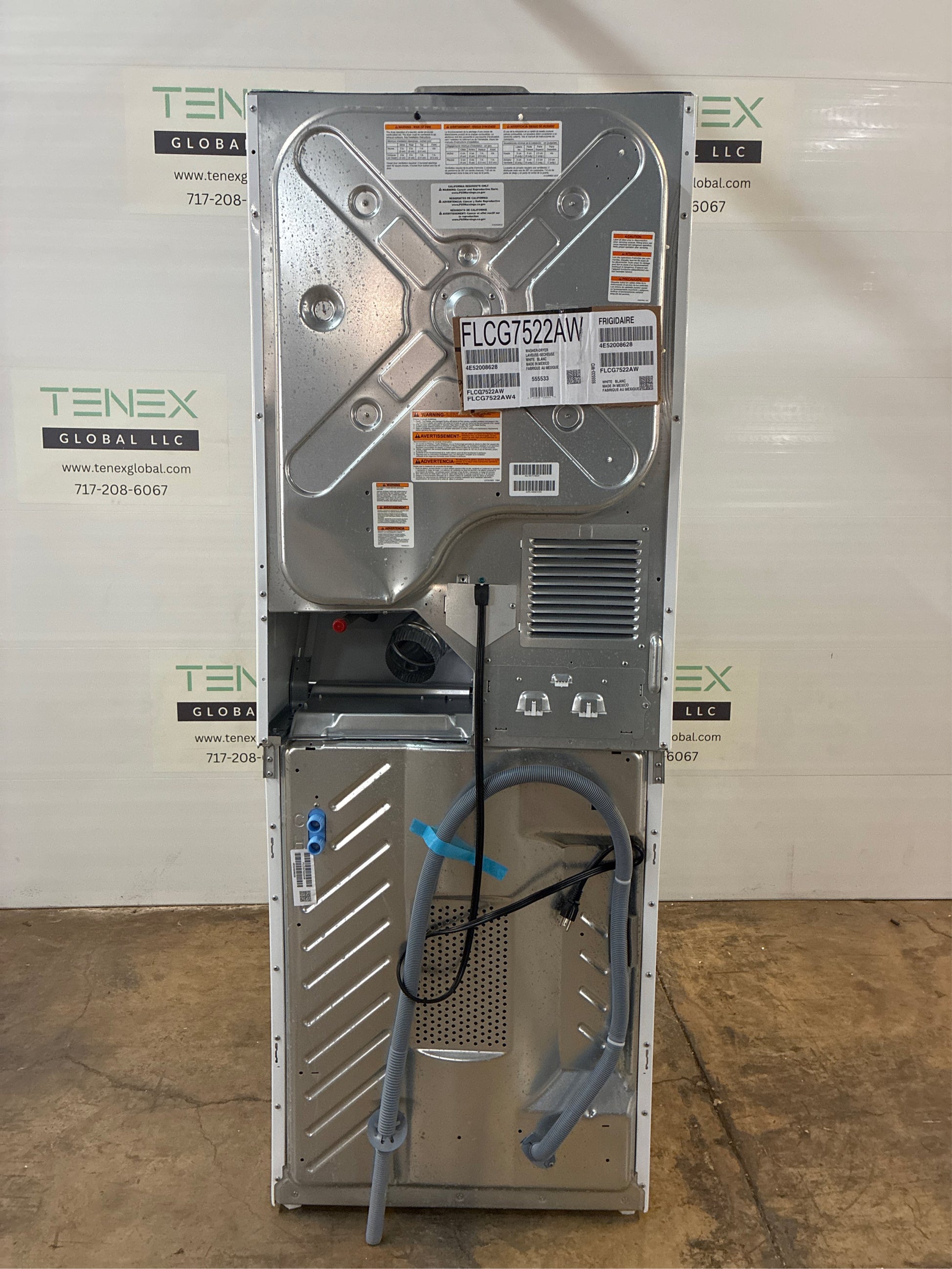 The Frigidaire Top Load Washer/Gas Dryer conveniently stacks the 5.5 cu. ft. gas dryer on top of the 3.9 cu. ft. washer to save space. This super-efficient system offers eight multiple wash cycles to meet all of your washing needs such as delicate, bedding and casual. Four different drying cycles meet all of your drying needs, including delicate, casuals and heavy-duty. Featured in a classic, white finish to complement your laundry area. Search matching electric Dryer model FLCE7522AW.. Agitator/Impeller Type: Agitator. Amperage (A): 30 A. Appliance Series: Not Applicable. Appliance Type: Washer & Dryer Combo. Capacity - Dryer (cu. ft.): 5.5. Color/Finish: White. Color/Finish Family: White. Control Type: Mechanical. Door Material: Metal. Dry Cycles: Delicates. Dryer Door Style: Right Swing. Dryer Drum Material: Stainless Steel Drum. Dryer Features: Automatic Temperature Control,Four-Way Venting,Front Control,Moisture Sensor,Sensor Dry,Timed Dry. Dryer Fuel Type: Gas. Energy Consumption (kWh/year): 175. Energy Efficiency Tier Rating: Tier I. Exhaust Vent Location: Back. Hardware Color/Finish: White. Hardware Color/Finish Family: White. Included: No Additional Items Included. Lint Filter Location: Front. Maximum Spin Speed (RPM): 850. Number of Drying Cycles: 4. Number of Drying Temperatures: 3. Number of Rinse Cycles: 1. Number of Rinse Temperatures: 3. Number of Wash Cycles: 10. Number of Wash Speeds: 4. Number of Wash Temperatures: 3. Product Weight (lb.): 280 lb. Returnable: Non-Returnable. Steam Function: No Steam. Vent Type: Vented. Voltage (volts): 120. Wash Cycles: Delicates,Heavy Duty. Washer Dispensers: Bleach. Washer Features: Add Garment (pause),Front Control. Washer Tub/Drum Material: Stainless Steel Drum. Certifications and Listings: UL Listed. Capacity - Washer (cu. ft.): 3.9. Depth With Door Open 90 Degrees (in.): 47.5 in. Door Opening Height (In.): 18.63. Door Opening Width (In.): 28.4. Dryer Door Opening Height (in.): 14. Dryer Door Opening Width (in.): 17. Product Depth (in.): 31.5 in. Product Height (in.): 76 in. Product Width (in.): 27 in. Capacity (cu. ft.): 3.9. Dryer Fuel Type: Gas. Vent Type: Vented. Width (in.): 27 in. Features: Front Control. Depth (in.): 31.5 in. Capacity (cu. ft.): 5.5. Features: Add Garment (pause)