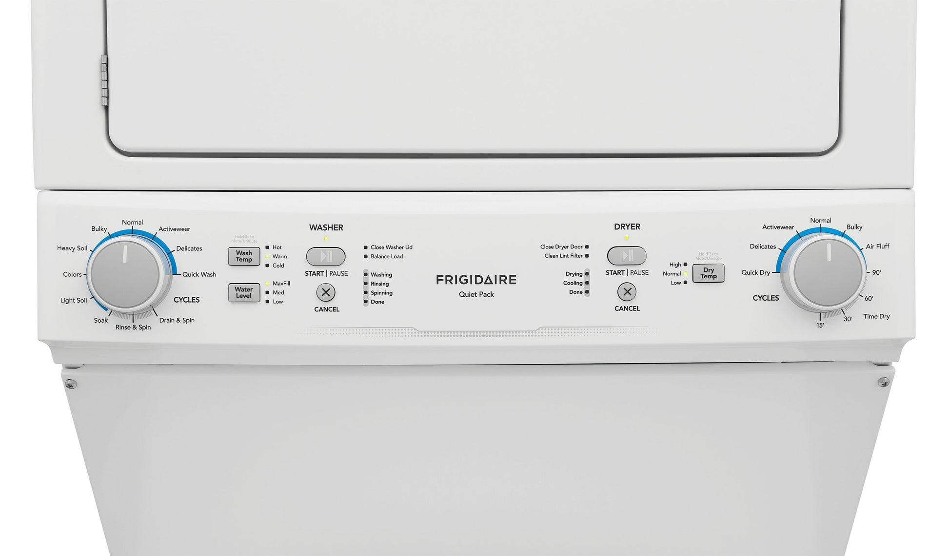 The Frigidaire Long Vent Laundry Center with 3.9 Cu. Ft. Washer and 5.5 Cu. Ft. Dryer provides a big-time clean in a tight space with the movement of the powerful agitator. The MaxFill option allows for maximum water level for the selected cycle and the spacious capacity of the washer allows you to wash a king-sized comforter. Excellent Cleaning Performance Wash and dry a single load in 60 minutes Long Vent Design supports up to 127 ft vent length Large Capacity MaxFill gives you the maximum water level for the cycle 11 Different Wash Cycles To Fit Your Needs 6 Dry Cycles 4 Timed Dryer Cycles Dryer power cord not included, must be purchased separately Appliance Color/Finish: White Manufacturer Color/Finish: White Depth with Door Closed (Inches): 31.5 Depth with Door Open (Inches): 47.5 Dryer Capacity (Cu. Feet): 5.5 Height (Inches): 76 Washer Capacity (Cu. Feet): 3.9 Weight (lbs.): 260 Width (Inches): 27 ADA Compliant: No Control Type: Electro-mechanical Customizable: No Dispensers: Bleach only Dryer Drum Material: Stainless steel Dryer Load Type: Front load End-of-Cycle Signal for Dryer: Yes Extra Power: No Fill and Drain Hoses Included: No Gas or Electric: Electric Handwashable Cycle: No Heat Pump: No Heavy Duty Cycle: Yes Interior Lighting: No Lowe's Exclusive: No Number of Drying Cycles: 10 Number of Rinse Cycles: 1 Number of Rinse Temperatures: 1 Number of Temperature Selections: 3 Number of Wash Cycles: 10 Power Source: Electric Washer Load Type: Top load Washer Tub Material: Stainless Water Levels: 3 CA Residents: Prop 65 Warning(s): Yes ENERGY STAR Certified: No Safety Listing: UL safety listing UNSPSC: 52141600