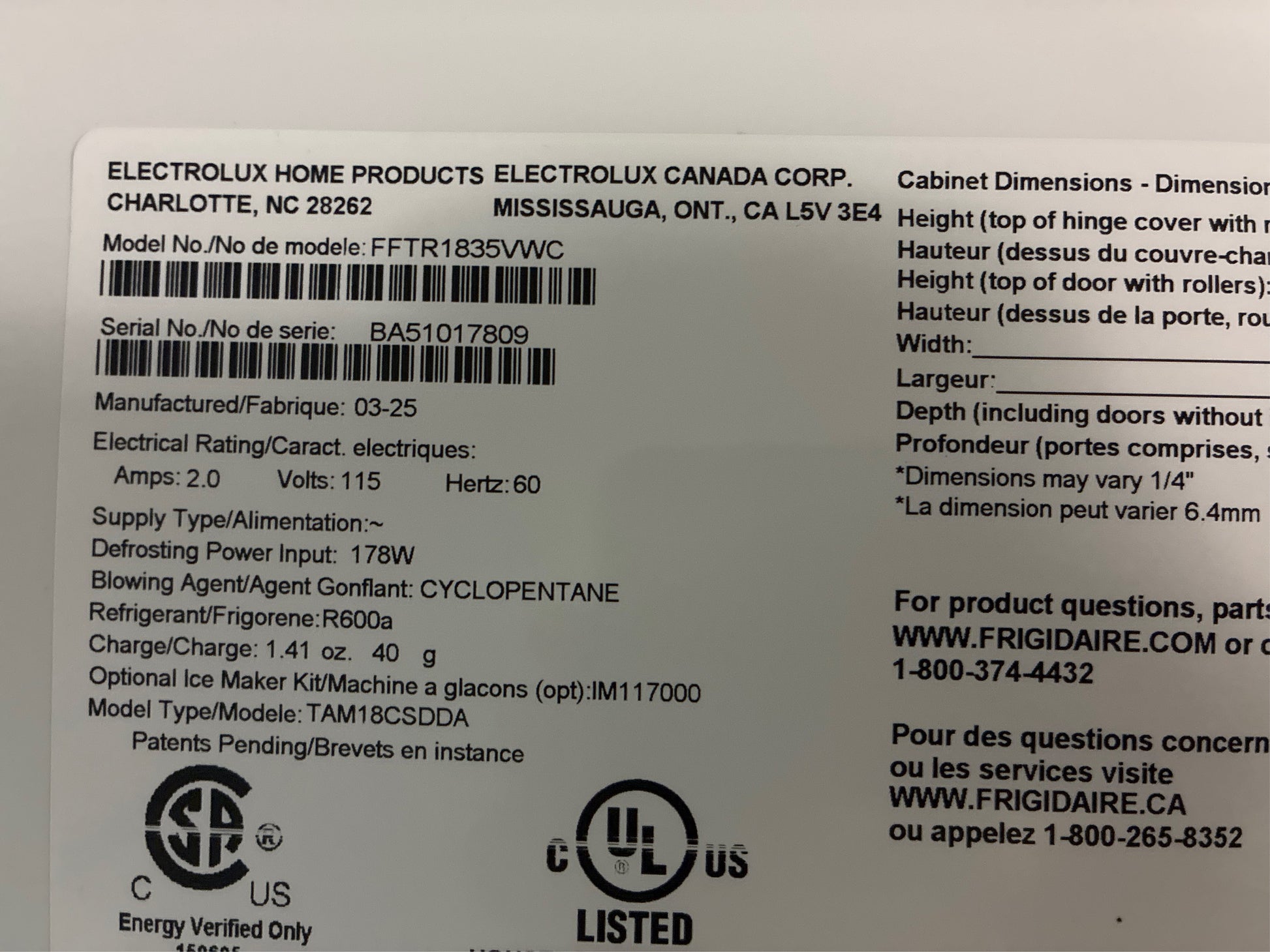The Frigidaire 18.3 cu. ft. Top Freezer Refrigerator has 2 full-width glass shelves and two humidity control crisper drawers for storing fruits and vegetables. It's equipped with bright lighting to keep contents clearly visible. The freezer has a full-width glass shelf for flexible storage options as well as 2 full-width door racks. EvenTemp Cooling system prevents warm spots and unwanted freezing. Full-width glass shelving, sliding deli drawer, large door bins. Humidity-Controlled crisper drawers keep produce fresher longer. EvenTemp Cooling System - Prevent warm spots and unwanted freezing with our EvenTemp cooling system's optimized airflow that ensures a consistent temperature throughout your refrigerator. Flexible Interior Storage System - Find a place for everything with our flexible interior storage options designed for busy families, including full-width glass shelving in the freezer and refrigerator, a sliding half-width deli drawer, and spacious door bins. Ice maker ready - enjoy the flexibility of later adding an ice maker without sacrificing valuable freezer space thanks to our optional slim ice maker (sold separately - model # IM117000). Single knob control inside the refrigerator for easy temperature management. Large 13.4 cu. ft. fresh food capacity has the space to keep foods organized while 4.9 cu. ft. freezer capacity gives you room for storing all your frozen foods. Door can be installed to open left or right based on your needs. Bright lighting makes it easy to see what's inside. 2-door refrigerator model that features the freezer on top and the refrigerator on the bottom. Designed to perform in 45 F -110 F conditions to ensure optimal performance in a variety of climates. Appliance Category: Refrigerator. Appliance Series: Not Applicable. Appliance Type: Top Freezer Refrigerator. Built-In and Standard Type: Top Freezer. Color - Appliance Cabinet: White. Color - Door Handle(s): N/A. Color/Finish: White. Color/Finish Family: White. Defrost Type: Frost Free. Dispenser Location: No Dispenser. Door Finish: Smooth. Energy Consumption (kWh/year): 410. Energy Efficiency Tier Rating: Not CEE rated. Freezer Capacity (cu. ft.): 4.9 cu ft. Freezer Door Type: Swing Door. Freezer Features: Adjustable Temperature Control, In-door Storage. Freezer Type: Top Door Freezer. General Features: LED Light Type. Hardware Color/Finish: White. Hardware Color/Finish Family: White. Ice Maker Features: No Ice Maker. Ice Maker Type: Without Ice Maker. Ice/Water Dispenser: None. Indoor/Outdoor: Indoor. Installation Depth: Standard Depth. Installation Type: Free Standing. Number of Doors: 2 Door. Number of Freezer Baskets/Bins: No Baskets/Bins. Number of Freezer Shelves: 1 Shelf. Number of Refrigerator Shelves: 2 Shelves. Operational Features: Humidity Controlled Crisper. Product Weight (lb.): 164 lb. Refrigeration Dispenser Features: No Dispenser. Refrigerator Capacity (cu. ft.): 13.4 cu ft. Shelf Material - Freezer: Glass. Shelf Material - Refrigerator: Glass. Storage Features: Adjustable Shelves/Racks, Crisper Drawer, Deli Drawer, Gallon Door Storage. Temperature Control Type: Internal Analog. Total Capacity (cu. ft.): 18.3 cu. ft. Water Filter Replacement Model#: N/A. Certifications and Listings: ADA Compliant, UL Listed. Depth (Excluding Handles) (in.): 26.625 in. Depth (Including Handles) (in.): 30.375 in. Depth (Less Door) (in.): 26.625. Depth With Door Open 90 Degrees (in.): 57. Height to Top of Door Hinge (in.): 66.375 in. Height to Top of Refrigerator (in.): 65.875 in. Product Depth (in.): 30.375 in. Product Height (in.): 65.875 in. Product Width (in.): 30 in. Refrigerator Width (in.): 30 in.