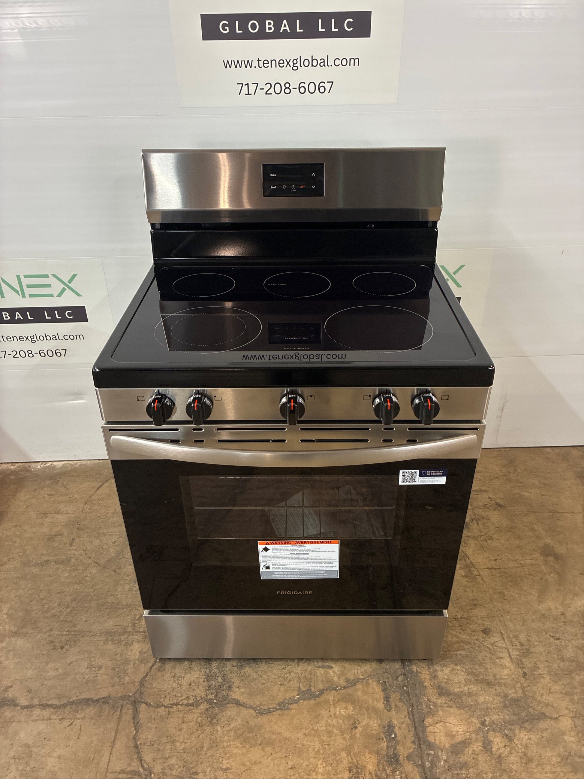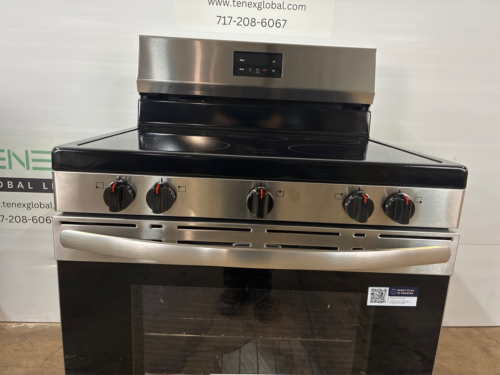 The Frigidaire 30 Electric Range allows you to get meals on the table faster with our 3,000W Quick Boil Element. Enjoy more cooktop flexibility with five cooktop elements designed to handle all of your cooking needs, including the SpaceWise Dual Expandable Element. Plus, enjoy our redesigned Extra Wide Store-More Storage Drawer, now with more space to store your unused oven racks and cookware. Get meals to the table faster with the powerful 3,000W Quick Boil element. Experience ultimate cooking flexibility with a cooktop that has five elements designed to handle all of your cooking needs. Get consistent results every time with our Even Baking Technology. Get two elements in one with the Dual Expandable element - a 6 inner ring for smaller pots and pans and a 9 outer ring for larger cookware. Large 5.3 cu ft oven capacity allows you to cook more at once. Our redesigned Store-More Storage drawer is now even wider - allowing you to store any unused oven racks, baking trays, and more. Keep food warm until everything - and everyone - is ready. Proudly Assembled in the USA. Manual clean oven. Appliance Color/Finish: Stainless steel. Handle Color: Stainless steel. Manufacturer Color/Finish: Stainless Steel. Type: Freestanding. Adjustable Height: Yes. Capacity (Cu. Feet): 5.3. Cutout Depth (Inches): 26. Cutout Height (Inches): 45. Cutout Width (Inches): 30. Depth (Inches): 26. Element #1 Size: 9-in. Element #2 Size: 6-in. Element #3 Size: 6-in/9-in. Element #4 Size: 6-in. Element #5 Size: 5-in. Maximum Assembled Height (Inches): 47.75. Minimum Assembled Height (Inches): 46.75. Popular Widths: 30-in. Range Size (Inches): 30. Usable Oven Interior (H x W x D): 18.125 x 25.1875 x 19.875. Width (Inches): 30. ADA Compliant: No. Adjustable Cleaning Levels: No. Air Fry: No. Air Sous Vide: No. Appliance Type: Single oven electric range. Automatic Convection Conversion: No. Automatic Shut-Off: No. Bridge Element: No. Cleaning Method: Manual cleaning. Control Location: Behind elements. Control Lockout: No. Convection Element Type: None. Convection Oven: No. Cooking Surface Control Type: Knobs. Cooking Surface Type: Smooth surface. Customizable: No. Dehydrator Oven: No. Delay Bake: No. Digital Display: Yes. Door Lock: No. Downdraft Exhaust: No. Dual/Triple Element: Yes. Element #1 Wattage: 3000. Element #2 Wattage: 1200. Element #3 Wattage: 3000. Element #4 Wattage: 1200. Element #5 Wattage: 100. Element #6 Wattage: 0. Favorite Setting: No. Fingerprint-Resistant: No. Food Temperature Probe: No. Fuel Type: Electric. Glide/Rollout Racks: No. Half/Split Rack: No. Hidden Bake Element: No. Hot Surface Indicator Lights: Yes. Hub Required: No. Induction Cooking: No. Installation Type: Freestanding. Interior Light(s) Type: Halogen. Keep Warm Setting: Yes. Light(s) Control: Oven light touch pad. Lowe's Exclusive: No. Number of Cooking Zones: 5 burners. Number of Oven Rack Positions: 6. Number of Racks: 2. Oven Control Type: Electronic. Pan Size Sensor: No. Power Cord Included: No (sold separately). Power Element: Yes. Power Source: Electric. Professional: No. Proofing: No. Rapid Preheat: No. Removable Washable Trays: No. Sabbath Mode: No. Self-Cleaning Oven Racks: No. Simmer Element: No. Single/Double Oven: Single. Steam Cook: No. Temperature-Sensor Baking: No. Time Bake: No. True Convection: No. Voice Controlled: No. Warming Drawer: No. App Compatibility: No. Bluetooth Compatibility: No. Matching Gas (Model #): FCRG3052AS. Matching Previous (Model #): FCRE3052AS. Smart Compatible: No. Wi-Fi Compatibility: No. Works with Amazon Alexa: No. Works with Android: No. Works with Apple HomeKit: No. Works with iOS: No. Works with SmartThings: No. Works with Sonos: No. Works with the Google Assistant: No. CA Residents: Prop 65 Warning(s): Yes. ENERGY STAR Certified: No. Safety Listing: UL safety listing. UNSPSC: 52141500.