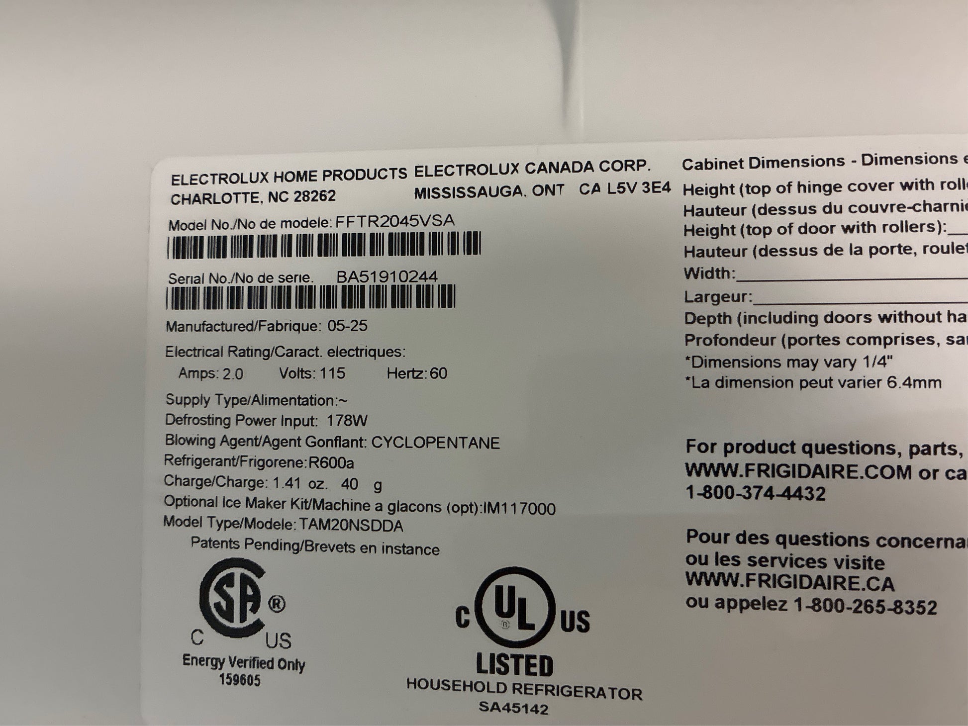 The Frigidaire 20 cu. ft. top freezer refrigerator fits in the same sized cutout as a traditional 18 cu. ft. model. This refrigerator features the EvenTemp Cooling System, precise temperature control which keeps food at one ideal temperature. Spacious interior storage options include a full-width deli drawer, generous door bins, and a full-width glass freezer shelf.. Appliance Category: Refrigerator. Appliance Series: Not Applicable. Appliance Type: Top Freezer Refrigerator. Built-In and Standard Type: Top Freezer. Color - Appliance Cabinet: Stainless Look. Color - Door Handle(s): Stainless Steel. Color/Finish: Stainless Steel. Color/Finish Family: Stainless Steel. Defrost Type: Frost Free. Dispenser Location: No Dispenser. Door Finish: Smooth. Energy Consumption (kWh/year): 427. Energy Efficiency Tier Rating: Not CEE rated. Freezer Capacity (cu. ft.): 5.4 cu ft. Freezer Door Type: Swing Door. Freezer Features: In-door Storage. Freezer Type: Top Door Freezer. General Features: No Additional Features. Handle Type: Recessed Handle. Hardware Color/Finish: White. Hardware Color/Finish Family: White. Ice Maker Features: No Ice Maker. Ice/Water Dispenser: None. Indoor/Outdoor: Indoor. Installation Depth: Standard Depth. Installation Type: Free Standing. Number of Doors: 2 Door. Number of Freezer Baskets/Bins: 2 Baskets/Bins. Number of Freezer Shelves: 1 Shelf. Number of Refrigerator Shelves: 2 Shelves. Operational Features: Humidity Controlled Crisper. Product Weight (lb.): 166 lb. Refrigeration Dispenser Features: No Dispenser. Refrigerator Capacity (cu. ft.): 14.6 cu ft. Returnable: Non-Returnable. Shelf Material - Freezer: Glass. Shelf Material - Refrigerator: Glass. Storage Features: Adjustable Door Storage,Deli Drawer,Gallon Door Storage,Slide-Out Fresh Food Shelves,Spill Proof Shelves. Temperature Control Type: Internal Electric. Total Capacity (cu. ft.): 20 cu ft. Water Filter Replacement Model#: N/A. Certifications and Listings: ADA Compliant,UL Listed. Depth (Excluding Handles) (in.): 28.25 in. Depth (Including Handles) (in.): 32 in. Depth (Less Door) (in.): 28.25 in. Depth With Door Open 90 Degrees (in.): 58.625. Height to Top of Door Hinge (in.): 66.375 in. Height to Top of Refrigerator Case (in.): 65.875 in. Product Depth (in.): 32 in. Product Height (in.): 66.375 in. Product Width (in.): 30 in. Refrigerator Width (in.): 30 in. Total Capacity (cu. ft.): 20 cu ft. Height to Top (in.): 65.875 in. Installation Depth: Standard Depth. Ice Maker Features: No Ice Maker. Depth (Excluding Handles) (in.): 28.25 in. Height to Top of Door Hinge (in.): 66.375 in. No of Doors: 2 Door. Dispenser Location: No Dispenser