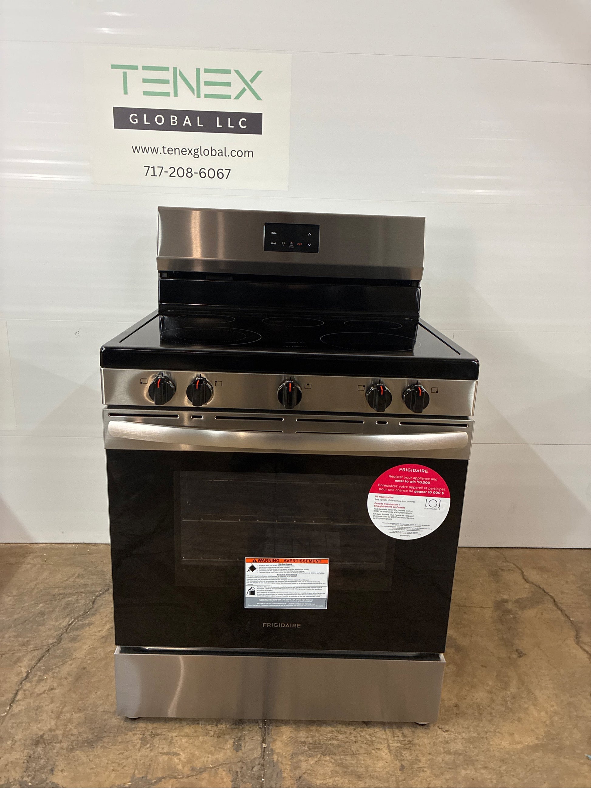 The Frigidaire 30 Electric Range allows you to get meals on the table faster with our 3,000W Quick Boil Element. Enjoy more cooktop flexibility with five cooktop elements designed to handle all of your cooking needs, include the SpaceWise Dual Expandable Element. Plus, enjoy our redesigned Extra Wide Store-More Storage Drawer, now with more space to store your unused oven racks and cookware. Get meals to the table faster with the powerful 3,000W Quick Boil element. Experience ultimate cooking flexibility with a cooktop that has five elements designed to handle all of your cooking needs. Get consistent results every time with our Even Baking Technology. Get two elements in one with the Dual Expandable element - a 6 inner ring for smaller pots and pans and a 9 outer ring for larger cookware. Large 5.3 cu ft oven capacity allows you to cook more at once. Our redesigned Store-More Storage drawer is now even wider - allowing you to store any unused oven racks, baking trays and more. Keep food warm until everything - and everyone - is ready. Proudly Assembled in the USA. Manual clean oven. Appliance Color/Finish: Stainless steel. Handle Color: Stainless steel. Manufacturer Color/Finish: Stainless Steel. Type: Freestanding. Adjustable Height: Yes. Capacity (Cu. Feet): 5.3. Cutout Depth (Inches): 26. Cutout Height (Inches): 45. Cutout Width (Inches): 30. Depth (Inches): 26. Element #1 Size: 9-in. Element #2 Size: 6-in. Element #3 Size: 6-in/9-in. Element #4 Size: 6-in. Element #5 Size: 5-in. Maximum Assembled Height (Inches): 47.75. Minimum Assembled Height (Inches): 46.75. Popular Widths: 30-in. Range Size (Inches): 30. Usable Oven Interior (H x W x D): 18.125 x 25.1875 x 19.875. Width (Inches): 30. ADA Compliant: No. Adjustable Cleaning Levels: No. Air Fry: No. Air Sous Vide: No. Appliance Type: Single oven electric range. Automatic Convection Conversion: No. Automatic Shut-Off: No. Bridge Element: No. Cleaning Method: Manual cleaning. Control Location: Behind elements. Control Lockout: No. Convection Element Type: None. Convection Oven: No. Cooking Surface Control Type: Knobs. Cooking Surface Type: Smooth surface. Customizable: No. Dehydrator Oven: No. Delay Bake: No. Digital Display: Yes. Door Lock: No. Downdraft Exhaust: No. Dual/Triple Element: Yes. Element #1 Wattage: 3000. Element #2 Wattage: 1200. Element #3 Wattage: 3000. Element #4 Wattage: 1200. Element #5 Wattage: 100. Element #6 Wattage: 0. Favorite Setting: No. Fingerprint-Resistant: No. Food Temperature Probe: No. Fuel Type: Electric. Glide/Rollout Racks: No. Half/Split Rack: No. Hidden Bake Element: No. Hot Surface Indicator Lights: Yes. Hub Required: No. Induction Cooking: No. Installation Type: Freestanding. Interior Light(s) Type: Halogen. Keep Warm Setting: Yes. Light(s) Control: Oven light touch pad. Lowe's Exclusive: No. Number of Cooking Zones: 5 burners. Number of Oven Rack Positions: 6. Number of Racks: 2. Oven Control Type: Electronic. Pan Size Sensor: No. Power Cord Included: No (sold separately). Power Element: Yes. Power Source: Electric. Professional: No. Proofing: No. Rapid Preheat: No. Removable Washable Trays: No. Sabbath Mode: No. Self-Cleaning Oven Racks: No. Simmer Element: No. Single/Double Oven: Single. Steam Cook: No. Temperature-Sensor Baking: No. Time Bake: No. True Convection: No. Voice Controlled: No. Warming Drawer: No. App Compatibility: No. Bluetooth Compatibility: No. Matching Gas (Model #): FCRG3052AS. Matching Previous (Model #): FCRE3052AS. Smart Compatible: No. Wi-Fi Compatibility: No. Works with Amazon Alexa: No. Works with Android: No. Works with Apple HomeKit: No. Works with iOS: No. Works with SmartThings: No. Works with Sonos: No. Works with the Google Assistant: No. CA Residents: Prop 65 Warning(s): Yes. ENERGY STAR Certified: No. Safety Listing: UL safety listing. UNSPSC: 52141500.