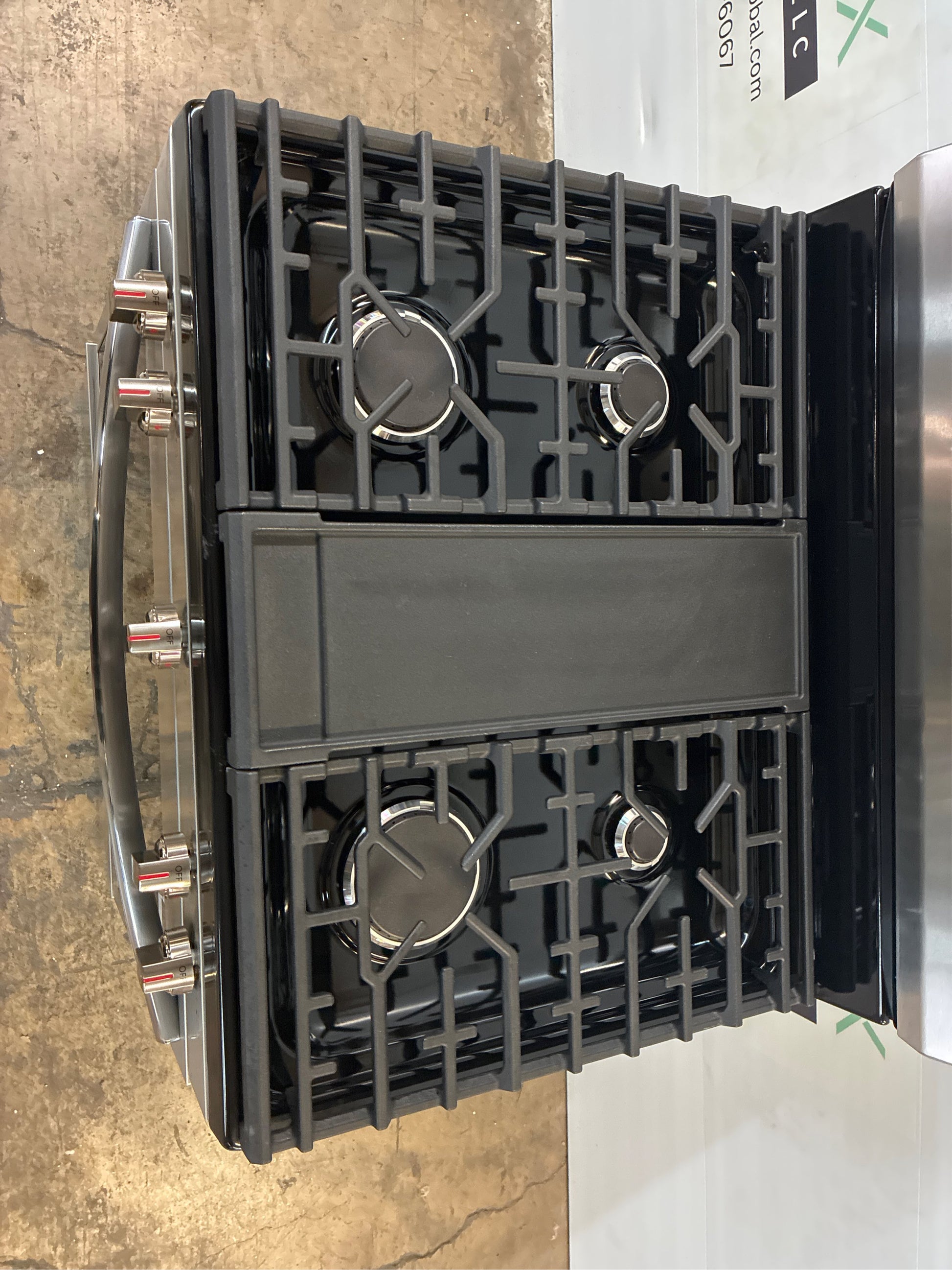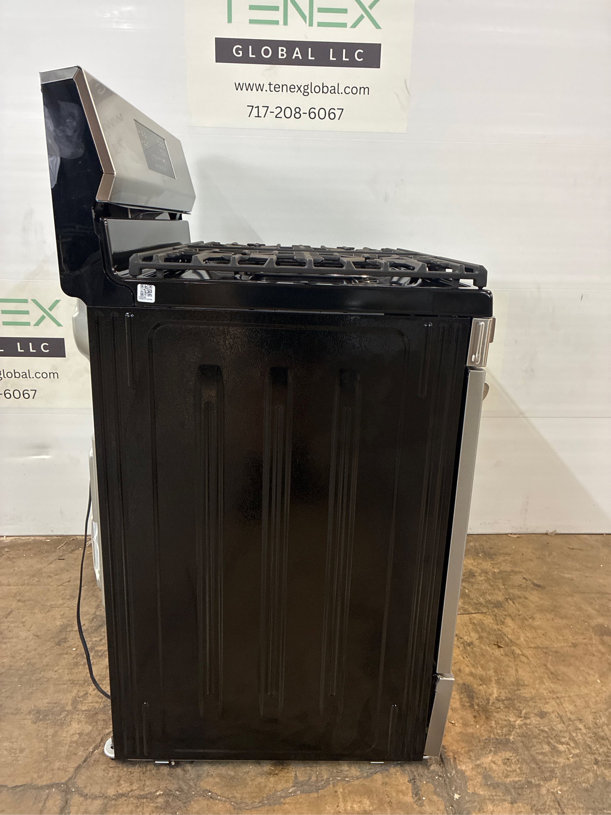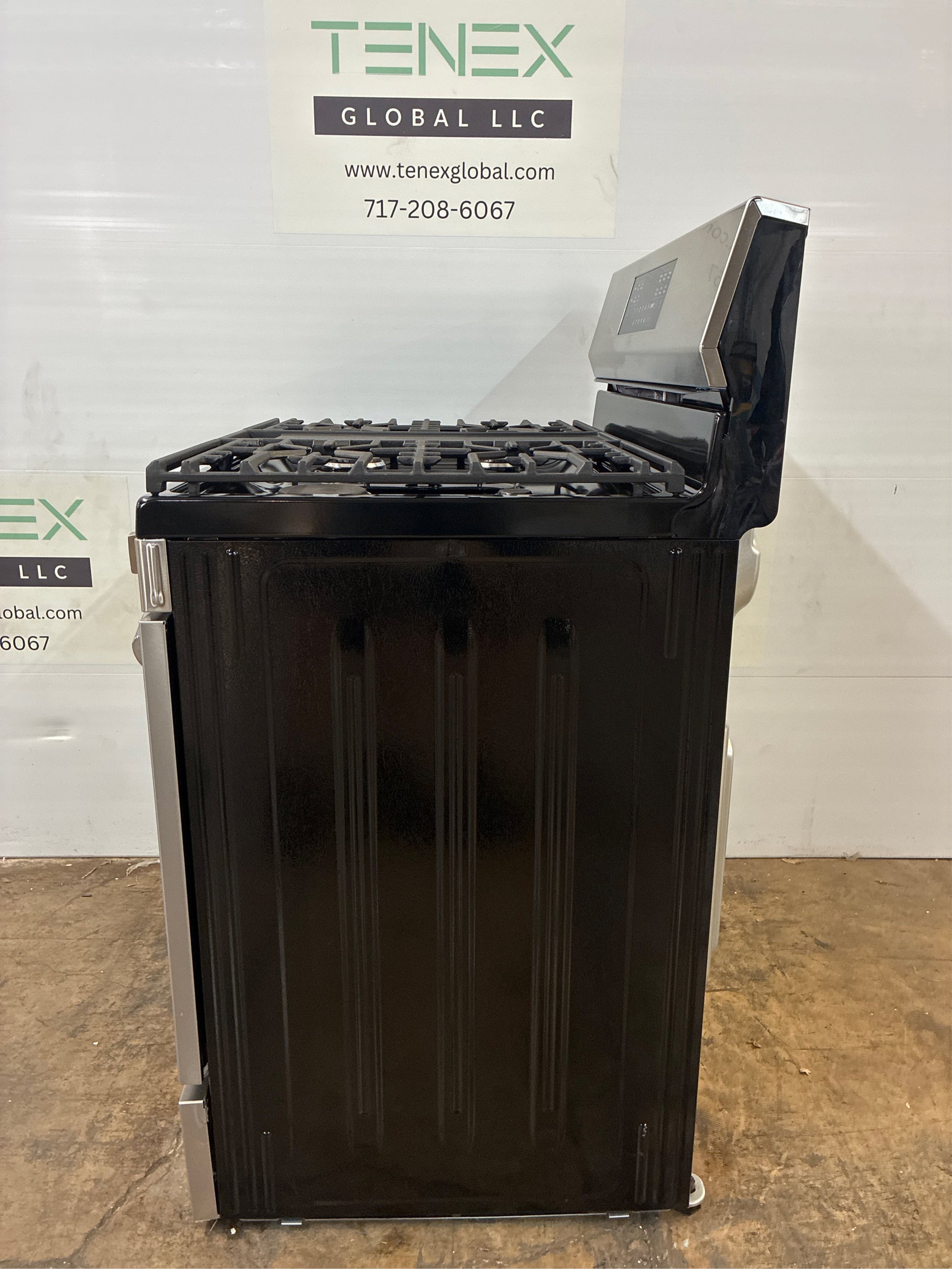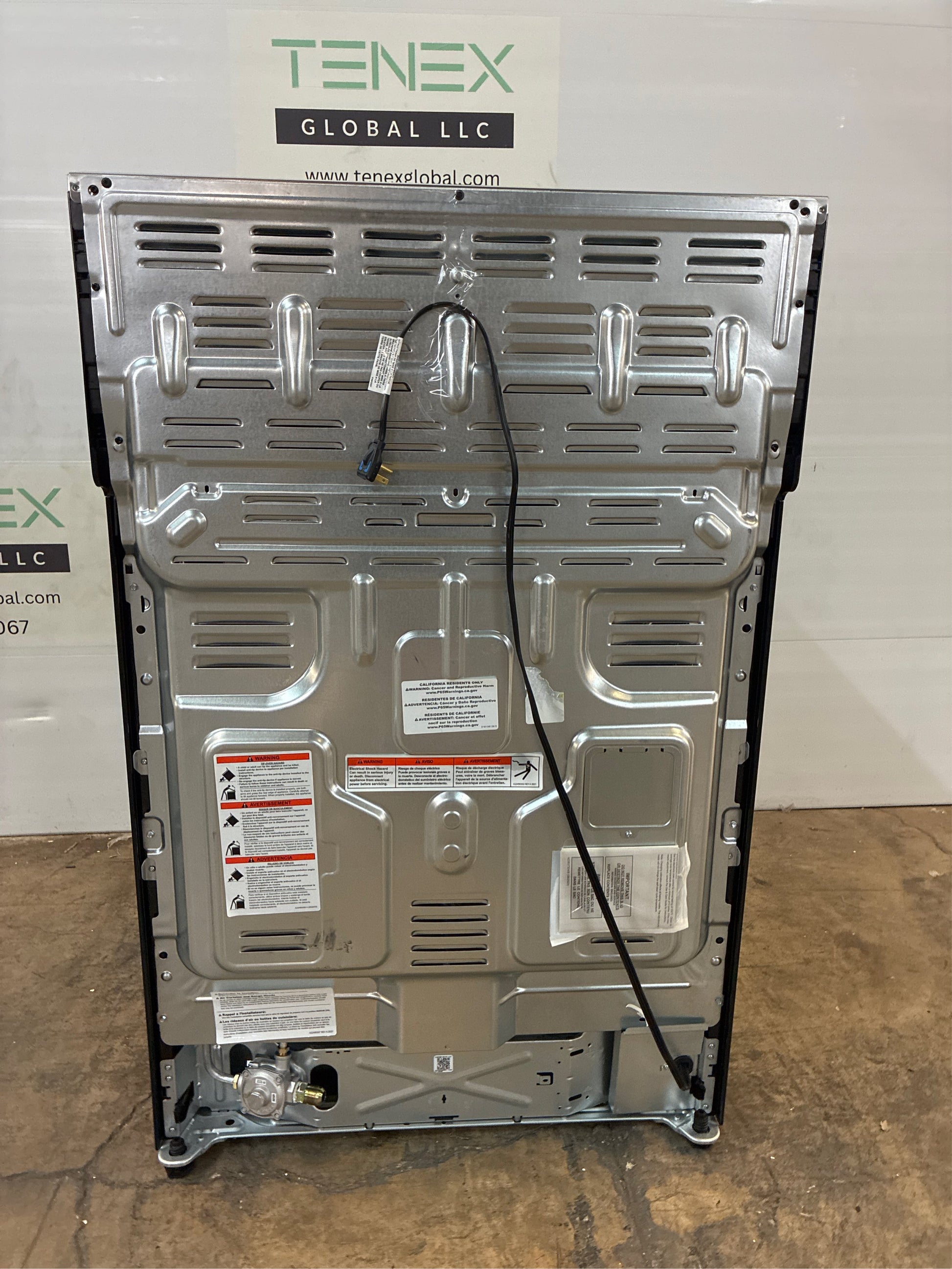 The Frigidaire Gallery 30 Rear Control Gas Range features our most powerful and advanced convection system, Total Convection, enabling so many cooking modes like No Preheat, Air Fry, Slow Cook, Steam Bake, Steam Roast, Air Sous Vide, Convection Roast, Convection Bake and more! The flexible five burner cooktop includes a powerful 18,000 BTU Quick Boil Burner and a center oval burner with an integrated cast iron griddle. Also includes our fingerprint resistant finish.. Appliance Category: Range. Appliance Series: Frigidaire Gallery. Appliance Type: Gas Range. Burner Grate Material: Cast Iron. Burner No.1 BTU: 18000. Burner No.2 BTU: 5000. Burner No.3 BTU: 14000. Burner No.4 BTU: 10000. Burner No.5 BTU: 10000. Capacity of Oven (cu. ft.): 5.1 cu ft. Cleaning Type: Self Cleaning. Color of Cooktop: Black. Color/Finish: Smudge-Proof Stainless Steel. Color/Finish Family: Stainless Steel. Commercial/Residential: Residential. Control Type: Electronic. Controls Location: Back Control. Cooktop Features: Continuous Grates,Digital Display,LP Convertible,Melting Burner,Sealed Burners,With Griddle. Cooktop Surface Type: Burner Grate. Drawer Type: Lower Storage Drawer. Fuel Type: Gas. Hardware Color/Finish: Stainless Steel. Hardware Color/Finish Family: Stainless Steel. Ignition Type: Electrical. Included: Bulb(s),Power Cord. Number of Burners: 5 burner. Number of Oven Racks: 2. Number of Rack Positions: 6. Oven Cleaning Options: Delay Clean,Self-Cleaning,Steam Clean. Oven Cooking Process: Air Fry,Air Sous Vide,Steam Oven,True Convection. Oven Features: Adjustable Leg Heights,Automatic Convection Conversion,Broiler in Oven,Delay Bake/Delay Start,Fingerprint Resistant,LED Display,Oven Light,Oven Temperature Probe,Sabbath Mode,Safety Lock. Product Weight (lb.): 190 lb. Range Installation Type: Freestanding. Returnable: Non-Returnable. Certifications and Listings: CSA Listed. Depth With Door(s) Open 90 Degrees (in.): 47.3125 in. Oven Interior Depth (in): 19.875. Oven Interior Height (in): 17.625. Oven Interior Width (in): 25.1875. Product Depth (in.): 26 in. Product Height (in.): 47.75 in. Product Width (in.): 30 in. Range Size (Width): 30 in.. Range Size (Width): 30 in.. Range Installation Type: Freestanding. No of Burners: 5 burner. Capacity (cu. ft.): 5.1 cu ft. Capacity (cu. ft.): 5.1 cu ft.. Cleaning Type: Self Cleaning. Oven Cooking Process: Air Fry. Drawer Type: Lower Storage Drawer