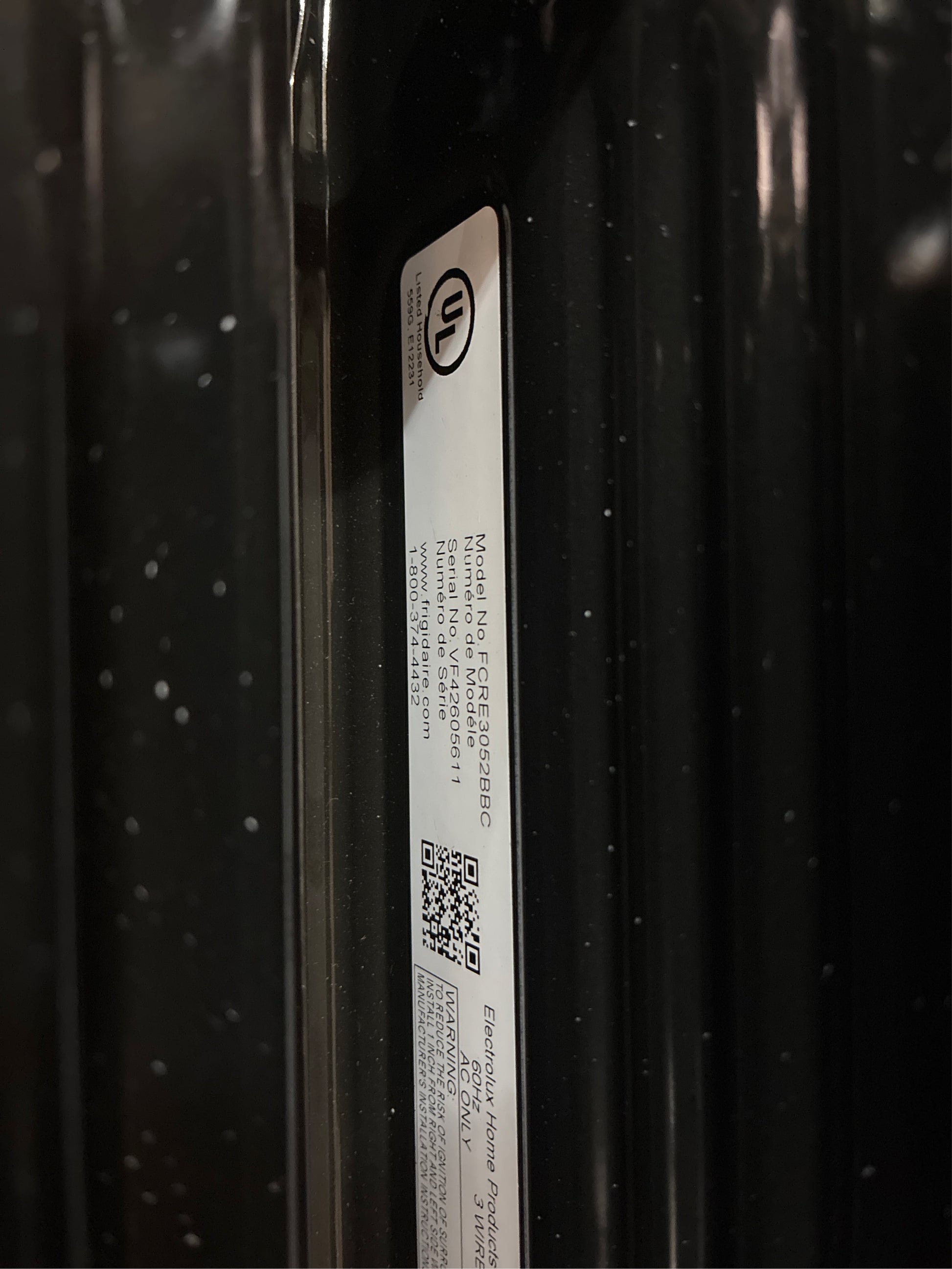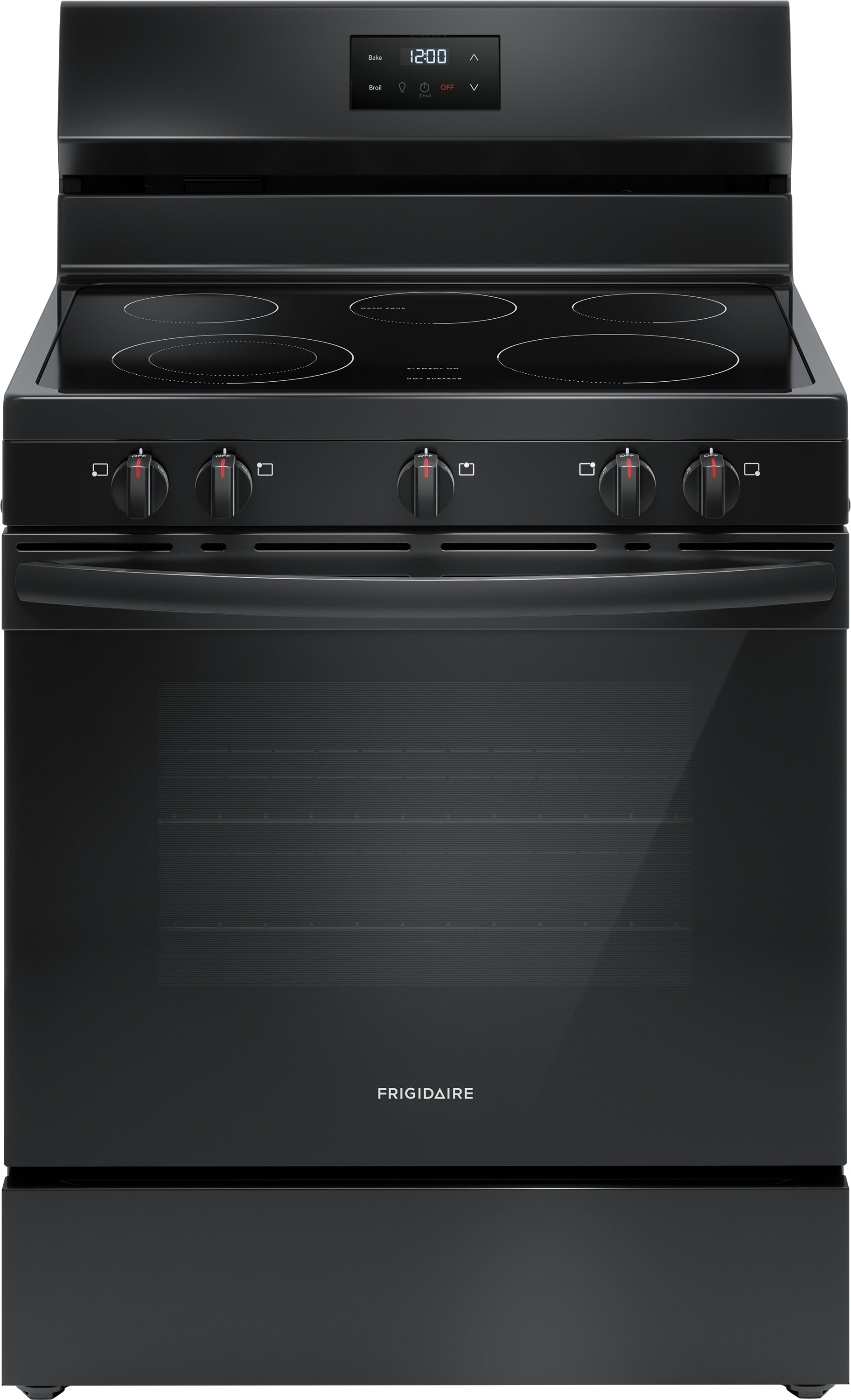The Frigidaire 30 Electric Range allows you to get meals on the table faster with our 3,000W Quick Boil Element. Enjoy more cooktop flexibility with five cooktop elements designed to handle all of your cooking needs, including the SpaceWise Dual Expandable Element. Plus, enjoy our redesigned Extra Wide Store-More Storage Drawer, now with more space to store your unused oven racks and cookware. Get meals to the table faster with the powerful 3,000W Quick Boil element. Experience ultimate cooking flexibility with a cooktop that has five elements designed to handle all of your cooking needs. Get consistent results every time with our Even Baking Technology. Get two elements in one with the Dual Expandable element - a 6 inner ring for smaller pots and pans and a 9 outer ring for larger cookware. Large 5.3 cu ft oven capacity allows you to cook more at once. Our redesigned Store-More Storage drawer is now even wider - allowing you to store any unused oven racks, baking trays and more. Keep food warm until everything - and everyone - is ready. Proudly Assembled in the USA. Manual clean oven. Appliance Color/Finish: Black. Handle Color: Black. Manufacturer Color/Finish: Black. Type: Freestanding. Adjustable Height: Yes. Capacity (Cu. Feet): 5.3. Cutout Depth (Inches): 26. Cutout Height (Inches): 45. Cutout Width (Inches): 30. Depth (Inches): 26. Element #1 Size: 9-in. Element #2 Size: 6-in. Element #3 Size: 6-in/9-in. Element #4 Size: 6-in. Element #5 Size: 5-in. Maximum Assembled Height (Inches): 47.75. Minimum Assembled Height (Inches): 46.75. Popular Widths: 30-in. Range Size (Inches): 30. Usable Oven Interior (H x W x D): 18.125 x 25.1875 x 19.875. Width (Inches): 30. ADA Compliant: No. Adjustable Cleaning Levels: No. Air Fry: No. Air Sous Vide: No. Appliance Type: Single oven electric range. Automatic Convection Conversion: No. Automatic Shut-Off: No. Bridge Element: No. Cleaning Method: Manual cleaning. Control Location: Behind elements. Control Lockout: No. Convection Element Type: None. Convection Oven: No. Cooking Surface Control Type: Knobs. Cooking Surface Type: Smooth surface. Customizable: No. Dehydrator Oven: No. Delay Bake: No. Digital Display: Yes. Door Lock: No. Downdraft Exhaust: No. Dual/Triple Element: Yes. Element #1 Wattage: 3000. Element #2 Wattage: 1200. Element #3 Wattage: 3000. Element #4 Wattage: 1200. Element #5 Wattage: 100. Element #6 Wattage: 0. Favorite Setting: No. Fingerprint-Resistant: No. Food Temperature Probe: No. Fuel Type: Electric. Glide/Rollout Racks: No. Half/Split Rack: No. Hidden Bake Element: No. Hot Surface Indicator Lights: Yes. Hub Required: No. Induction Cooking: No. Installation Type: Freestanding. Interior Light(s) Type: Halogen. Keep Warm Setting: Yes. Light(s) Control: Oven light touch pad. Lowe's Exclusive: No. Number of Cooking Zones: 5 burners. Number of Oven Rack Positions: 6. Number of Racks: 2. Oven Control Type: Electronic. Pan Size Sensor: No. Power Cord Included: No (sold separately). Power Element: Yes. Power Source: Electric. Professional: No. Proofing: No. Rapid Preheat: No. Removable Washable Trays: No. Sabbath Mode: No. Self-Cleaning Oven Racks: No. Simmer Element: No. Single/Double Oven: Single. Steam Cook: No. Temperature-Sensor Baking: No. Time Bake: No. True Convection: No. Voice Controlled: No. Warming Drawer: No. App Compatibility: No. Bluetooth Compatibility: No. Matching Gas (Model #): FCRG3052AB. Matching Previous (Model #): FCRE3052AB. Smart Compatible: No. Wi-Fi Compatibility: No. Works with Amazon Alexa: No. Works with Android: No. Works with Apple HomeKit: No. Works with iOS: No. Works with SmartThings: No. Works with Sonos: No. Works with the Google Assistant: No. CA Residents: Prop 65 Warning(s): Yes. ENERGY STAR Certified: No. Safety Listing: UL safety listing. UNSPSC: 52141500.
