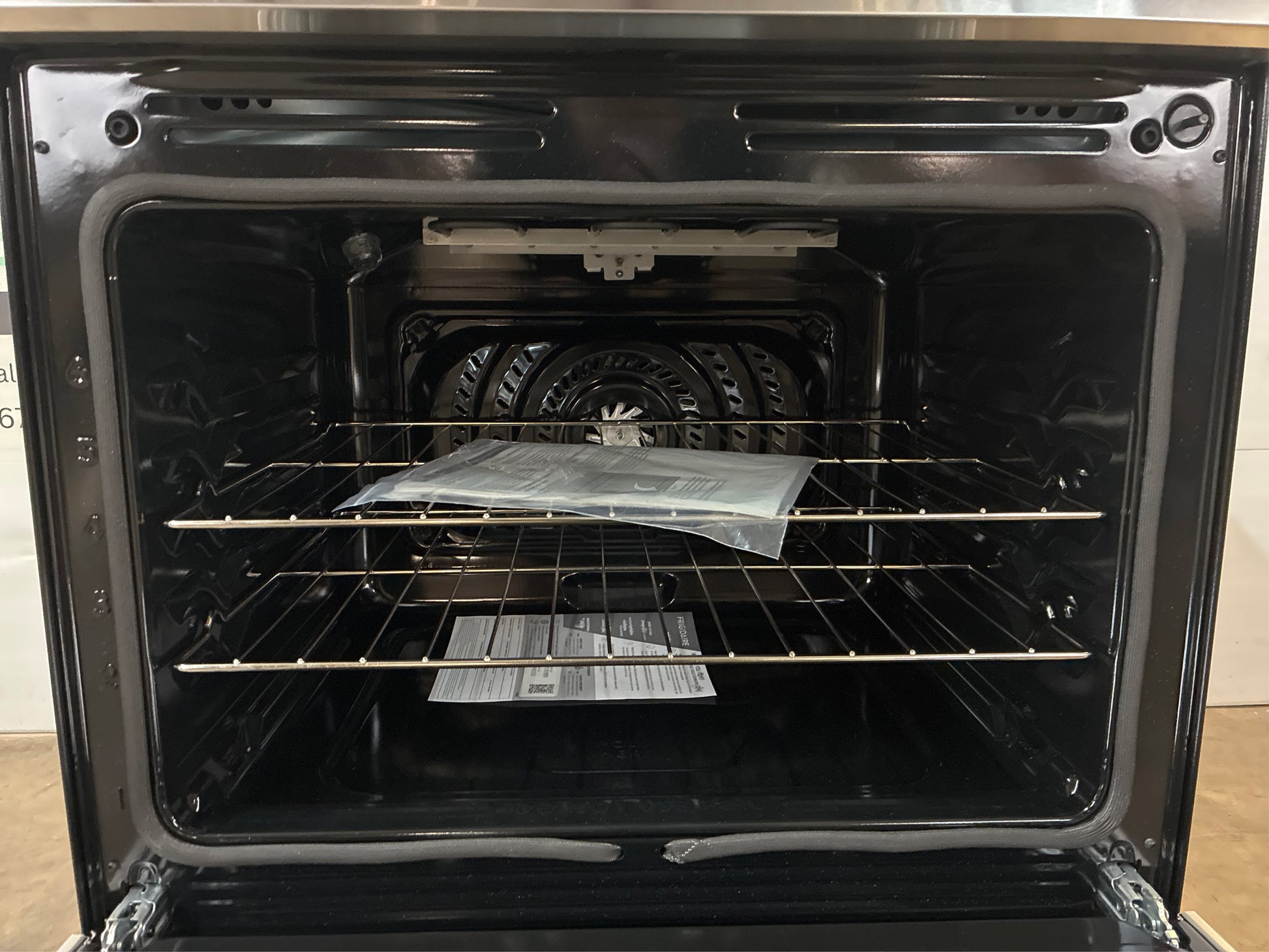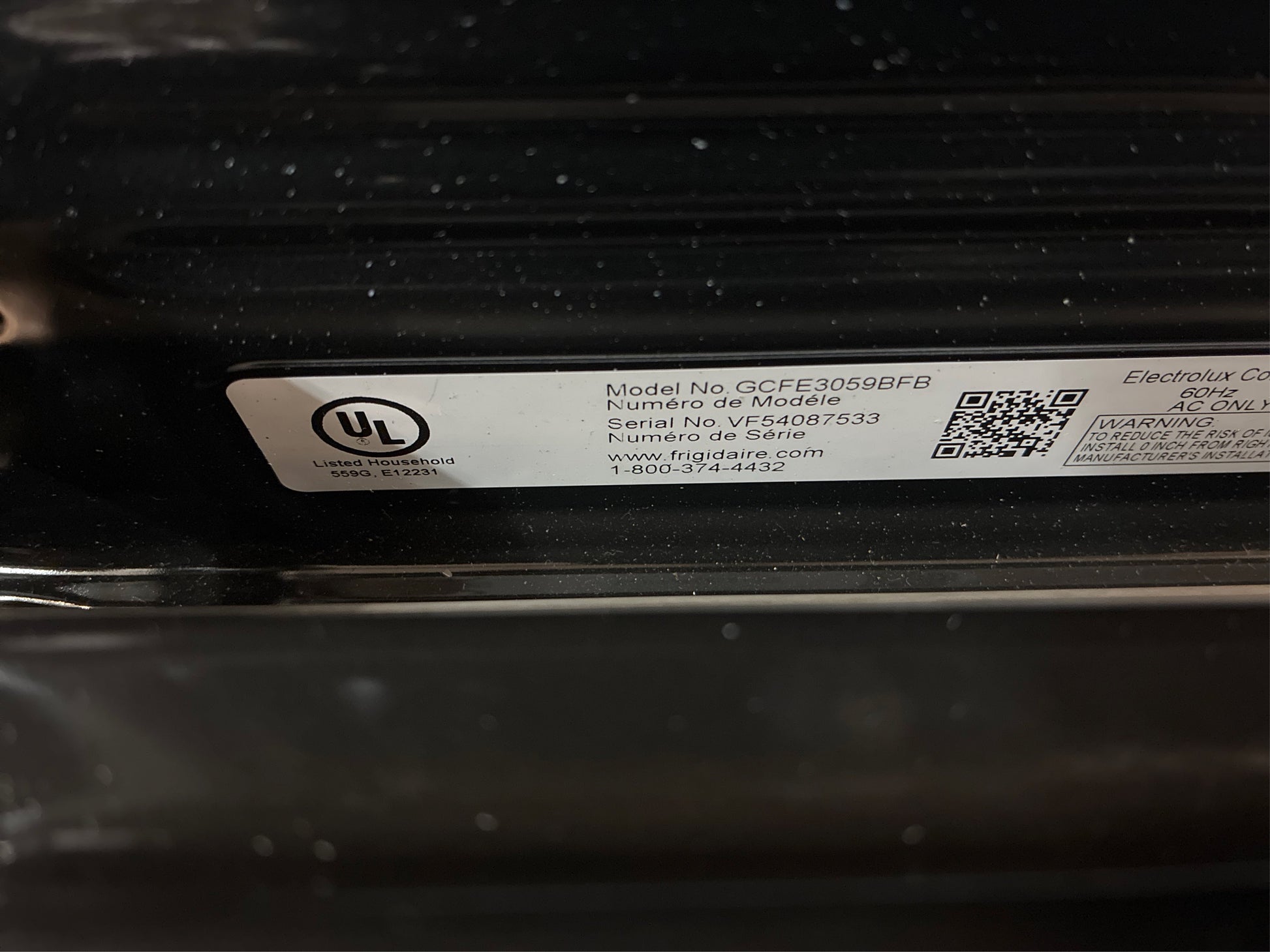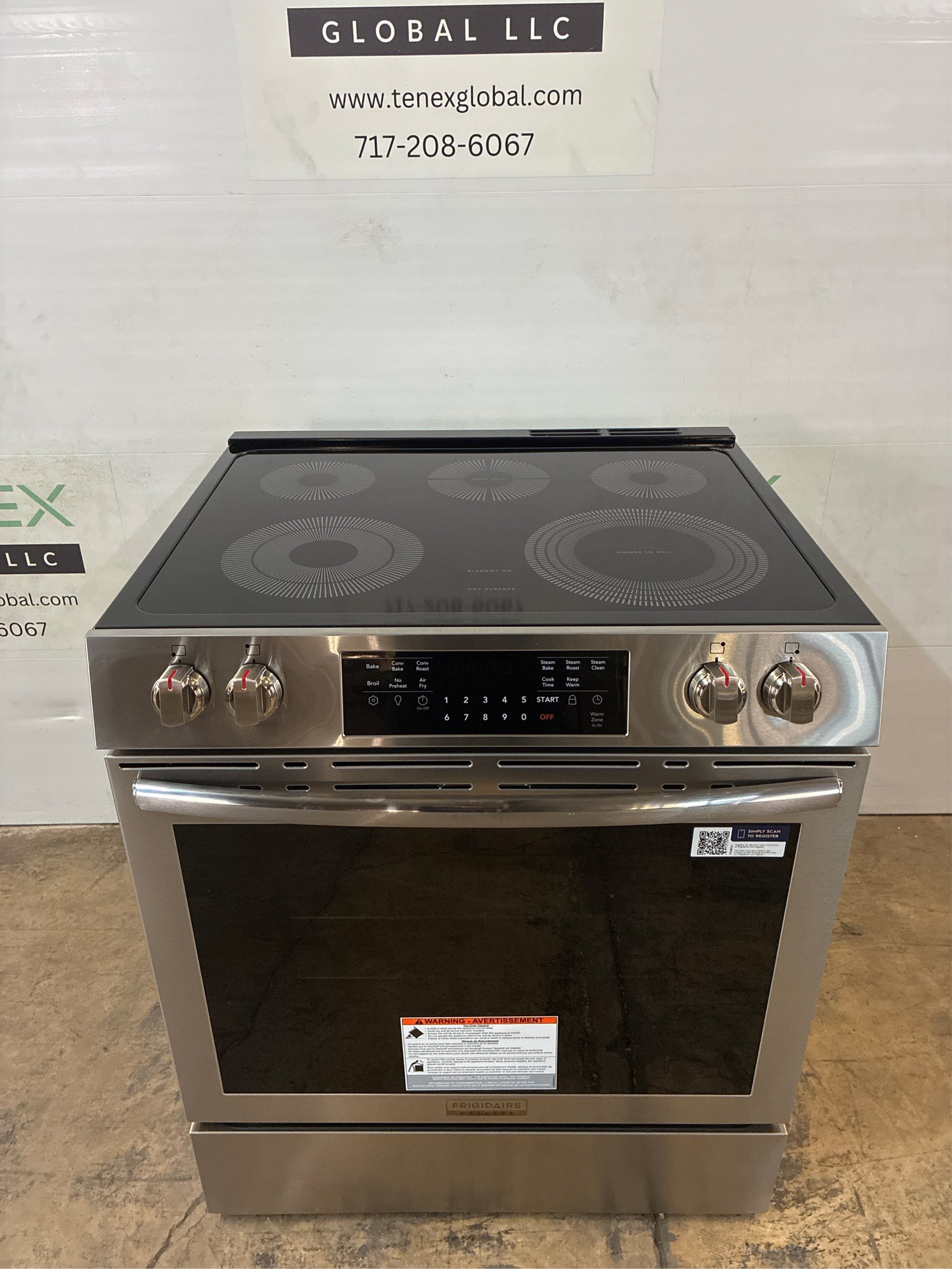 The Frigidaire Gallery 30 in. Front Control Gas Range features our most powerful and advanced convection system, Total Convection, enabling so many cooking modes like No Preheat, Air Fry, Slow Cook, Steam Bake, Steam Roast, Air Sous Vide, Convection Roast, Convection Bake and more, Enjoy time saving features like No Preheat and our convenient 30-minute oven Steam Clean that's chemical-free, odor-free and fast. Also includes our fingerprint resistant, Smudge-Proof Stainless Steel finish.. Amperage (A): 40 A. Appliance Category: Range. Appliance Series: Frigidaire Gallery. Appliance Type: Electric Range. Capacity of Oven (cu. ft.): 5.3 cu ft. Cleaning Type: Steam Clean. Color of Cooktop: Black. Color/Finish: Stainless Steel. Color/Finish Family: Stainless Steel. Commercial/Residential: Residential. Control Type: Mechanical. Controls Location: Front Control. Cooktop Features: Bridge Element,Digital Display,Indicator Light- Heating Element On,LP Convertible,Power Element,Smudge-Proof. Cooktop Surface Type: Glass Top. Drawer Type: Lower Storage Drawer. Element No.1 Type: Radiant. Element No.1 Wattage: 3200. Element No.2 Type: Radiant. Element No.2 Wattage: 1200. Element No.3 Type: Radiant. Element No.3 Wattage: 1400. Element No.4 Type: Radiant. Element No.4 Wattage: 3000. Element No.5 Type: Radiant. Element No.5 Wattage: 1200. Fuel Type: Electric. Hardware Color/Finish: Stainless Steel. Hardware Color/Finish Family: Stainless Steel. Included: Hardware,Power Cord. Number of Elements: 5 element. Number of Oven Racks: 2. Number of Rack Positions: 6. Oven Cleaning Options: Steam Clean. Oven Cooking Process: Air Fry,Air Sous Vide,Convection,Dehydrator Oven,Standard,Steam Oven,True Convection. Oven Features: Adjustable Leg Heights,Broiler in Oven,Delay Bake/Delay Start,Fingerprint Resistant,Oven Light,Sabbath Mode. Product Weight (lb.): 181 lb. Range Installation Type: Slide-In. Returnable: Non-Returnable. Voltage (V): 240 V. Certifications and Listings: Star-K,UL Listed. Depth With Door(s) Open 90 Degrees (in.): 47.3125 in. Element No.1 Size (in.): 3200 in. Element No.2 Size (in.): 6 in. Element No.3 Size (in.): 6 in. Element No.4 Size (in.): 3000 in. Element No.5 Size (in.): 5 in. Oven Interior Depth (in): 19.875. Oven Interior Height (in): 18.125. Oven Interior Width (in): 25.1875. Product Depth (in.): 26 in. Product Height (in.): 35.375 in. Product Width (in.): 30 in. Range Size (Width): 30 in.. Range Size (Width): 30 in.. Range Installation Type: Slide-In. Surface Type: Glass Top. Capacity (cu. ft.): 5.3 cu ft.. Capacity (cu. ft.): 5.3 cu ft. No of Elements: 5 element. Cleaning Type: Steam Clean. Oven Cooking Process: Convection