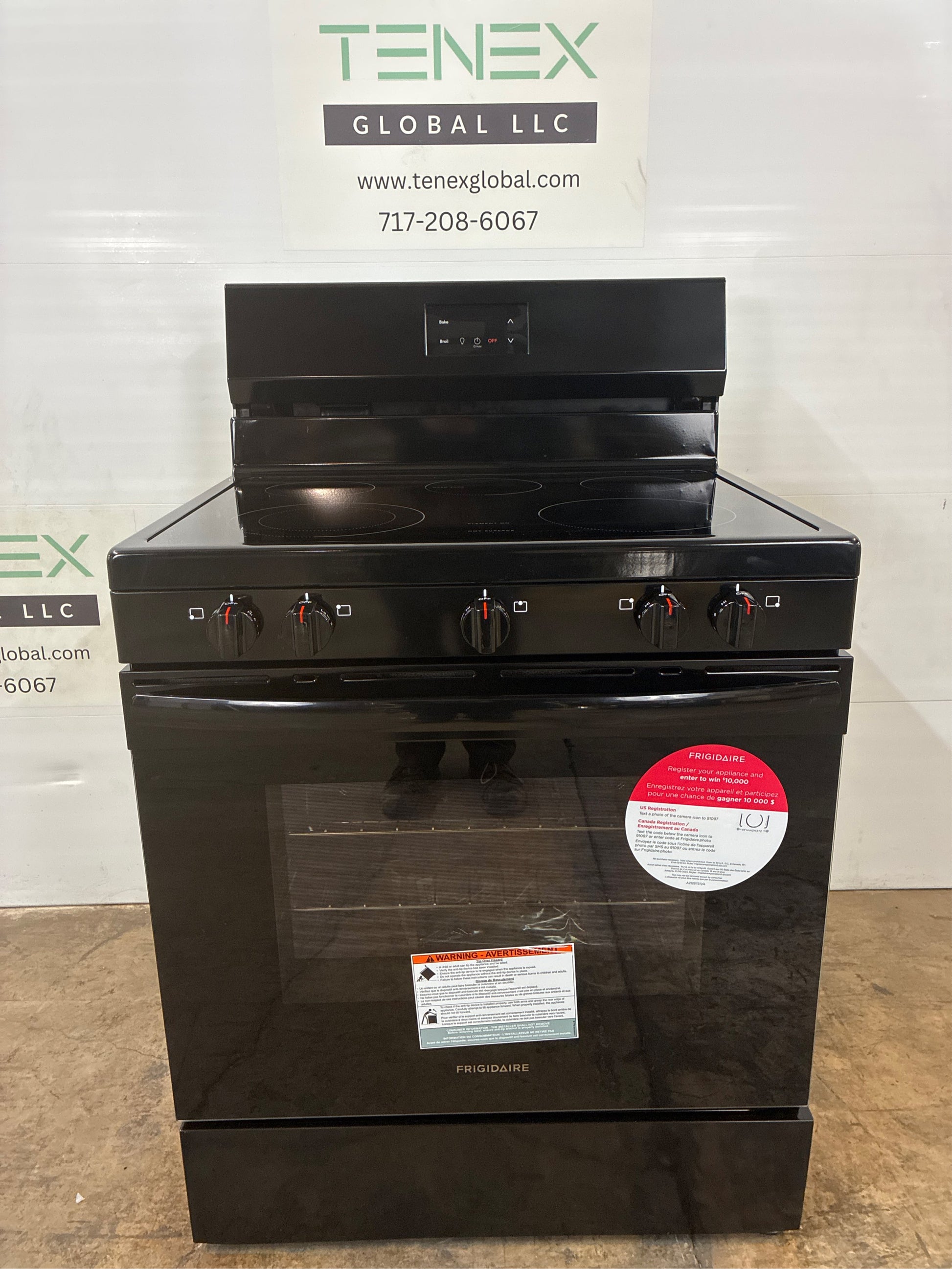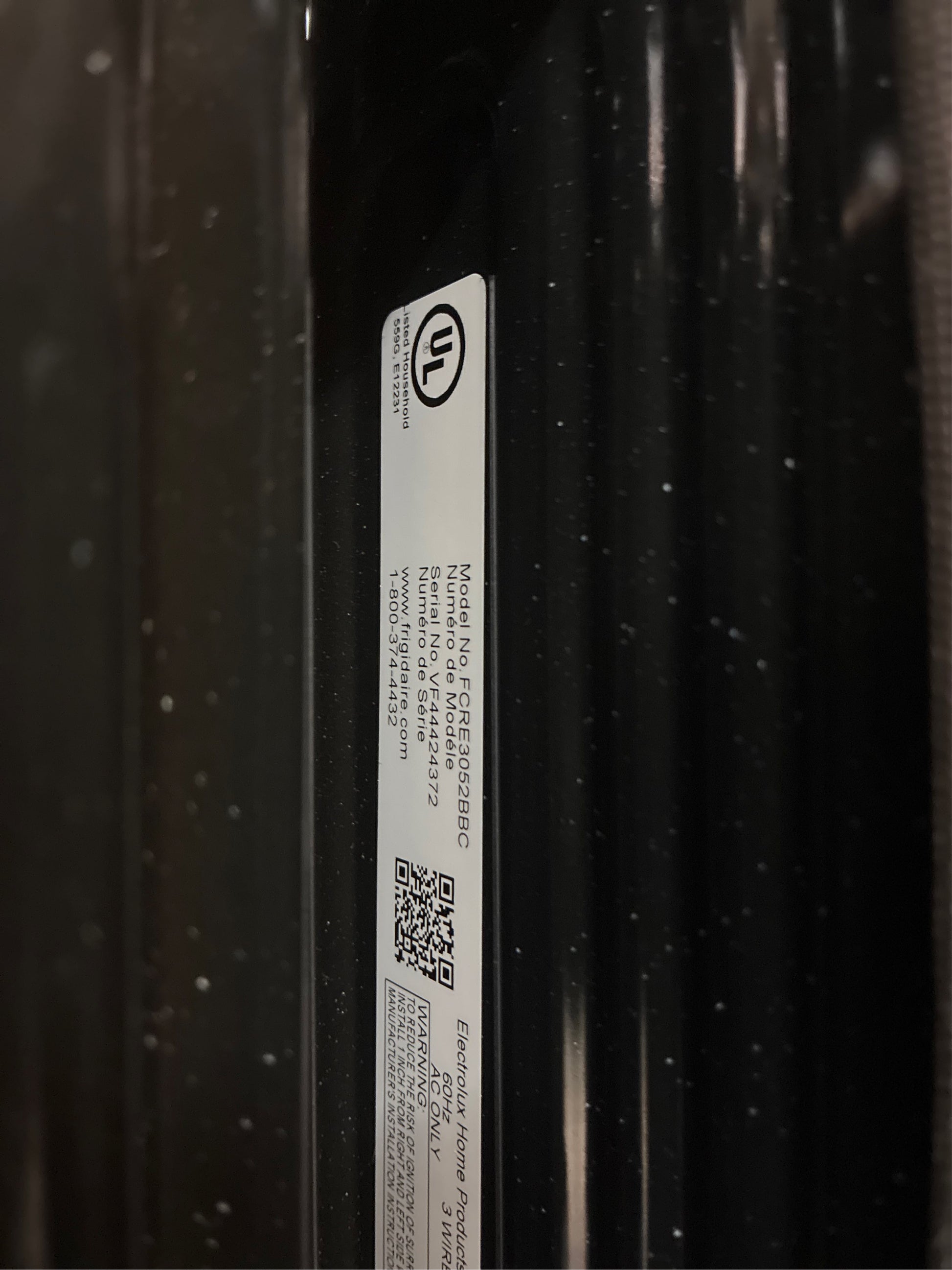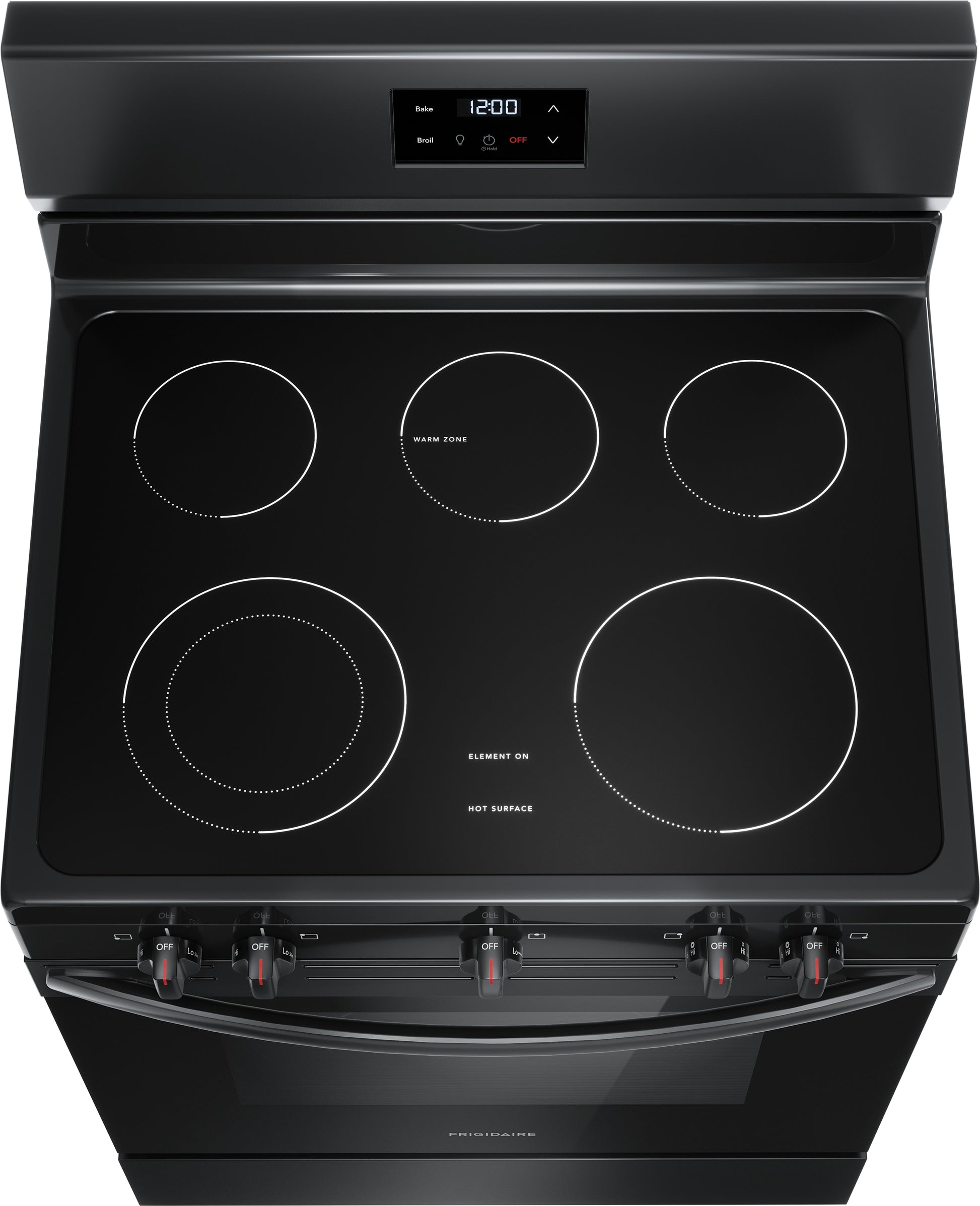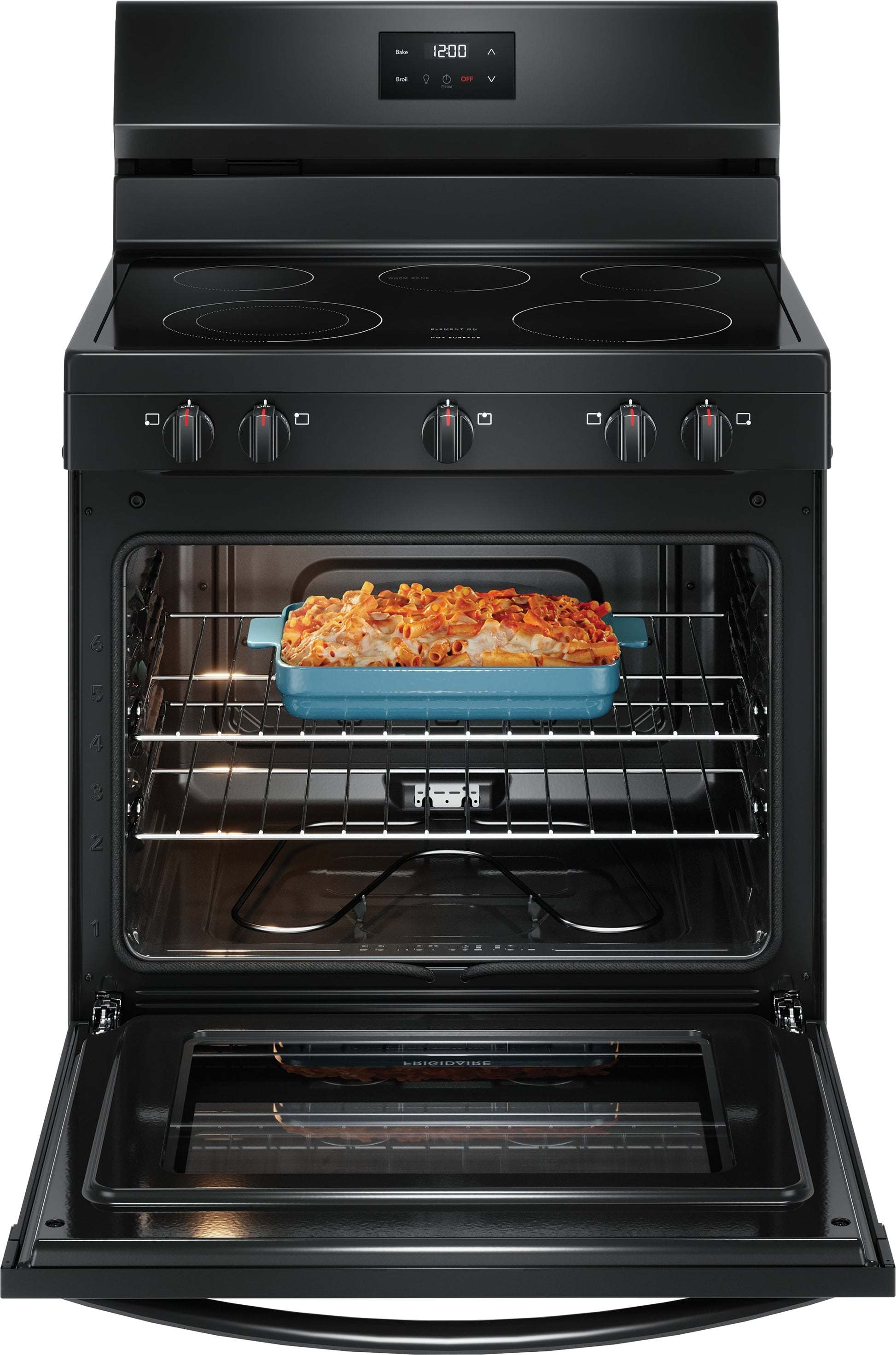 The Frigidaire 30 Electric Range allows you to get meals on the table faster with our 3,000W Quick Boil Element. Enjoy more cooktop flexibility with five cooktop elements designed to handle all of your cooking needs, including the SpaceWise Dual Expandable Element. Plus, enjoy our redesigned Extra Wide Store-More Storage Drawer, now with more space to store your unused oven racks and cookware. Get meals to the table faster with the powerful 3,000W Quick Boil element. Experience ultimate cooking flexibility with a cooktop that has five elements designed to handle all of your cooking needs. Get consistent results every time with our Even Baking Technology. Get two elements in one with the Dual Expandable element - a 6 inner ring for smaller pots and pans and a 9 outer ring for larger cookware. Large 5.3 cu ft oven capacity allows you to cook more at once. Our redesigned Store-More Storage drawer is now even wider - allowing you to store any unused oven racks, baking trays, and more. Keep food warm until everything - and everyone - is ready. Proudly Assembled in the USA. Manual clean oven. Appliance Color/Finish: Black. Handle Color: Black. Manufacturer Color/Finish: Black. Type: Freestanding. Adjustable Height: Yes. Capacity (Cu. Feet): 5.3. Cutout Depth (Inches): 26. Cutout Height (Inches): 45. Cutout Width (Inches): 30. Depth (Inches): 26. Element #1 Size: 9-in. Element #2 Size: 6-in. Element #3 Size: 6-in/9-in. Element #4 Size: 6-in. Element #5 Size: 5-in. Maximum Assembled Height (Inches): 47.75. Minimum Assembled Height (Inches): 46.75. Popular Widths: 30-in. Range Size (Inches): 30. Usable Oven Interior (H x W x D): 18.125 x 25.1875 x 19.875. Width (Inches): 30. ADA Compliant: No. Adjustable Cleaning Levels: No. Air Fry: No. Air Sous Vide: No. Appliance Type: Single oven electric range. Automatic Convection Conversion: No. Automatic Shut-Off: No. Bridge Element: No. Cleaning Method: Manual cleaning. Control Location: Behind elements. Control Lockout: No. Convection Element Type: None. Convection Oven: No. Cooking Surface Control Type: Knobs. Cooking Surface Type: Smooth surface. Customizable: No. Dehydrator Oven: No. Delay Bake: No. Digital Display: Yes. Door Lock: No. Downdraft Exhaust: No. Dual/Triple Element: Yes. Element #1 Wattage: 3000. Element #2 Wattage: 1200. Element #3 Wattage: 3000. Element #4 Wattage: 1200. Element #5 Wattage: 100. Element #6 Wattage: 0. Favorite Setting: No. Fingerprint-Resistant: No. Food Temperature Probe: No. Fuel Type: Electric. Glide/Rollout Racks: No. Half/Split Rack: No. Hidden Bake Element: No. Hot Surface Indicator Lights: Yes. Hub Required: No. Induction Cooking: No. Installation Type: Freestanding. Interior Light(s) Type: Halogen. Keep Warm Setting: Yes. Light(s) Control: Oven light touch pad. Lowe's Exclusive: No. Number of Cooking Zones: 5 burners. Number of Oven Rack Positions: 6. Number of Racks: 2. Oven Control Type: Electronic. Pan Size Sensor: No. Power Cord Included: No (sold separately). Power Element: Yes. Power Source: Electric. Professional: No. Proofing: No. Rapid Preheat: No. Removable Washable Trays: No. Sabbath Mode: No. Self-Cleaning Oven Racks: No. Simmer Element: No. Single/Double Oven: Single. Steam Cook: No. Temperature-Sensor Baking: No. Time Bake: No. True Convection: No. Voice Controlled: No. Warming Drawer: No. App Compatibility: No. Bluetooth Compatibility: No. Matching Gas (Model #): FCRG3052AB. Matching Previous (Model #): FCRE3052AB. Smart Compatible: No. Wi-Fi Compatibility: No. Works with Amazon Alexa: No. Works with Android: No. Works with Apple HomeKit: No. Works with iOS: No. Works with SmartThings: No. Works with Sonos: No. Works with the Google Assistant: No. CA Residents: Prop 65 Warning(s): Yes. ENERGY STAR Certified: No. Safety Listing: UL safety listing. UNSPSC: 52141500.