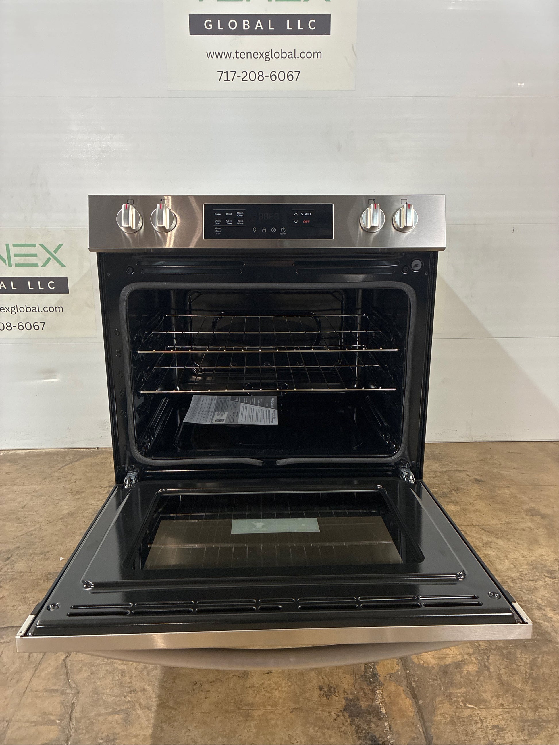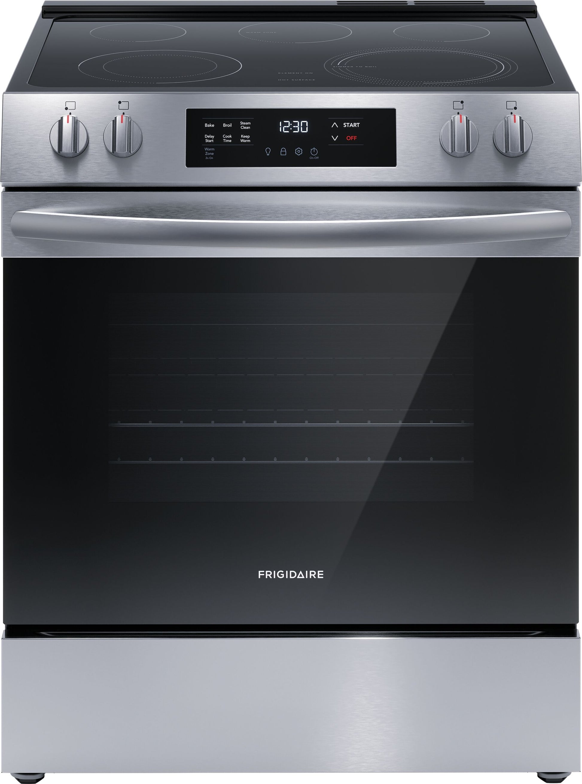 The Frigidaire 30 Front Control Electric Range with the EvenTemp cooktop element delivers consistent results every time, because it reduces hot and cold spots in your pan. Plus, enjoy easier cleanup with our Steam Clean cycle that provides a quick 30-minute oven cleaning that's chemical-free, odor-free and fast. With our EvenTemp cooktop technology, heat is evenly distributed across the element's surface, which reduces hot spots and cold areas in your pan. With five elements, this cooktop is designed to handle all of your cooking needs, including our powerful 3,200 Watt EvenTemp element, a Dual Expandable Element and a convenient Warm Zone. Designed to deliver even baking results, every time. 30 Minute Steam Clean that's chemical free, odor free and fast. Our convenient 2-in-1 element expands from 6 in for smaller pots to 9 in for larger cookware, providing more cooktop flexibility. Extra Wide Storage Drawer stores your unused baking racks. Cook more at once with our extra-large 5.3 cu ft capacity oven. Front control range gives a built-in look, without the remodel. Appliance Color/Finish: Stainless steel. Handle Color: Stainless steel. Manufacturer Color/Finish: Stainless steel. Type: Slide-In. Adjustable Height: Yes. Capacity (Cu. Feet): 5.3. Cutout Depth (Inches): 26. Cutout Height (Inches): 35.625. Cutout Width (Inches): 30. Depth (Inches): 26. Element #1 Size: 9-in. Element #2 Size: 6-in. Element #3 Size: 6-in/9-in. Element #4 Size: 6-in. Element #5 Size: 5-in. Maximum Assembled Height (Inches): 36.375. Minimum Assembled Height (Inches): 35.625. Popular Widths: 30-in. Range Size (Inches): 30. Usable Oven Interior (H x W x D): 18.125 x 25.1875 x 19.875. Width (Inches): 30. ADA Compliant: Yes. Adjustable Cleaning Levels: No. Air Fry: No. Air Sous Vide: No. Appliance Type: Single oven electric range. Automatic Convection Conversion: No. Automatic Shut-Off: Yes. Bridge Element: No. Bulb Type: Halogen. Cleaning Method: Steam cleaning. Control Location: In front of elements. Control Lockout: No. Convection Element Type: None. Convection Oven: No. Cooking Surface Control Type: Knobs. Cooking Surface Type: Smooth surface. Customizable: No. Dehydrator Oven: No. Delay Bake: Yes. Digital Display: Yes. Door Lock: Yes. Downdraft Exhaust: No. Dual/Triple Element: Yes. Element #1 Wattage: 3200. Element #2 Wattage: 1200. Element #3 Wattage: 3000. Element #4 Wattage: 1200. Element #5 Wattage: 100. Element #6 Wattage: 0. Favorite Setting: No. Fingerprint-Resistant: No. Food Temperature Probe: No. Fuel Type: Electric. Glide/Rollout Racks: No. Half/Split Rack: No. Hidden Bake Element: Yes. Hot Surface Indicator Lights: Yes. Hub Required: No. Induction Cooking: No. Installation Type: Slide-in. Interior Light(s) Type: Halogen. Keep Warm Setting: Yes. Light(s) Control: Oven light touch pad. Lowe's Exclusive: No. Number of Cooking Zones: 5 burners. Number of Oven Rack Positions: 6. Number of Racks: 2. Oven Control Type: Electronic. Pan Size Sensor: No. Power Cord Included: No (sold separately). Power Element: Yes. Power Source: Electric. Professional: No. Proofing: No. Rapid Preheat: No. Removable Washable Trays: No. Sabbath Mode: No. Self-Cleaning Oven Racks: No. Simmer Element: No. Single/Double Oven: Single. Temperature-Sensor Baking: No. Time Bake: Yes. True Convection: No. Voice Controlled: No. Warming Drawer: No. CA Residents: Prop 65 Warning(s): Yes. ENERGY STAR Certified: Yes. Safety Listing: UL safety listing. UNSPSC: 52141500.