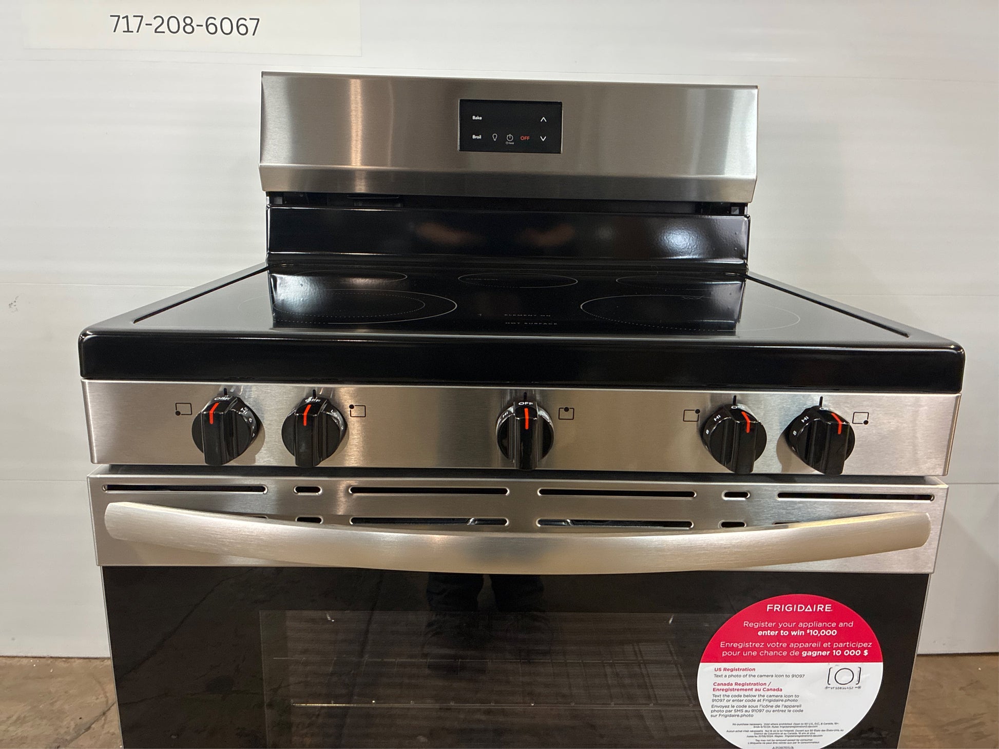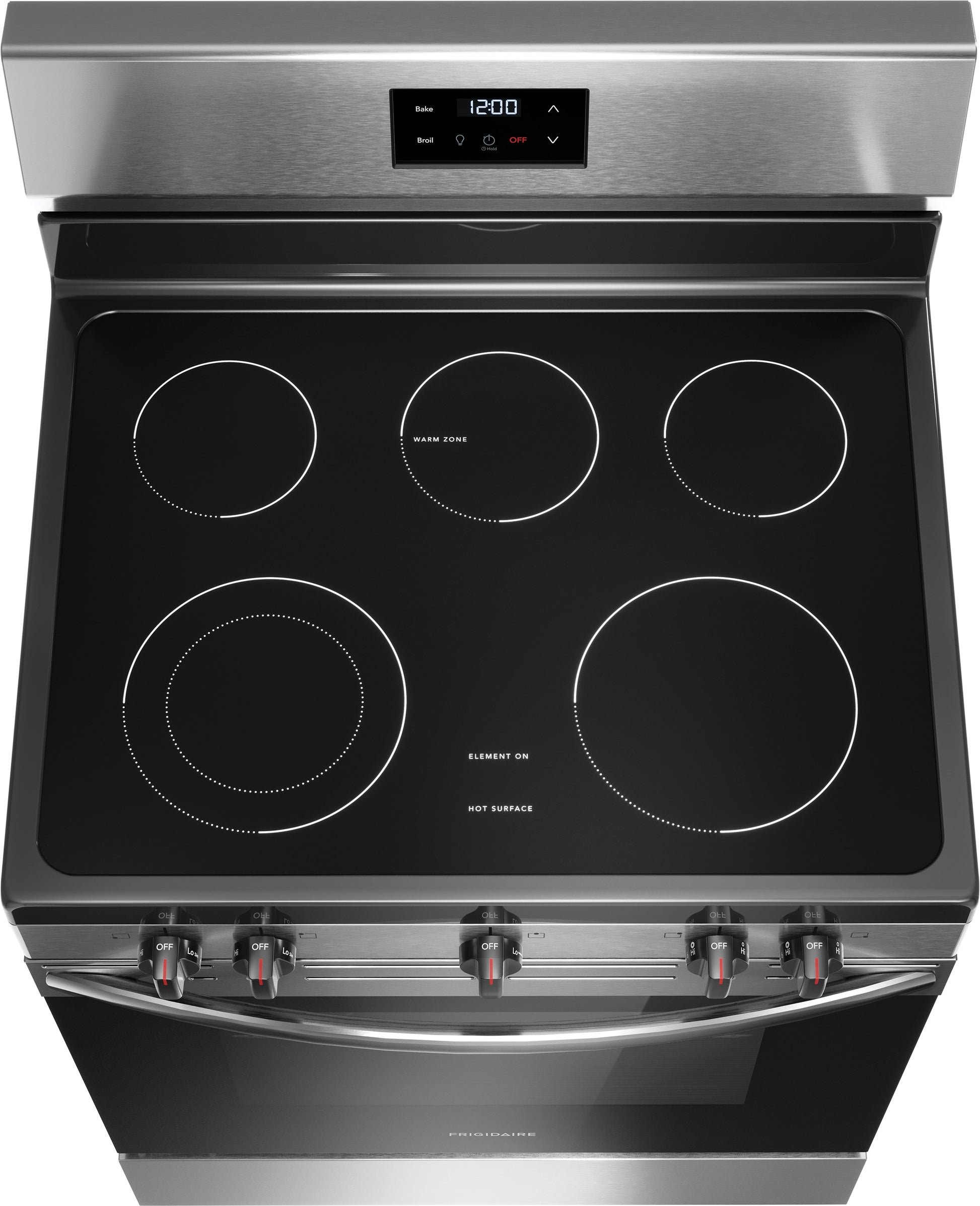 The Frigidaire 30 Electric Range allows you to get meals on the table faster with our 3,000W Quick Boil Element. Enjoy more cooktop flexibility with five cooktop elements designed to handle all of your cooking needs, include the SpaceWise Dual Expandable Element. Plus, enjoy our redesigned Extra Wide Store-More Storage Drawer, now with more space to store your unused oven racks and cookware. Get meals to the table faster with the powerful 3,000W Quick Boil element. Experience ultimate cooking flexibility with a cooktop that has five elements designed to handle all of your cooking needs. Get consistent results every time with our Even Baking Technology. Get two elements in one with the Dual Expandable element - a 6 inner ring for smaller pots and pans and a 9 outer ring for larger cookware. Large 5.3 cu ft oven capacity allows you to cook more at once. Our redesigned Store-More Storage drawer is now even wider - allowing you to store any unused oven racks, baking trays and more. Keep food warm until everything - and everyone - is ready. Proudly Assembled in the USA. Manual clean oven. Appliance Color/Finish: Stainless steel. Handle Color: Stainless steel. Manufacturer Color/Finish: Stainless Steel. Type: Freestanding. Adjustable Height: Yes. Capacity (Cu. Feet): 5.3. Cutout Depth (Inches): 26. Cutout Height (Inches): 45. Cutout Width (Inches): 30. Depth (Inches): 26. Element #1 Size: 9-in. Element #2 Size: 6-in. Element #3 Size: 6-in/9-in. Element #4 Size: 6-in. Element #5 Size: 5-in. Maximum Assembled Height (Inches): 47.75. Minimum Assembled Height (Inches): 46.75. Popular Widths: 30-in. Range Size (Inches): 30. Usable Oven Interior (H x W x D): 18.125 x 25.1875 x 19.875. Width (Inches): 30. ADA Compliant: No. Adjustable Cleaning Levels: No. Air Fry: No. Air Sous Vide: No. Appliance Type: Single oven electric range. Automatic Convection Conversion: No. Automatic Shut-Off: No. Bridge Element: No. Cleaning Method: Manual cleaning. Control Location: Behind elements. Control Lockout: No. Convection Element Type: None. Convection Oven: No. Cooking Surface Control Type: Knobs. Cooking Surface Type: Smooth surface. Customizable: No. Dehydrator Oven: No. Delay Bake: No. Digital Display: Yes. Door Lock: No. Downdraft Exhaust: No. Dual/Triple Element: Yes. Element #1 Wattage: 3000. Element #2 Wattage: 1200. Element #3 Wattage: 3000. Element #4 Wattage: 1200. Element #5 Wattage: 100. Element #6 Wattage: 0. Favorite Setting: No. Fingerprint-Resistant: No. Food Temperature Probe: No. Fuel Type: Electric. Glide/Rollout Racks: No. Half/Split Rack: No. Hidden Bake Element: No. Hot Surface Indicator Lights: Yes. Hub Required: No. Induction Cooking: No. Installation Type: Freestanding. Interior Light(s) Type: Halogen. Keep Warm Setting: Yes. Light(s) Control: Oven light touch pad. Lowe's Exclusive: No. Number of Cooking Zones: 5 burners. Number of Oven Rack Positions: 6. Number of Racks: 2. Oven Control Type: Electronic. Pan Size Sensor: No. Power Cord Included: No (sold separately). Power Element: Yes. Power Source: Electric. Professional: No. Proofing: No. Rapid Preheat: No. Removable Washable Trays: No. Sabbath Mode: No. Self-Cleaning Oven Racks: No. Simmer Element: No. Single/Double Oven: Single. Steam Cook: No. Temperature-Sensor Baking: No. Time Bake: No. True Convection: No. Voice Controlled: No. Warming Drawer: No. App Compatibility: No. Bluetooth Compatibility: No. Matching Gas (Model #): FCRG3052AS. Matching Previous (Model #): FCRE3052AS. Smart Compatible: No. Wi-Fi Compatibility: No. Works with Amazon Alexa: No. Works with Android: No. Works with Apple HomeKit: No. Works with iOS: No. Works with SmartThings: No. Works with Sonos: No. Works with the Google Assistant: No. CA Residents: Prop 65 Warning(s): Yes. ENERGY STAR Certified: No. Safety Listing: UL safety listing. UNSPSC: 52141500.