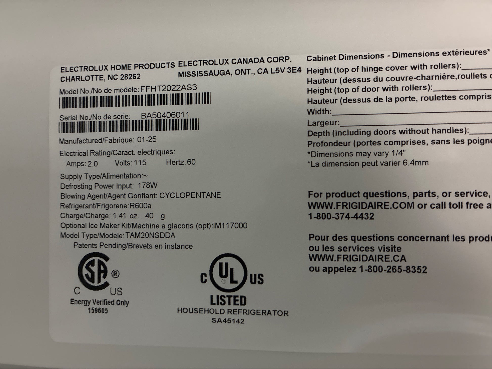 The Frigidaire 20 cubic foot top freezer refrigerator fits in the same sized cutout as a traditional 18 cu. ft. model. This refrigerator features the EvenTemp Cooling System, precise temperature control which keeps food at one ideal temperature. Spacious interior storage options include generous door bins and a full-width glass freezer shelves.. Appliance Category: Refrigerator. Appliance Series: Not Applicable. Appliance Type: Top Freezer Refrigerator. Built-In and Standard Type: Top Freezer. Color - Appliance Cabinet: Stainless Look. Color - Door Handle(s): Stainless Steel. Color/Finish: Stainless Steel. Color/Finish Family: Stainless Steel. Defrost Type: Auto / Cycle. Dispenser Location: No Dispenser. Door Finish: Smooth. Energy Consumption (kWh/year): 385. Energy Efficiency Tier Rating: Not CEE rated. Freezer Capacity (cu. ft.): 5.4 cu ft. Freezer Door Type: Swing Door. Freezer Features: In-door Storage. Freezer Type: Top Door Freezer. General Features: Door Alarm,Garage Ready,LED Light Type,Reversible Door Hinge,Self-Closing Door. Handle Type: Bar Handle. Hardware Color/Finish: Stainless Steel. Hardware Color/Finish Family: Stainless Steel. Ice Maker Features: No Ice Maker. Ice/Water Dispenser: None. Indoor/Outdoor: Indoor. Installation Depth: Standard Depth. Installation Type: Free Standing. Number of Doors: 2 Door. Number of Freezer Baskets/Bins: 2 Baskets/Bins. Number of Freezer Shelves: 1 Shelf. Number of Refrigerator Shelves: 2 Shelves. Operational Features: Self-Closing Door. Overall Product Height (in.): 66 in. Product Weight (lb.): 170 lb. Refrigeration Dispenser Features: No Dispenser. Refrigerator Capacity (cu. ft.): 14.6 cu ft. Returnable: Non-Returnable. Shelf Material - Freezer: Glass. Shelf Material - Refrigerator: Glass. Storage Features: Adjustable Door Storage,Adjustable Shelves/Racks,Crisper Drawer,Gallon Door Storage. Temperature Control Type: Internal Analog. Total Capacity (cu. ft.): 20 cu ft. Water Filter Replacement Model#: N/A. Certifications and Listings: ADA Compliant,UL Listed. Depth (Excluding Handles) (in.): 32 in. Depth (Including Handles) (in.): 35 in. Depth (Less Door) (in.): 28.25 in. Depth With Door Open 90 Degrees (in.): 58.625 in. Height to Top of Door Hinge (in.): 66.375 in. Height to Top of Refrigerator Case (in.): 65.875 in. Height to Top of Refrigerator Door (in.): 65.875 in. Product Depth (in.): 35 in. Product Height (in.): 66.375 in. Product Width (in.): 30 in. Refrigerator Width (in.): 30 in. Total Capacity (cu. ft.): 20 cu ft. Overall Product Height (in.): 66 in. Depth (Excluding Handles) (in.): 32 in. Height to Top (in.): 65.875 in. Ice Maker Features: No Ice Maker. Height to Top of Door Hinge (in.): 66.375 in. Installation Depth: Standard Depth. Features: Garage Ready