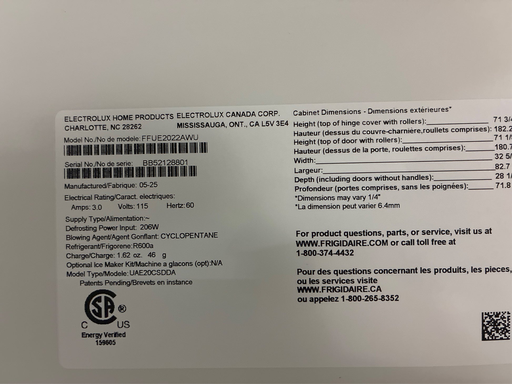 This Frigidaire 20 cu. ft. upright freezer includes a superior tight seal that locks in cold air, keeping food frozen for two days if there is a power outage and the EvenTemp Cooling System, with a variable speed compressor that constantly circulates cold air throughout the freezer with smart sensing technology that adjusts air flow to maintain a uniform temperature. The flexible interior organization system enables you to easily organize your family's frozen favorites with four adjustable, metallic wire shelves, deep bottom basket, and five spacious door bins. Additionally, enjoy the ability to maintain the ideal environment for your frozen foods with our audible temperature alarm that alerts you if the door is left open or the freezer's temperature rises, and auto-close doors, which ensure that your freezer is never left slightly open by mistake. Food stays frozen for 2 days with power outage assurance. Ensure a consistent temperature throughout fridge with EvenTemp. Organize and store your favorite frozen foods with 4 wire shelves. EvenTemp Cooling System - Our EvenTemp cooling system's variable speed compressor constantly circulates cold air throughout the freezer with smart sensing technology that adjusts air flow to maintain a uniform temperature. Flexible interior organization system - easily organize your family's frozen favorites with our 4 adjustable, metallic wire shelves, deep bottom basket, and 5 spacious door bins that allow you to make the most of every available square inch of your freezer. ENERGY STAR Most Efficient: Recognized as Most Efficient 20 cu ft. Upright Freezer by Energy Star 2023. Auto-close doors - avoid spoiled food and soupy ice cream with our auto-close doors, which ensure that your freezer is never left slightly open by mistake. Frost-free design - never waste time chipping away ice in your freezer again with our frost-free design that does the work for you. More capacity, same footprint - with this 20 cu. ft. upright freezer, you can have a freezer that fits into the same space as a traditional 17 cu. ft. model, but enjoy more capacity without sacrificing valuable floor space. Floor-projected power-on indicator - know at a glance that your freezer is keeping your favorites safely frozen and fresh with our power-on indicator light. Garage ready - place this unit in your garage without worry; this unit is designed to perform in temperatures ranging from 0 F to 110 F. Monitor the ideal environment for your frozen foods with our audible temperature alarm that alerts you if the door is left open or the freezer's temperature rises. Appliance Type: Upright Freezer. Bulk Storage Baskets (number): 5. Capacity (cu. ft.) - Freezer: 20 cu ft. Color/Finish: White. Color/Finish Family: White. Control Type: Manual. Defrost Type: Frost Free. Energy Consumption (kWh/year): 399. Freezer Features: Adjustable Leveling Legs, Adjustable Temperature Control, Garage Ready Freezer, In-door Storage, LED Light Type, Power On Light Indicator, Temperature Alarm. Freezer Type: Upright. Hardware Color/Finish: White. Hardware Color/Finish Family: White. Minimum Back Air Clearance (In): 1. Number of Shelves: 4. Product Weight (lb.): 155 lb. Reversible Door(s): Yes. Temperature Range: -10 degrees to 10 degrees Fahrenheit. Voltage (V): 115 V. Certifications and Listings: CSA Listed, Energy Star. Depth (Excluding Handles) (in.): 28.25 in. Depth (Including Handles) (in.): 28.25 in. Depth With Door Open 90 Degrees (in.): 58. Height to Top of Case (in.): 71.75 in. Height to Top of Door Hinge (in.): 71.75 in. Minimum Side Air Clearance (In): 0.375. Product Depth (in.): 28.25 in. Product Height (in.): 71.75 in. Product Width (in.): 32.625 in.