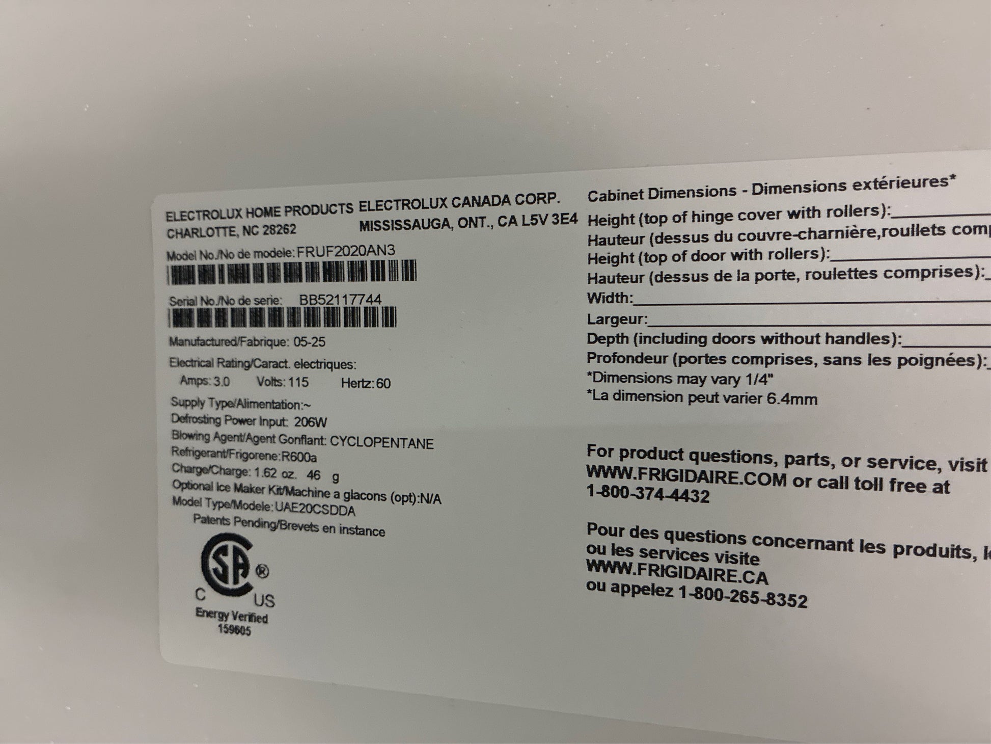 Model: FRUF2020AN