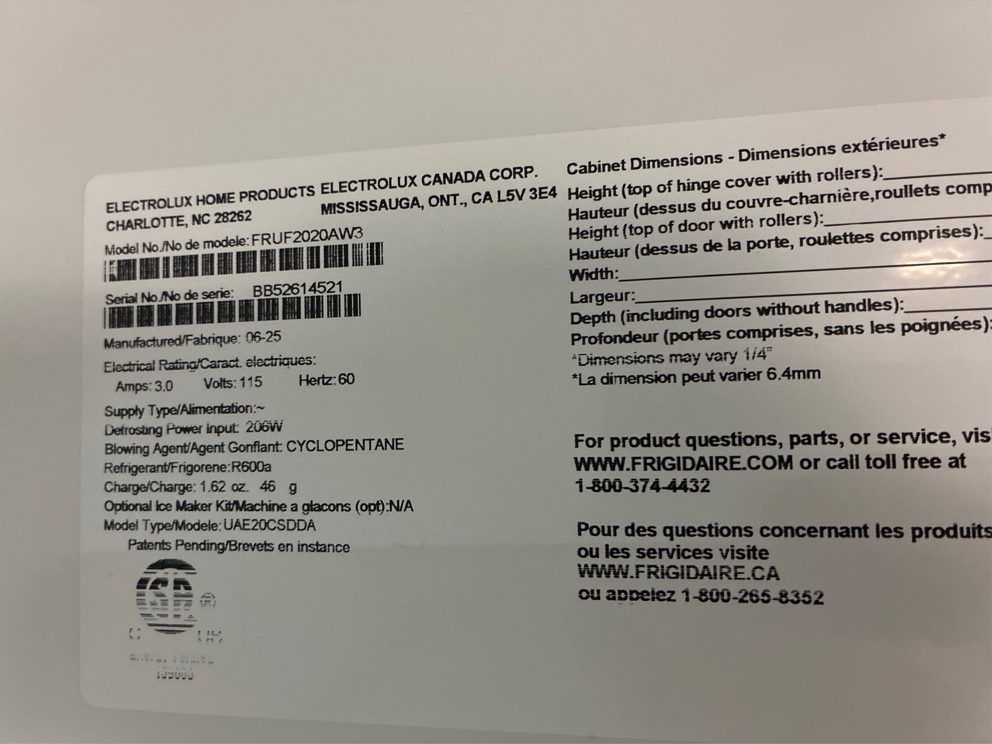 This 20 cu. ft. upright freezer allows you to conveniently store all of your favorite frozen food. The Flexible Interior Organization System easily organizes your family's favorites with our four adjustable, full-width glass shelves, deep bottom basket, and five spacious door bins that allow you to make the most of every available square inch of your freezer. Keep food frozen for two days if there is a power outage with our superior tight seal that locks in cold air. Place this unit in your garage without worry, it is designed to perform in temperatures ranging from 0 F to 110 F.. Appliance Series: Not Applicable. Appliance Type: Upright Freezer. Bulk Storage Baskets (number): 1. Capacity (cu. ft.) - Freezer: 20 cu ft. Color/Finish: White. Color/Finish Family: White. Control Type: Manual. Defrost Type: Auto / Cycle. Energy Consumption (kWh/year): 531. Freezer Features: Adjustable Leveling Legs,Adjustable Temperature Control,Garage Ready Freezer,In-door Storage,LED Light Type. Freezer Type: Upright. Hardware Color/Finish: White. Hardware Color/Finish Family: White. Minimum Back Air Clearance (In): 0.5. Number of Shelves: 4. Product Weight (lb.): 155 lb. Remote Access: No Remote Access. Returnable: Non-Returnable. Reversible Door(s): Yes. Temperature Range: 4 to -4. Voltage (V): 120 V. Certifications and Listings: CSA Listed. Depth (Excluding Handles) (in.): 28.25 in. Depth (Including Handles) (in.): 28.25 in. Depth With Door Open 90 Degrees (in.): 58 in. Height to Top of Case (in.): 71.75 in. Height to Top of Door Hinge (in.): 71.75 in. Minimum Side Air Clearance (In): 0.5. Product Depth (in.): 28.25 in. Product Height (in.): 71.75 in. Product Width (in.): 32.625 in. Capacity (cu. ft.): 20 cu ft. Capacity (cu. ft.) - Freezer: 20 cu ft. Defrost Type: Auto / Cycle. Freezer Features: Garage Ready Freezer. Freezer Features: Adjustable Temperature Control. Freezer Features: In-door Storage. Freezer Features: LED Light Type. Freezer Features: Adjustable Leveling Legs
