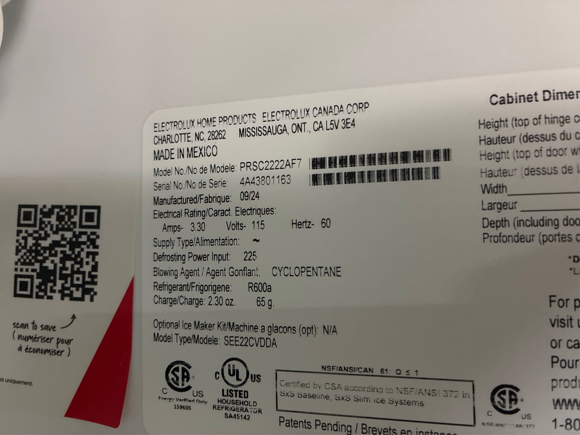 Frigidaire Professional 36 in. Counter-Depth Side-by-side refrigerator offers our advanced CrispSeal Plus Crisper. This crisper keeps produce fresh with a seal that blocks out dry air, plus an added filter reduces the gas that causes produce to ripen faster. It also features our EvenTemp Cooling System which keeps your food fresh by reacting quickly to temperature fluctuations and constantly circulates cold air throughout the fresh food and freezer compartments, ensuring a consistent cool from top to bottom.. Appliance Category: Refrigerator. Appliance Series: Frigidaire Professional. Appliance Type: Side-by-Side Refrigerator. Built-In and Standard Type: Side-by-Side. Color - Appliance Cabinet: Gray. Color - Door Handle(s): Stainless Steel. Color/Finish: Smudge-Proof Stainless Steel. Color/Finish Family: Stainless Steel. Defrost Type: Auto / Cycle. Dispenser Location: External Ice Dispenser,External Water Dispenser. Door Finish: Smooth. Energy Consumption (kWh/year): 615. Energy Efficiency Tier Rating: Not CEE rated. Freezer Capacity (cu. ft.): 8 cu ft. Freezer Door Type: Swing Door. Freezer Features: LED Light Type. Freezer Type: Side Door Freezer. General Features: Digital Temperature Control,Door Alarm,Interior Light,LED Light Type,Sabbath Mode,Smudge-Proof. Handle Type: Bar Handle. Hardware Color/Finish: Stainless Steel. Hardware Color/Finish Family: Stainless Steel. Ice Maker Features: Filtered Ice,Ice Maker. Ice/Water Dispenser: Both. Indoor/Outdoor: Indoor. Installation Depth: Counter Depth. Installation Type: Free Standing. Number of Doors: 2 Door. Number of Freezer Baskets/Bins: 6 Baskets/Bins. Number of Freezer Shelves: 3 Shelves. Number of Refrigerator Shelves: 3 Shelves. Operational Features: Humidity Control,Humidity Controlled Crisper,Sabbath Mode. Overall Product Height (in.): 69.88 in.. Product Weight (lb.): 309 lb. Refrigeration Dispenser Features: Crushed Ice,Cubed Ice,Filtration Replacement Indicator Light,Water Dispenser,Water Filtration. Refrigerator Capacity (cu. ft.): 14.3 cu ft. Returnable: Non-Returnable. Shelf Material - Freezer: Glass. Shelf Material - Refrigerator: Glass. Storage Features: Adjustable Door Storage,Adjustable Shelves/Racks,Crisper Drawer,Deli Drawer,Gallon Door Storage. Temperature Control Type: Internal Digital. Total Capacity (cu. ft.): 22.3 cu ft. Water Filter Replacement Model#: FPPWFU01. Certifications and Listings: Energy Star,UL Listed. Depth (Excluding Handles) (in.): 28.5 in. Depth (Including Handles) (in.): 31 in. Depth (Less Door) (in.): 23.875 in. Depth With Door Open 90 Degrees (in.): 45 in. Height to Top of Door Hinge (in.): 69.875 in. Height to Top of Refrigerator Case (in.): 68.625 in. Height to Top of Refrigerator Door (in.): 69 in. Product Depth (in.): 31 in. Product Height (in.): 69.875 in. Product Width (in.): 36.125 in. Refrigerator Width (in.): 36.125 in. Installation Depth: Counter Depth. Depth (Excluding Handles) (in.): 28.5 in. Overall Product Height (in.): 69.88 in.. Total Capacity (cu. ft.): 22.3 cu ft. Dispenser Features: Water Dispenser. Dispenser Features: Cubed Ice. Dispenser Features: Crushed Ice. Dispenser Features: Water Filtration