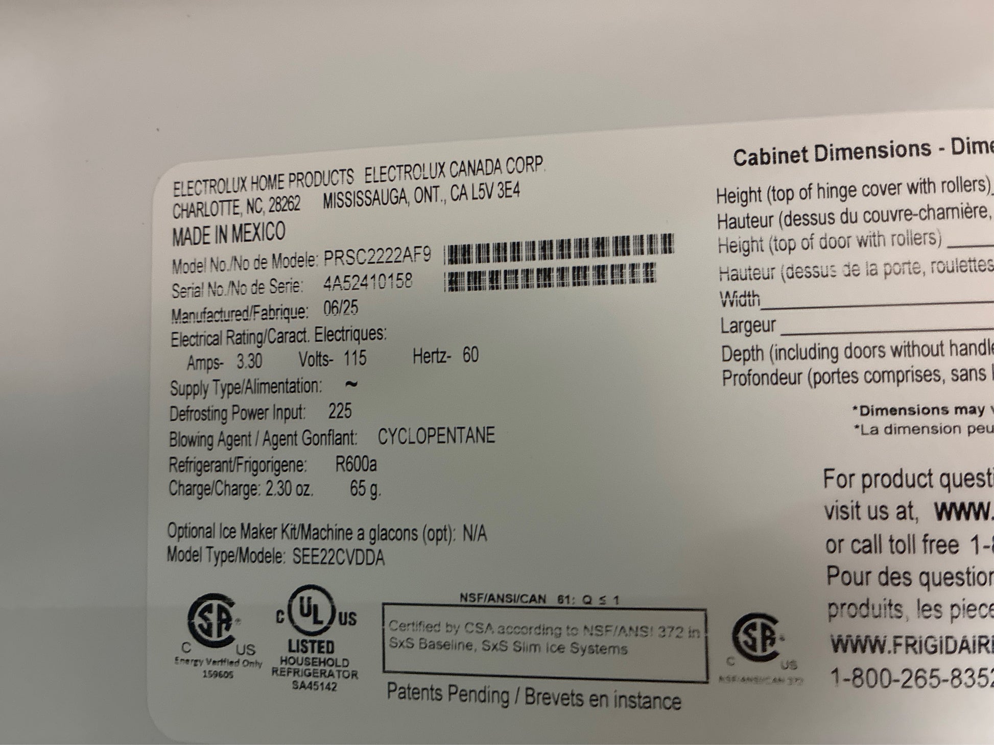 Frigidaire Professional 36 in. Counter-Depth Side-by-side refrigerator offers our advanced CrispSeal Plus Crisper. This crisper keeps produce fresh with a seal that blocks out dry air, plus an added filter reduces the gas that causes produce to ripen faster. It also features our EvenTemp Cooling System which keeps your food fresh by reacting quickly to temperature fluctuations and constantly circulates cold air throughout the fresh food and freezer compartments, ensuring a consistent cool from top to bottom.. Appliance Category: Refrigerator. Appliance Series: Frigidaire Professional. Appliance Type: Side-by-Side Refrigerator. Built-In and Standard Type: Side-by-Side. Color - Appliance Cabinet: Gray. Color - Door Handle(s): Stainless Steel. Color/Finish: Smudge-Proof Stainless Steel. Color/Finish Family: Stainless Steel. Defrost Type: Auto / Cycle. Dispenser Location: External Ice Dispenser,External Water Dispenser. Door Finish: Smooth. Energy Consumption (kWh/year): 615. Energy Efficiency Tier Rating: Not CEE rated. Freezer Capacity (cu. ft.): 8 cu ft. Freezer Door Type: Swing Door. Freezer Features: LED Light Type. Freezer Type: Side Door Freezer. General Features: Digital Temperature Control,Door Alarm,Interior Light,LED Light Type,Sabbath Mode,Smudge-Proof. Handle Type: Bar Handle. Hardware Color/Finish: Stainless Steel. Hardware Color/Finish Family: Stainless Steel. Ice Maker Features: Filtered Ice,Ice Maker. Ice/Water Dispenser: Both. Indoor/Outdoor: Indoor. Installation Depth: Counter Depth. Installation Type: Free Standing. Number of Doors: 2 Door. Number of Freezer Baskets/Bins: 6 Baskets/Bins. Number of Freezer Shelves: 3 Shelves. Number of Refrigerator Shelves: 3 Shelves. Operational Features: Humidity Control,Humidity Controlled Crisper,Sabbath Mode. Overall Product Height (in.): 69.88 in.. Product Weight (lb.): 309 lb. Refrigeration Dispenser Features: Crushed Ice,Cubed Ice,Filtration Replacement Indicator Light,Water Dispenser,Water Filtration. Refrigerator Capacity (cu. ft.): 14.3 cu ft. Returnable: Non-Returnable. Shelf Material - Freezer: Glass. Shelf Material - Refrigerator: Glass. Storage Features: Adjustable Door Storage,Adjustable Shelves/Racks,Crisper Drawer,Deli Drawer,Gallon Door Storage. Temperature Control Type: Internal Digital. Total Capacity (cu. ft.): 22.3 cu ft. Water Filter Replacement Model#: FPPWFU01. Certifications and Listings: Energy Star,UL Listed. Depth (Excluding Handles) (in.): 28.5 in. Depth (Including Handles) (in.): 31 in. Depth (Less Door) (in.): 23.875 in. Depth With Door Open 90 Degrees (in.): 45 in. Height to Top of Door Hinge (in.): 69.875 in. Height to Top of Refrigerator Case (in.): 68.625 in. Height to Top of Refrigerator Door (in.): 69 in. Product Depth (in.): 31 in. Product Height (in.): 69.875 in. Product Width (in.): 36.125 in. Refrigerator Width (in.): 36.125 in. Installation Depth: Counter Depth. Depth (Excluding Handles) (in.): 28.5 in. Overall Product Height (in.): 69.88 in.. Total Capacity (cu. ft.): 22.3 cu ft. Dispenser Features: Water Dispenser. Dispenser Features: Cubed Ice. Dispenser Features: Crushed Ice. Dispenser Features: Water Filtration