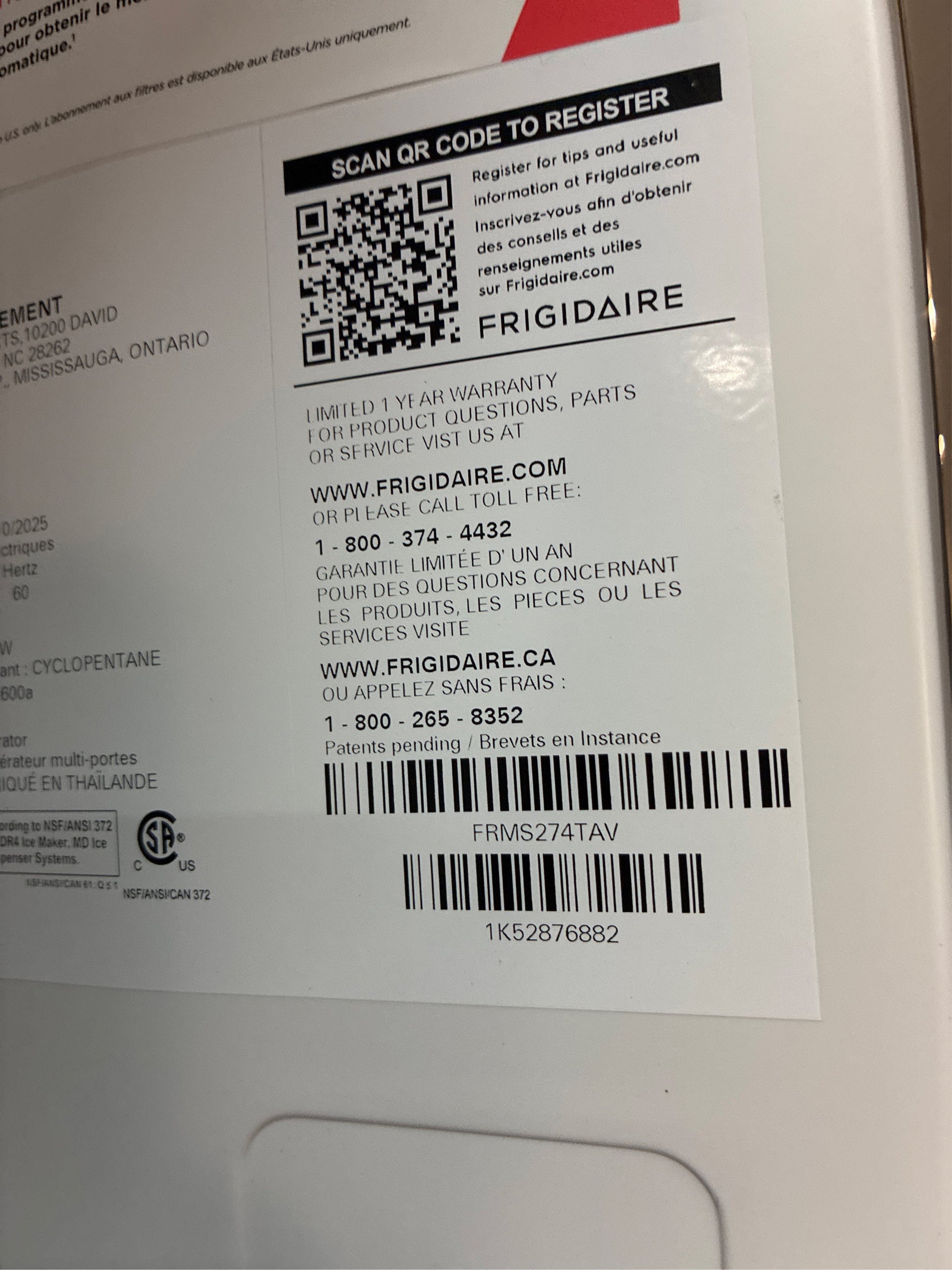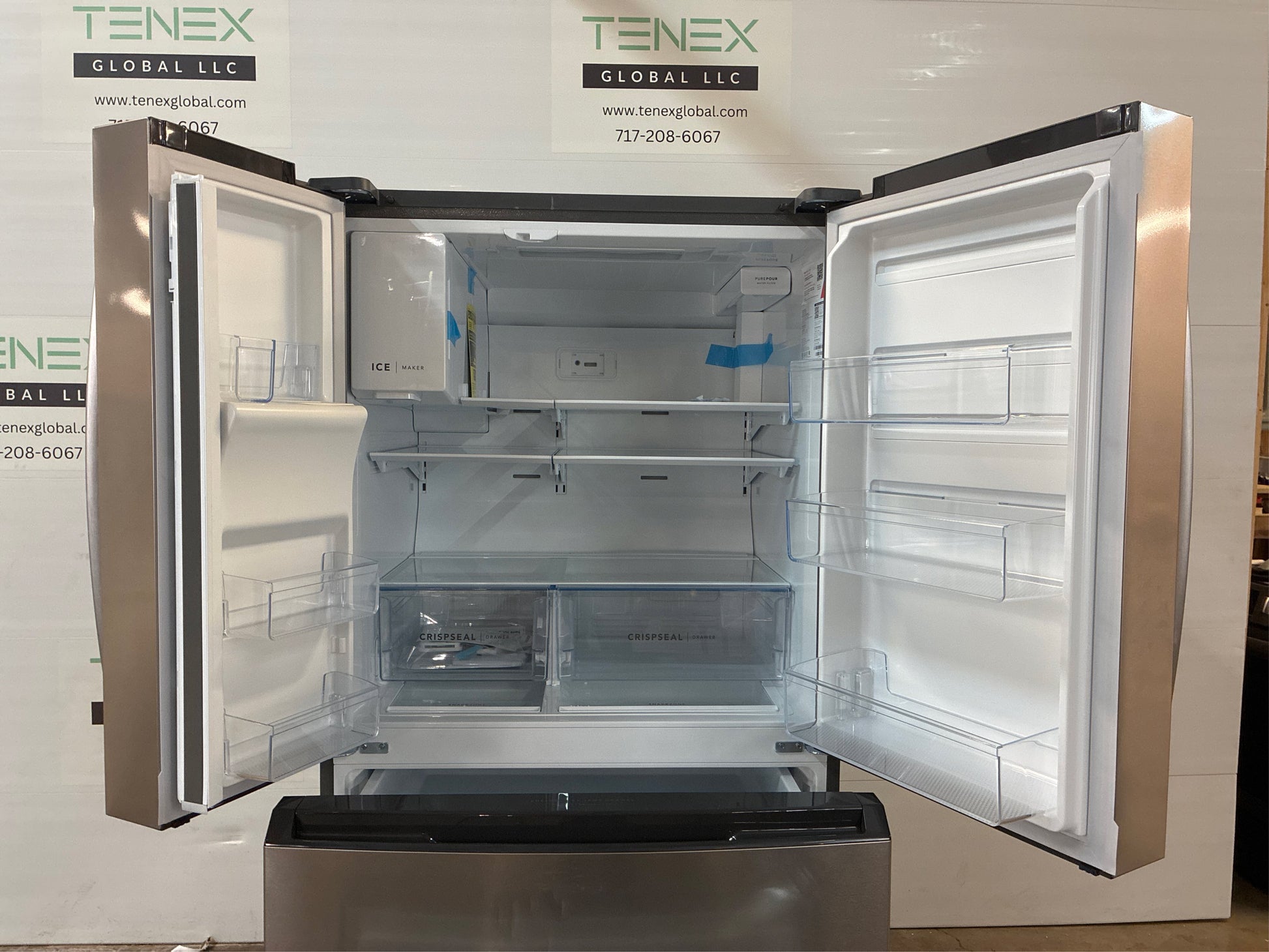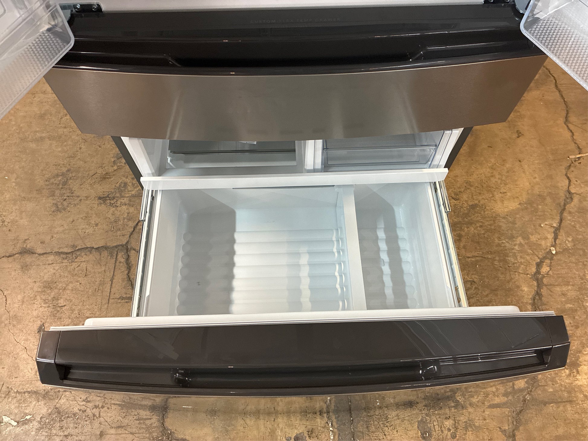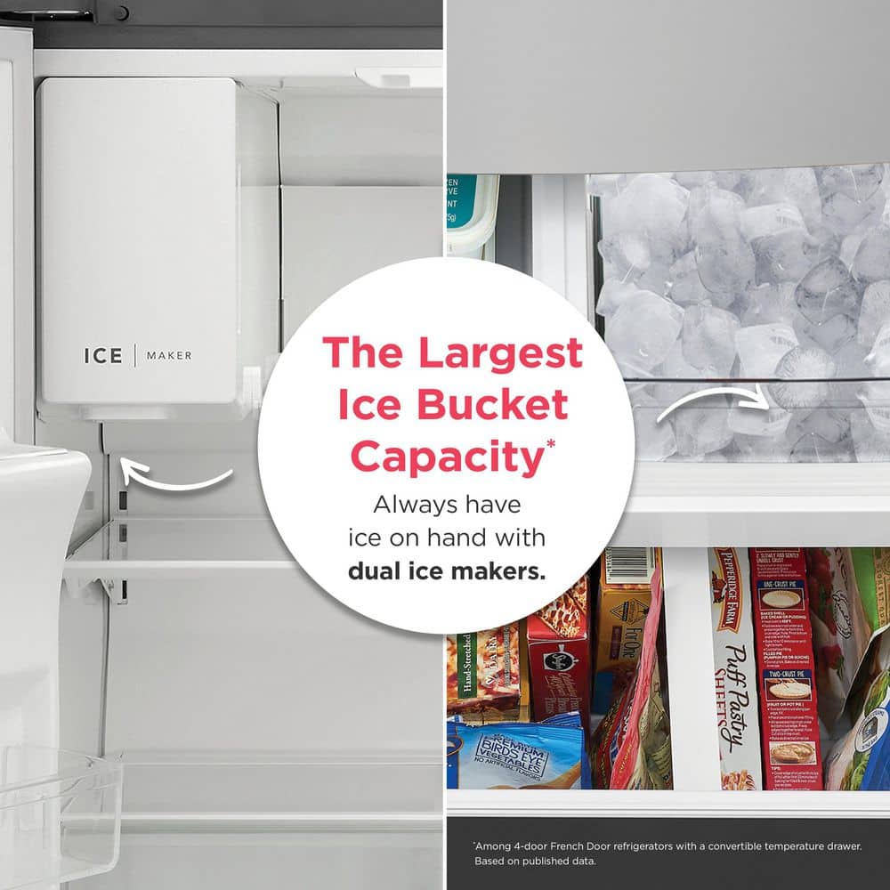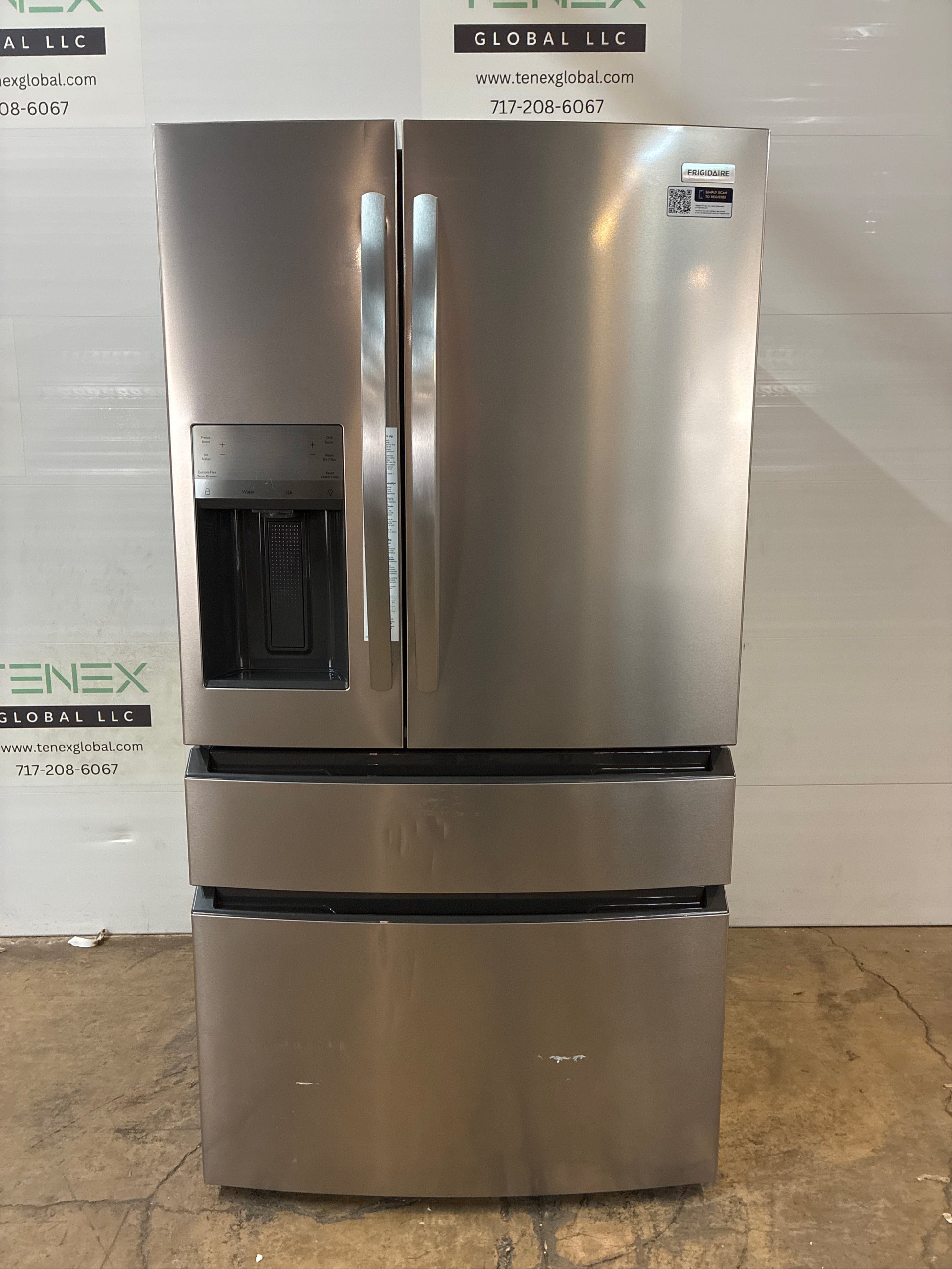 This Frigidaire 4-Door French door refrigerator offers the Custom-Flex Temp Drawer, that fully switches from fridge to freezer, so you can store all your family favorites from yogurt to frozen pizza. It's easy to find a place for everything with our SpaceWise Organization System and large door bins. Plus, keep fruits and vegetables fresh longer with CrispSeal crispers with Auto-Humidity.. Appliance Category: Refrigerator. Appliance Series: Not Applicable. Appliance Type: French Door Refrigerator. Built-In and Standard Type: French Door. Color - Appliance Cabinet: Stainless. Color - Door Handle(s): Stainless. Color/Finish: Fingerprint-Resistant Stainless Steel Look. Color/Finish Family: Stainless Look. Defrost Type: Auto / Cycle. Dispenser Location: External Ice Dispenser,External Water Dispenser. Door Finish: Smooth. Energy Consumption (kWh/year): 721. Energy Efficiency Tier Rating: Not CEE rated. Freezer Capacity (cu. ft.): 7.3 cu ft. Freezer Door Type: Pull Out Drawer. Freezer Features: Adjustable Leveling Legs,LED Light Type,Sliding-Bulk Storage Baskets. Freezer Type: Drawer Freezer. General Features: Digital Temperature Control,Door Alarm,Hidden Hinge,Interior Light,Sabbath Mode,Self-Closing Door. Handle Type: Bar Handle. Hardware Color/Finish: Stainless. Hardware Color/Finish Family: Stainless Look. Ice Maker Features: Filtered Ice,Ice Maker. Ice/Water Dispenser: Both. Indoor/Outdoor: Indoor. Installation Depth: Standard Depth. Installation Type: Free Standing. Number of Doors: 4 Door. Number of Drawers: Double Drawer. Number of Freezer Baskets/Bins: 1 Basket/Bin. Number of Freezer Shelves: 1 Shelf. Number of Refrigerator Shelves: 3 Shelves. Operational Features: Fresh Air Filter,Humidity Control,Humidity Controlled Crisper,Sabbath Mode,Self-Closing Door. Overall Product Height (in.): 70 in. Product Weight (lb.): 335 lb. Refrigeration Dispenser Features: Cubed Ice,Water Dispenser,Water Filtration. Refrigerator Capacity (cu. ft.): 15.8 cu ft. Returnable: Non-Returnable. Shelf Material - Freezer: Glass. Shelf Material - Refrigerator: Glass. Storage Features: Adjustable Door Storage,Adjustable Shelves/Racks,Crisper Drawer,Gallon Door Storage. Temperature Control Type: External Digital. Total Capacity (cu. ft.): 26.3 cu ft. Water Filter Replacement Model#: FPPWFU01. Certifications and Listings: CSA Listed. Depth (Excluding Handles) (in.): 34.6 in. Depth (Including Handles) (in.): 36.8 in. Depth (Less Door) (in.): 29.7 in. Depth With Door Open 90 Degrees (in.): 51.8 in. Height to Top of Door Hinge (in.): 70.2 in. Height to Top of Refrigerator Case (in.): 69.1 in. Height to Top of Refrigerator Door (in.): 69.1 in. Product Depth (in.): 36.8 in. Product Height (in.): 70.2 in. Product Width (in.): 36 in. Refrigerator Width (in.): 36 in. Depth (Excluding Handles) (in.): 34.6 in. Total Capacity (cu. ft.): 26.3 cu ft. Overall Product Height (in.): 70 in. Installation Depth: Standard Depth. Dispenser Features: Water Dispenser. Dispenser Features: Cubed Ice. Dispenser Location: External Water Dispenser. Dispenser Location: External Ice Dispenser