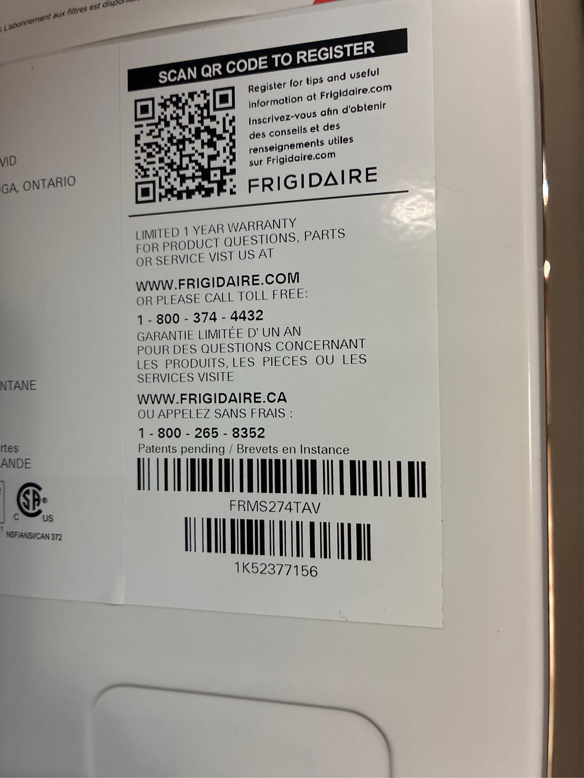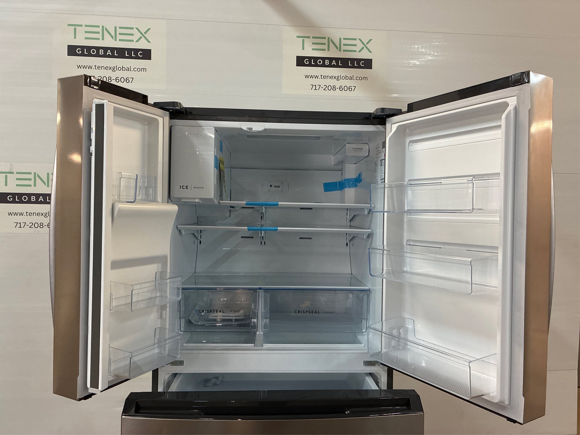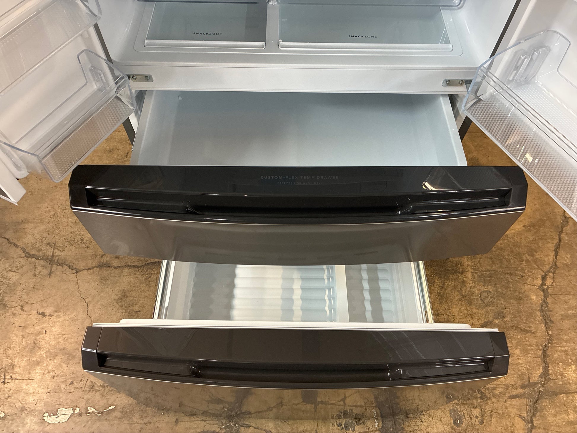 This Frigidaire 4-Door French door refrigerator offers the Custom-Flex Temp Drawer, that fully switches from fridge to freezer, so you can store all your family favorites from yogurt to frozen pizza. It's easy to find a place for everything with our SpaceWise Organization System and large door bins. Plus, keep fruits and vegetables fresh longer with CrispSeal crispers with Auto-Humidity.. Appliance Category: Refrigerator. Appliance Series: Not Applicable. Appliance Type: French Door Refrigerator. Built-In and Standard Type: French Door. Color - Appliance Cabinet: Stainless. Color - Door Handle(s): Stainless. Color/Finish: Fingerprint-Resistant Stainless Steel Look. Color/Finish Family: Stainless Look. Defrost Type: Auto / Cycle. Dispenser Location: External Ice Dispenser,External Water Dispenser. Door Finish: Smooth. Energy Consumption (kWh/year): 721. Energy Efficiency Tier Rating: Not CEE rated. Freezer Capacity (cu. ft.): 7.3 cu ft. Freezer Door Type: Pull Out Drawer. Freezer Features: Adjustable Leveling Legs,LED Light Type,Sliding-Bulk Storage Baskets. Freezer Type: Drawer Freezer. General Features: Digital Temperature Control,Door Alarm,Hidden Hinge,Interior Light,Sabbath Mode,Self-Closing Door. Handle Type: Bar Handle. Hardware Color/Finish: Stainless. Hardware Color/Finish Family: Stainless Look. Ice Maker Features: Filtered Ice,Ice Maker. Ice/Water Dispenser: Both. Indoor/Outdoor: Indoor. Installation Depth: Standard Depth. Installation Type: Free Standing. Number of Doors: 4 Door. Number of Drawers: Double Drawer. Number of Freezer Baskets/Bins: 1 Basket/Bin. Number of Freezer Shelves: 1 Shelf. Number of Refrigerator Shelves: 3 Shelves. Operational Features: Fresh Air Filter,Humidity Control,Humidity Controlled Crisper,Sabbath Mode,Self-Closing Door. Overall Product Height (in.): 70 in. Product Weight (lb.): 335 lb. Refrigeration Dispenser Features: Cubed Ice,Water Dispenser,Water Filtration. Refrigerator Capacity (cu. ft.): 15.8 cu ft. Returnable: Non-Returnable. Shelf Material - Freezer: Glass. Shelf Material - Refrigerator: Glass. Storage Features: Adjustable Door Storage,Adjustable Shelves/Racks,Crisper Drawer,Gallon Door Storage. Temperature Control Type: External Digital. Total Capacity (cu. ft.): 26.3 cu ft. Water Filter Replacement Model#: FPPWFU01. Certifications and Listings: CSA Listed. Depth (Excluding Handles) (in.): 34.6 in. Depth (Including Handles) (in.): 36.8 in. Depth (Less Door) (in.): 29.7 in. Depth With Door Open 90 Degrees (in.): 51.8 in. Height to Top of Door Hinge (in.): 70.2 in. Height to Top of Refrigerator Case (in.): 69.1 in. Height to Top of Refrigerator Door (in.): 69.1 in. Product Depth (in.): 36.8 in. Product Height (in.): 70.2 in. Product Width (in.): 36 in. Refrigerator Width (in.): 36 in. Depth (Excluding Handles) (in.): 34.6 in. Total Capacity (cu. ft.): 26.3 cu ft. Overall Product Height (in.): 70 in. Installation Depth: Standard Depth. Dispenser Features: Water Dispenser. Dispenser Features: Cubed Ice. Dispenser Location: External Water Dispenser. Dispenser Location: External Ice Dispenser