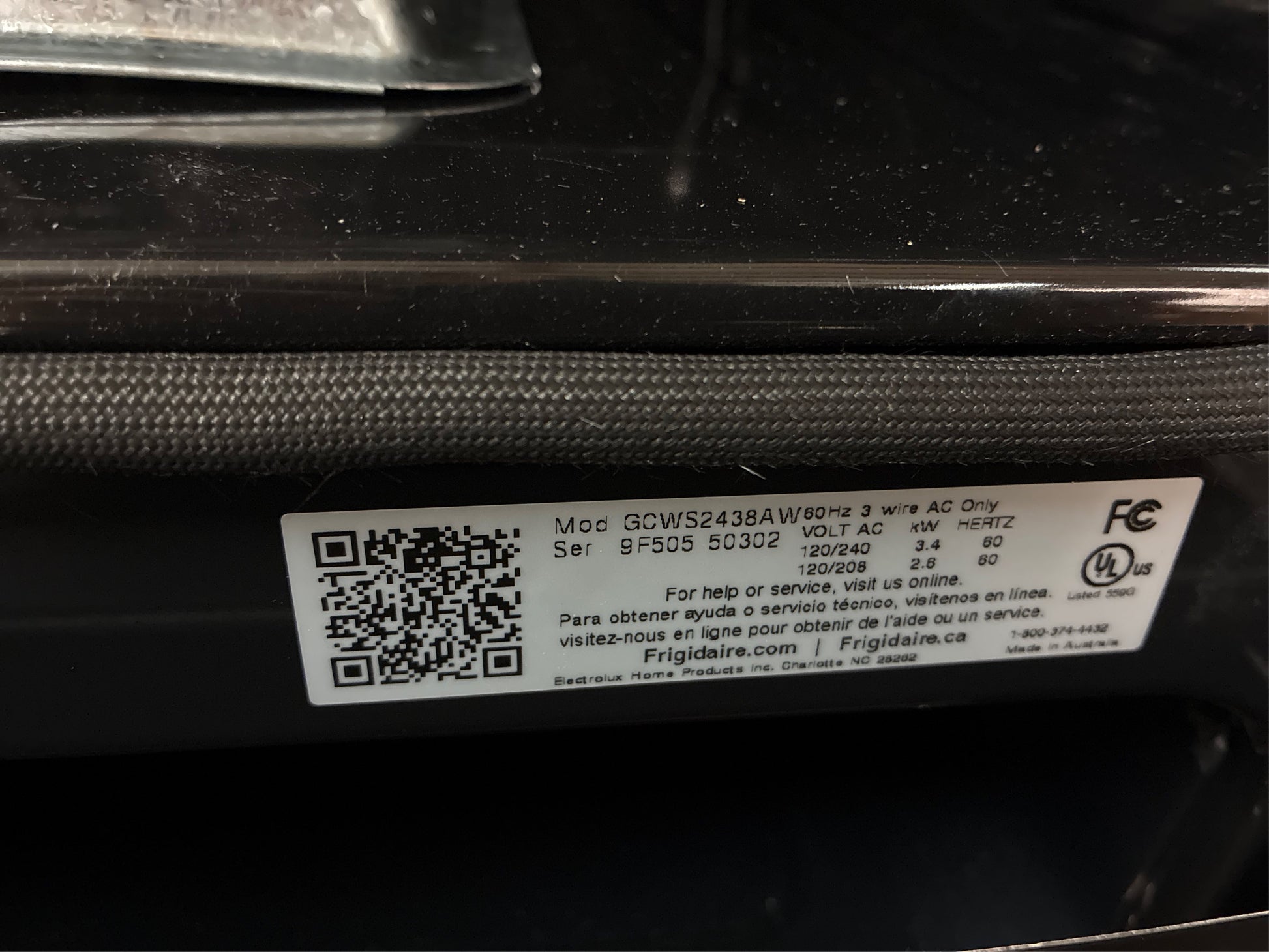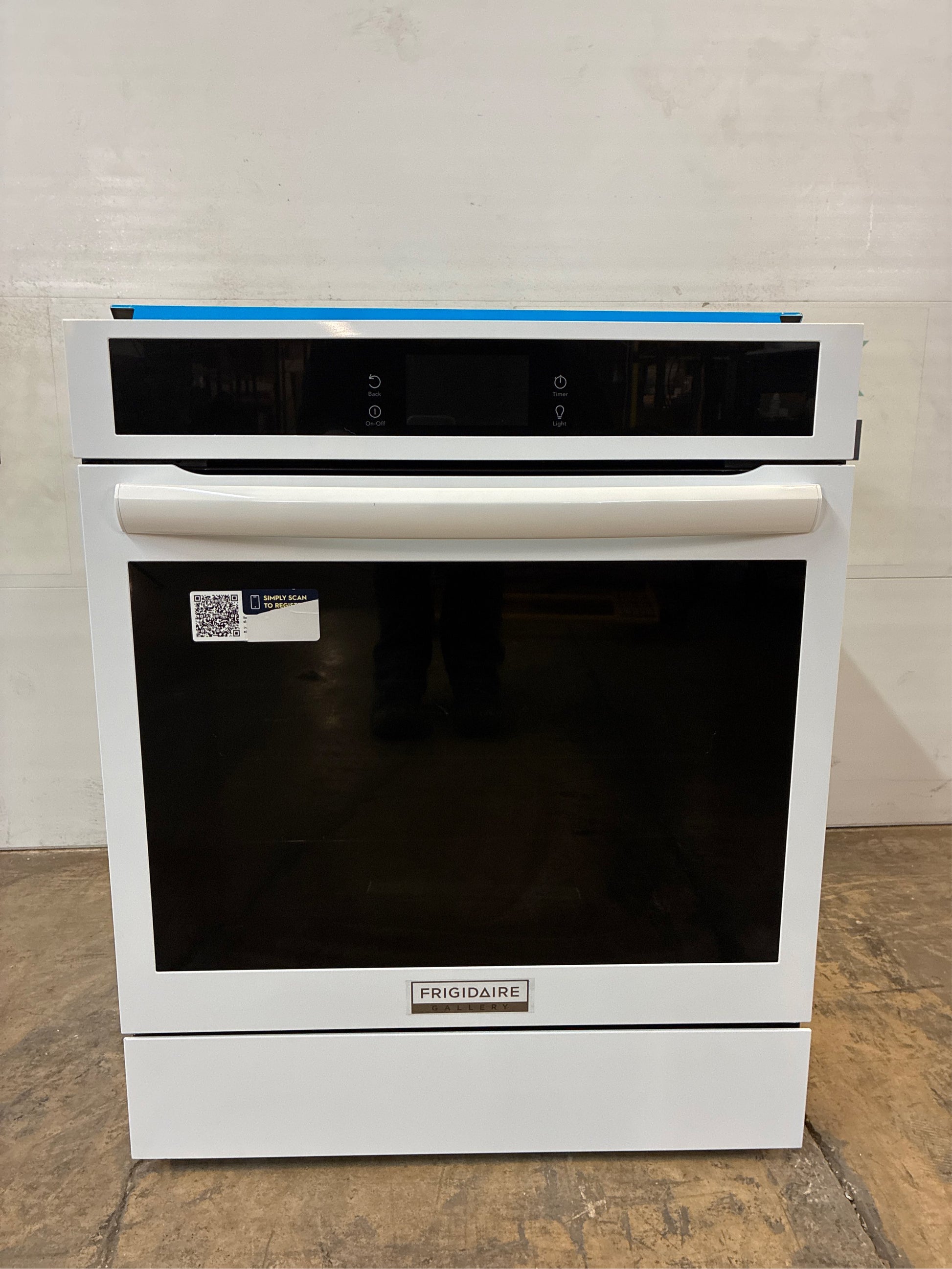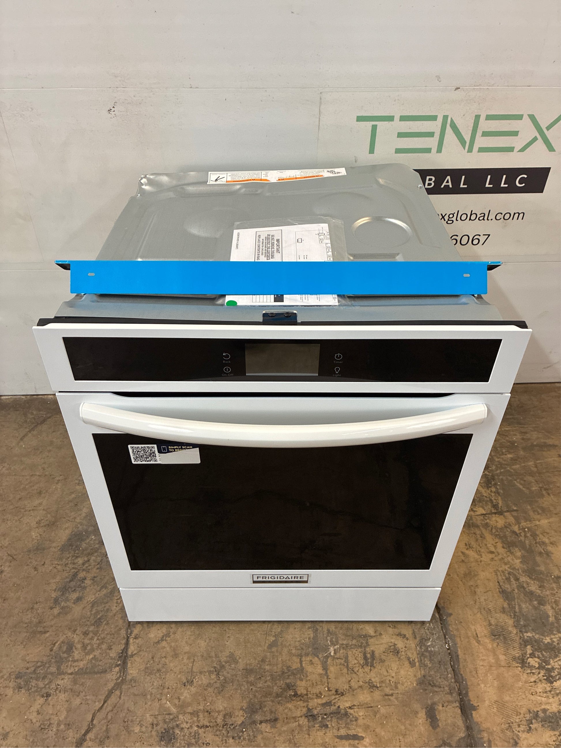 The Frigidaire Gallery 24 Single Electric Wall Oven with Air Fry allows you to make healthier and delicious meals for your family- right in your oven. Get faster, more even baking results with True Convection, that evenly circulates hot air throughout the oven. This wall oven also features our premium touch screen control panel and our fingerprint resistant, Smudge-Proof Stainless Steel finish.. Amperage (A): 40 A. Appliance Category: Wall Oven. Appliance Series: Frigidaire Gallery. Appliance Type: Single Wall Electric Oven. Capacity of Oven (cu. ft.): 2.8 cu ft. Cleaning Type: Self Cleaning. Color/Finish: White. Color/Finish Family: White. Commercial/Residential: Residential. Fuel Type: Electric. Hardware Color/Finish: White. Hardware Color/Finish Family: White. Number of Oven Racks: 2. Oven Cleaning Options: Delay Clean,Self-Cleaning,Steam Clean. Oven Control Type: Digital. Oven Cooking Process: Air Fry,Air Sous Vide,True Convection. Oven Features: Automatic Convection Conversion,Broiler in Oven,Fingerprint Resistant,Hidden Bake Element,Steam Cooking,Temperature Control. Product Weight (lb.): 143 lb. Rack Positions: 5. Returnable: Non-Returnable. Voltage (V): 240 V. Wattage (W): 5700 W. Certifications and Listings: ADA Compliant,ROHS,Star-K,UL Certified. Cut-Out Front to Back Depth (in.): 23.5. Cut-Out Height (in.): 28.25. Cut-Out Left to Right Width (in.): 22. Depth With Door(s) Open 90 Degrees (in.): 43.75. Oven Interior Depth (in): 17.375. Oven Interior Height (in): 15.5. Oven Interior Width (in): 18.6875. Product Depth (in.): 22.75 in. Product Height (in.): 28.625 in. Product Width (in.): 23.5 in. Wall Oven Size: 24 in.. Size: 24 in.. Cleaning Type: Self Cleaning. Features: Broiler in Oven. Features: Temperature Control. Oven Cooking Process: Air Fry. Features: Automatic Convection Conversion. Oven Cooking Process: True Convection. Features: Fingerprint Resistant