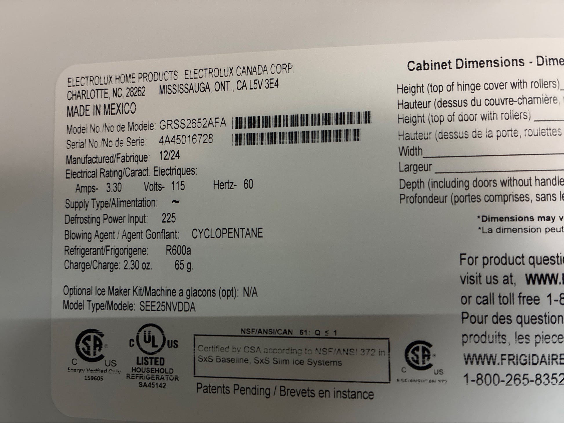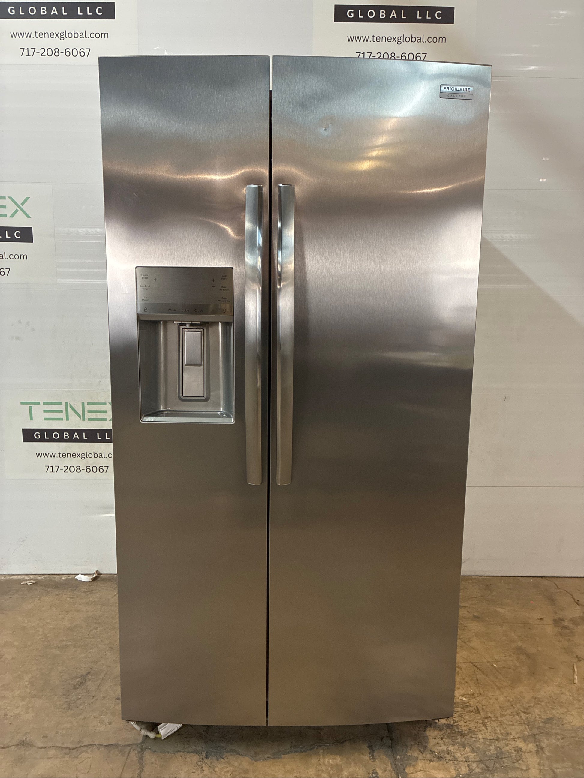 This Frigidaire Gallery 36 in. Side-by-side refrigerator offers our advanced CrispSeal Plus Crisper. This crisper keeps produce fresh with a seal that blocks out dry air, plus an added filter reduces the gas that causes produce to ripen faster. It also features our EvenTemp Cooling System which keeps your food fresh by reacting quickly to temperature fluctuations and constantly circulates cold air throughout the fresh food and freezer compartments, ensuring a consistent cool from top to bottom.. Convenient dedicated Deli Drawer to easily organize favorites. Built in air filter that captures and keeps odors away. Keep produce fresh longer in our advanced crispers. CrispSeal Plus crisper - help prevent produce from spoiling: advanced CrispSeal Plus keeps produce fresh with a seal that blocks out dry air, plus an added filter reduces the gas that causes produce to ripen faster. EvenTemp cooling system - keep your food fresh and reduce freezer burn with our variable speed compressor that reacts quickly to temperature fluctuations and constantly circulates cold air throughout the fresh food and freezer compartments. Spacewise organization system - find a place for everything with our flexible organization system, including three removable glass shelves, adjustable gallon door bin, and a slim design ice maker that holds 9 lbs. of ice without taking up valuable shelf space. Smudge-proof stainless steel - resists fingerprints and cleans easily. Deli drawer - keep sandwich meats and cheeses organized and easy to reach in a convenient dedicated drawer. ENERGY STAR certified - save money and maximize energy efficiency with ENERGY STAR certified appliances. Multi-level bright led lighting - keep safe, great tasting water flowing, our filter reduces up to 9Find fresh foods quickly with our bright LED lighting. PurePour water filter - keep safe, great tasting water flowing, our filter reduces up to 99% of contaminants, cuts back on plastic and saves the cost of bottled water, NSF and WQA certified. PureAir Ultra II air filter - our air filter performs better than baking soda, capturing undesirable smells to keep your fridge fresh for longer. Automatic de-frost. Door ajar alarm. Compatible water filter model: FPPWFU01. Add .25-in + depth of handle if door will open against a wall. Compatible with water filter model : HDFPPWFU01 . Compatible with air filter model : PAULTRA2 . Click here to shop all Frigidaire appliances . Click here for more information on Electronic Recycling Programs . Appliance Category: Refrigerator. Appliance Series: Frigidaire Gallery. Appliance Type: Side-by-Side Refrigerator. Built-In and Standard Type: Side-by-Side. Color - Appliance Cabinet: Stainless Look. Color - Door Handle(s): Stainless Steel. Color/Finish: Smudge-Proof Stainless Steel. Color/Finish Family: Stainless Steel. Defrost Type: Auto / Cycle. Dispenser Location: External Ice Dispenser,External Water Dispenser. Door Finish: Smooth. Energy Consumption (kWh/year): 647. Energy Efficiency Tier Rating: Tier I. Freezer Capacity (cu. ft.): 9 cu ft. Freezer Door Type: Swing Door. Freezer Features: In-door Storage,LED Light Type. Freezer Type: Side Door Freezer. General Features: Dispenser Light,Door Alarm,Interior Light,LED Light Type,Sabbath Mode,Smudge-Proof. Handle Type: Bar Handle. Hardware Color/Finish: Gray. Hardware Color/Finish Family: Stainless Steel. Ice Maker Features: Control Lockout,Filtered Ice,Removable Basket. Ice/Water Dispenser: Both. Indoor/Outdoor: Indoor. Installation Depth: Standard Depth. Installation Type: Free Standing. Number of Doors: 2 Door. Number of Freezer Baskets/Bins: 2 Baskets/Bins. Number of Freezer Shelves: 3 Shelves. Number of Refrigerator Shelves: 3 Shelves. Operational Features: Fresh Air Filter,Humidity Control,Sabbath Mode. Overall Product Height (in.): 70 in. Product Weight (lb.): 278.35 lb. Refrigeration Dispenser Features: Crushed Ice,Cubed Ice,Filtration Replacement Indicator Light,Water Dispenser. Refrigerator Capacity (cu. ft.): 16.6 cu ft. Shelf Material - Freezer: Glass. Shelf Material - Refrigerator: Glass. Storage Features: Adjustable Shelves/Racks,Deli Drawer,Gallon Door Storage,Spill Proof Shelves. Temperature Control Type: Internal Electric. Total Capacity (cu. ft.): 25.6 cu ft. Water Filter Replacement Model#: FPPWFU01. Certifications and Listings: ADA Compliant,Energy Star,cUL Listed. Depth (Excluding Handles) (in.): 33.375 in. Depth (Including Handles) (in.): 35.875 in. Depth (Less Door) (in.): 28.75 in. Depth With Door Open 90 Degrees (in.): 50. Height to Top of Door Hinge (in.): 69.875 in. Height to Top of Refrigerator Case (in.): 68.625 in. Height to Top of Refrigerator Door (in.): 69.875 in. Product Depth (in.): 33.375 in. Product Height (in.): 69.875 in. Product Width (in.): 35.875 in. Refrigerator Width (in.): 36.125 in