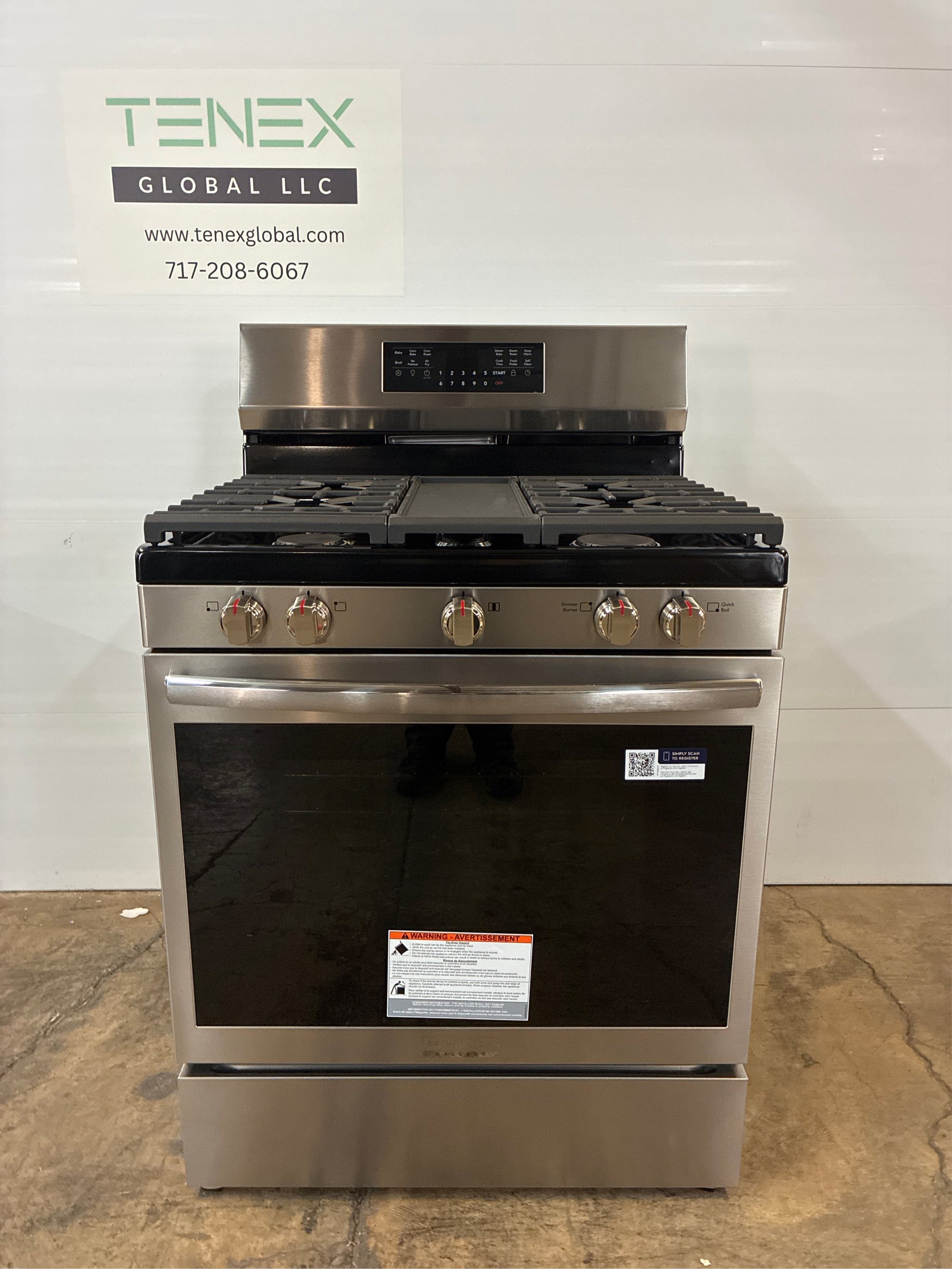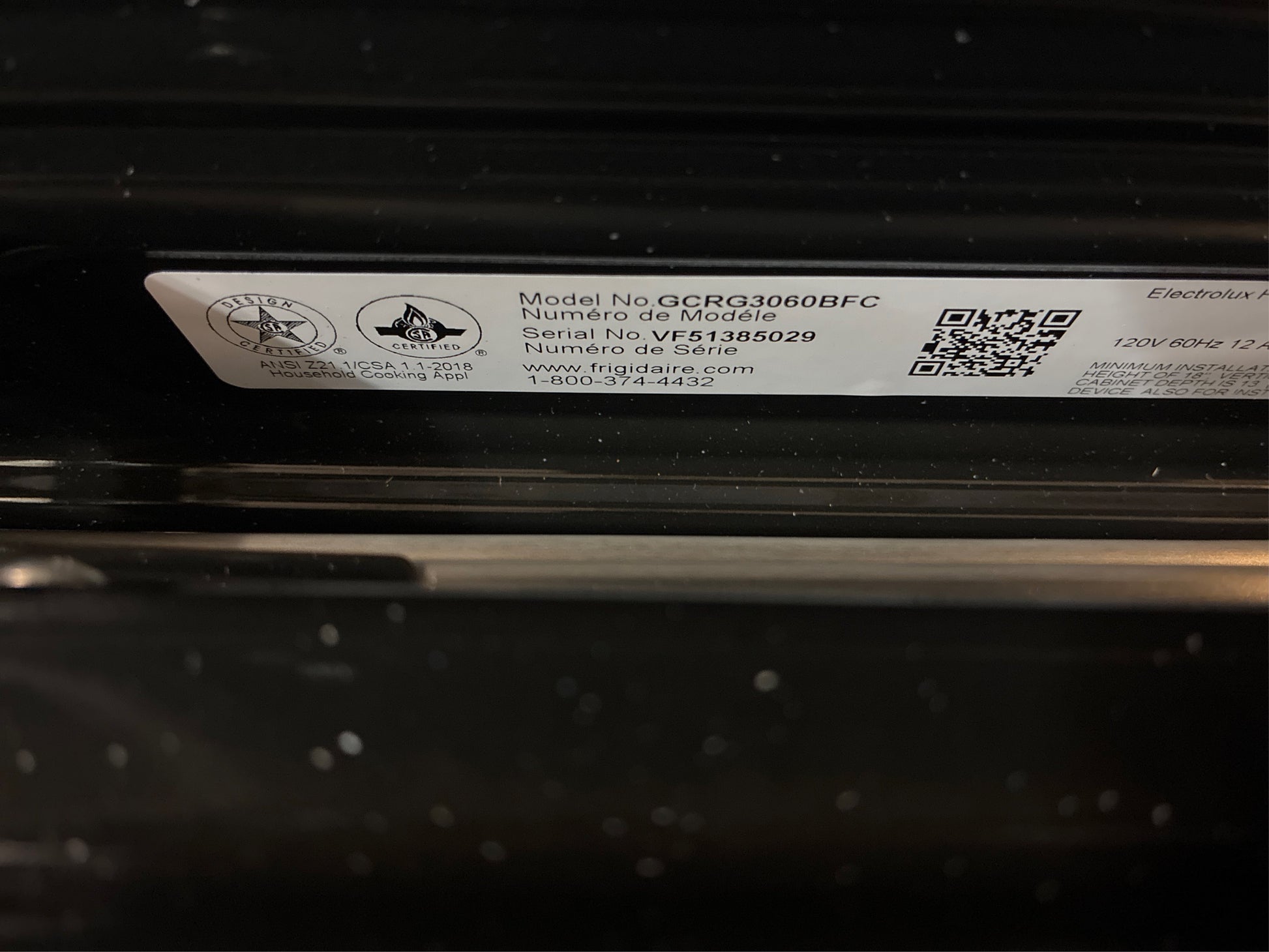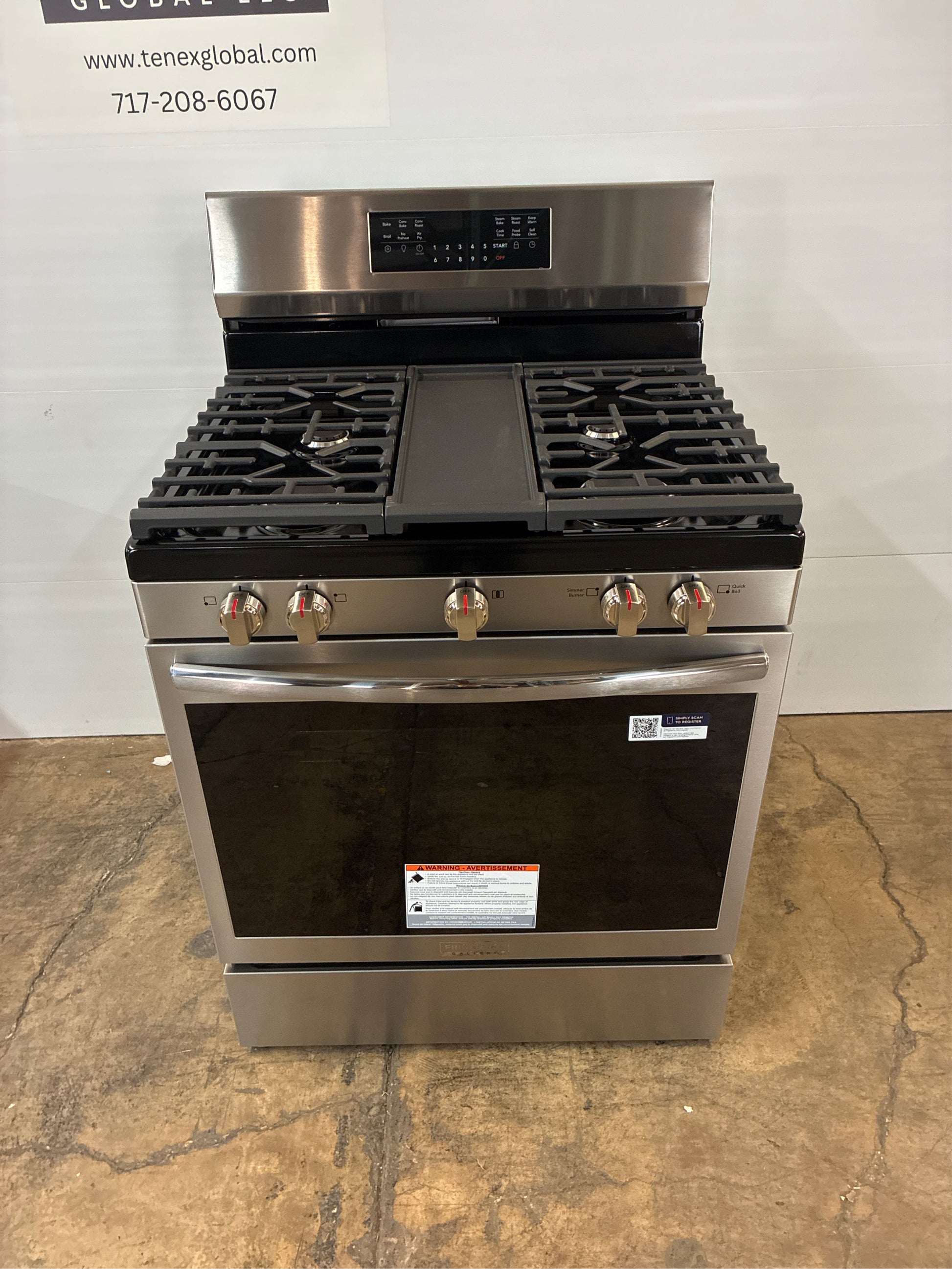 The Frigidaire Gallery 30 Rear Control Gas Range features our most powerful and advanced convection system, Total Convection, enabling so many cooking modes like No Preheat, Air Fry, Slow Cook, Steam Bake, Steam Roast, Air Sous Vide, Convection Roast, Convection Bake and more! The flexible five burner cooktop includes a powerful 18,000 BTU Quick Boil Burner and a center oval burner with an integrated cast iron griddle. Also includes our fingerprint resistant, Smudge-Proof Stainless Steel finish. Slow Cook, Steam Bake plus more, powered by Total Convection. Skip preheating and start baking immediately with No Preheat. Air Fry allows you to make healthier and delicious meals for the entire family, right in your oven - don't forget to add-on the Frigidaire ReadyCook air fry tray (model FRIGPEREAFT sold separately). With Slow Cook, your food cooks slowly and at a lower temperature (as low as 100 F), allowing you to lock in moisture and flavor without over or undercooking your food. This cooktop has five burners designed to handle all of your cooking needs, including a powerful 18,000 BTU Quick Boil Burner and a center oval burner with an integrated cast iron griddle. The Temperature Probe monitors and alerts when the desired finished cooking temperature has been reached. With Steam Bake, steam evenly circulates throughout the oven cavity, resulting in breads and muffins that rise higher and are light and fluffy. Enjoy more cleaning flexibility, select Steam Clean for a quick, 30 minute clean or choose Self Clean, which is available in 2, 3 and 4 hour cycles. Steam Roast uses moisture to make perfectly crispy and tender meats and vegetables that are roasted to perfection. Appliance Color/Finish: Stainless steel. Handle Color: Stainless steel. Manufacturer Color/Finish: Fingerprint Resistant Stainless Steel. Sub-Brand: Gallery. Type: Freestanding. Adjustable Height: Yes. Capacity (Cu. Feet): 5.1. Cutout Depth (Inches): 26. Cutout Height (Inches): 45. Cutout Width (Inches): 30. Depth (Inches): 26. Maximum Assembled Height (Inches): 47.75. Minimum Assembled Height (Inches): 46.75. Popular Widths: 30-in. Range Size (Inches): 30. Usable Oven Interior (H x W x D): 17.625 x 25.187 x 19.875. Width (Inches): 30. ADA Compliant: No. Adjustable Cleaning Levels: Yes. Air Fry: Yes. Appliance Type: Single oven gas range. Auto Re-Ignition: Yes. Automatic Convection Conversion: Yes. Automatic Shut-Off: Yes. Broiler Drawer: No. Burner #1 Max BTU: 18000. Burner #2 Max BTU: 5000. Burner #3 Max BTU: 14000. Burner #4 Max BTU: 10000. Burner #5 Max BTU: 10000. Burner #6 Max BTU: 0. Burner Grate Material: Matte cast iron. Cleaning Method: Self-cleaning and steam cleaning. Continuous Grates: Yes. Control Location: Behind elements. Control Lockout: Yes. Convection Element Type: Single-fan European element. Convection Oven: Yes. Cooking Surface Control Type: Knobs. Cooking Surface Type: Standard. Customizable: No. Delay Bake: Yes. Digital Display: Yes. Dishwasher-Safe Grates: No. Door Lock: Yes. Downdraft Exhaust: No. Drip Pans: No. Dual/Tri-Ring Burner(s): No. Favorite Setting: No. Fingerprint-Resistant: Yes. Food Temperature Probe: Yes. Fuel Type: Natural gas. Glide/Rollout Racks: No. Half/Split Rack: No. Hot Surface Indicator Lights: No. Hub Required: No. Ignition Type: Electronic. Installation Type: Freestanding. Integrated Griddle: Yes (Included). Interior Light(s) Type: Halogen. Keep Warm Setting: Yes. Light(s) Control: Oven light touch pad. Lowe's Exclusive: No. LP Conversion Kit Included: No. LP Convertible: Yes. Modular Design: No. Number of Cooking Zones: 5 burners. Number of Oven Rack Positions: 6. Number of Racks: 2. Oval Burner: No. Oven Control Type: Electronic. Power Burner (15,000 BTU+): Yes. Power Cord Included: Yes. Power Source: Plug-in. Professional: No. Rapid Preheat: Yes. Removable Washable Trays: No. Sabbath Mode: No. Sealed Burners: Yes. Self-Cleaning Oven Racks: No. Simmer Burner: Yes. Single/Double Oven: Single. Steam Cook: No. Temperature-Sensor Baking: No. Time Bake: Yes. Voice Controlled: No. Warming Drawer: No. Wok Grate Included: No. App Compatibility: No. Bluetooth Compatibility: No. Matching Electric (Model #): GCRE3060BF. Matching Newer (Model #): GCRG3060BD. Matching Previous (Model #): GCRG3060AF. Smart Compatible: No. Wi-Fi Compatibility: No. Works with Amazon Alexa: No. Works with Android: No. Works with Apple HomeKit: No. Works with iOS: No. Works with SmartThings: No. Works with Sonos: No. Works with the Google Assistant: No. CA Residents: Prop 65 Warning(s): Yes. ENERGY STAR Certified: No. Safety Listing: CSA safety listing. UNSPSC: 52141500.