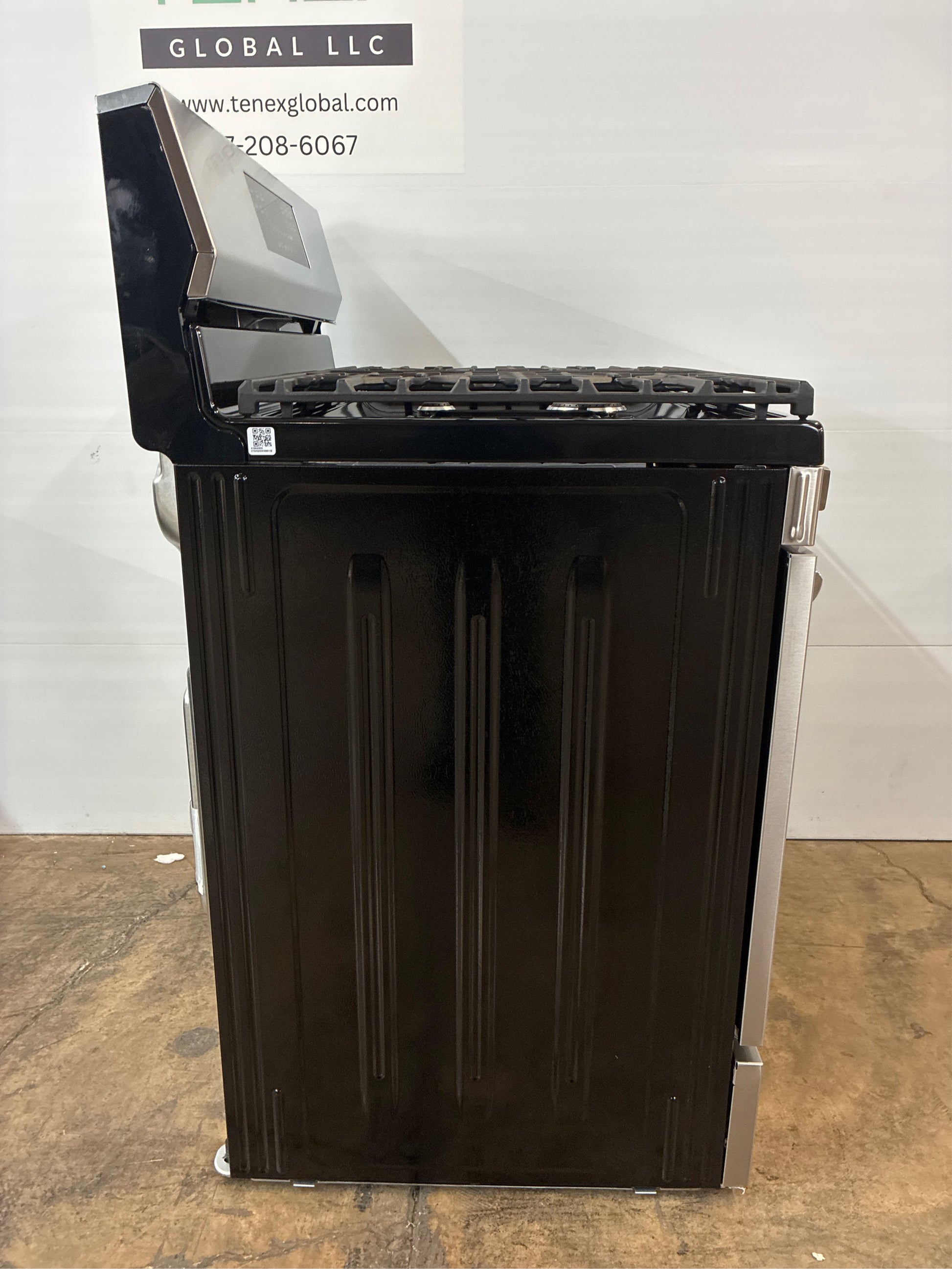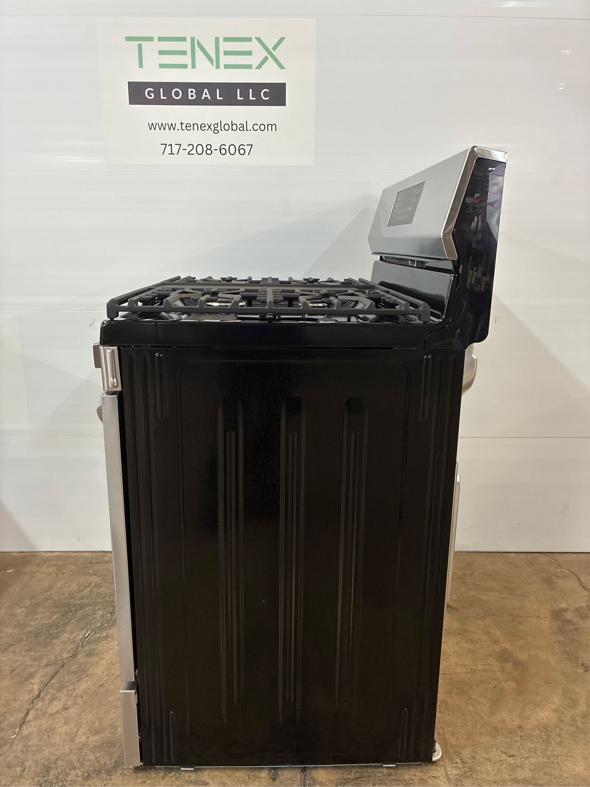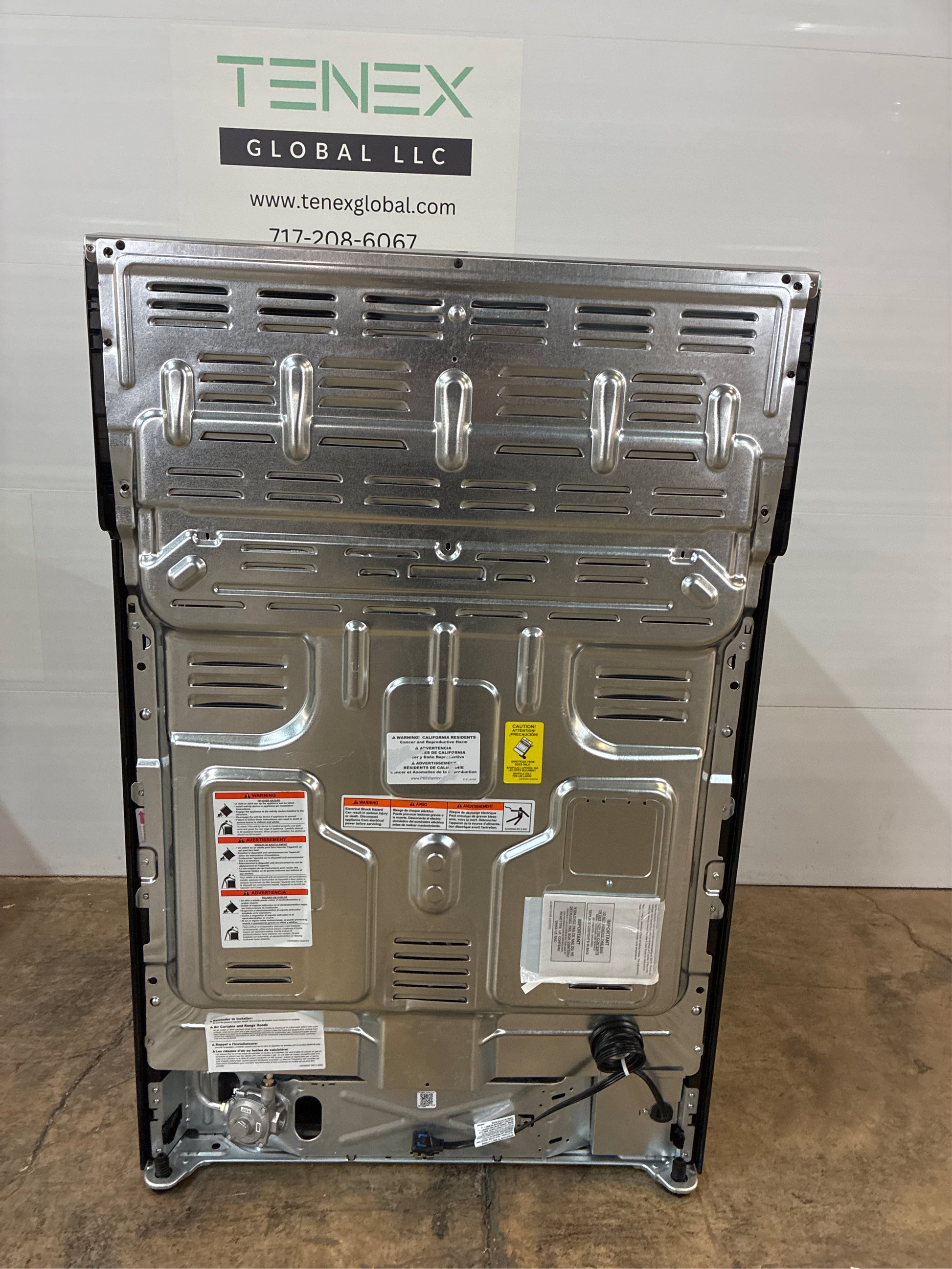 The Frigidaire Gallery 30 Rear Control Gas Range features our most powerful and advanced convection system, Total Convection, enabling so many cooking modes like No Preheat, Air Fry, Slow Cook, Steam Bake, Steam Roast, Air Sous Vide, Convection Roast, Convection Bake and more! The flexible five burner cooktop includes a powerful 18,000 BTU Quick Boil Burner and a center oval burner with an integrated cast iron griddle. Also includes our fingerprint resistant, Smudge-Proof Stainless Steel finish. Slow Cook, Steam Bake plus more, powered by Total Convection. Skip preheating and start baking immediately with No Preheat. Air Fry allows you to make healthier and delicious meals for the entire family, right in your oven - don't forget to add-on the Frigidaire ReadyCook air fry tray (model FRIGPEREAFT sold separately). With Slow Cook, your food cooks slowly and at a lower temperature (as low as 100 F), allowing you to lock in moisture and flavor without over or undercooking your food. This cooktop has five burners designed to handle all of your cooking needs, including a powerful 18,000 BTU Quick Boil Burner and a center oval burner with an integrated cast iron griddle. The Temperature Probe monitors and alerts when the desired finished cooking temperature has been reached. With Steam Bake, steam evenly circulates throughout the oven cavity, resulting in breads and muffins that rise higher and are light and fluffy. Enjoy more cleaning flexibility, select Steam Clean for a quick, 30 minute clean or choose Self Clean, which is available in 2, 3 and 4 hour cycles. Steam Roast uses moisture to make perfectly crispy and tender meats and vegetables that are roasted to perfection. Appliance Color/Finish: Stainless steel. Handle Color: Stainless steel. Manufacturer Color/Finish: Fingerprint Resistant Stainless Steel. Sub-Brand: Gallery. Type: Freestanding. Adjustable Height: Yes. Capacity (Cu. Feet): 5.1. Cutout Depth (Inches): 26. Cutout Height (Inches): 45. Cutout Width (Inches): 30. Depth (Inches): 26. Maximum Assembled Height (Inches): 47.75. Minimum Assembled Height (Inches): 46.75. Popular Widths: 30-in. Range Size (Inches): 30. Usable Oven Interior (H x W x D): 17.625 x 25.187 x 19.875. Width (Inches): 30. ADA Compliant: No. Adjustable Cleaning Levels: Yes. Air Fry: Yes. Appliance Type: Single oven gas range. Auto Re-Ignition: Yes. Automatic Convection Conversion: Yes. Automatic Shut-Off: Yes. Broiler Drawer: No. Burner #1 Max BTU: 18000. Burner #2 Max BTU: 5000. Burner #3 Max BTU: 14000. Burner #4 Max BTU: 10000. Burner #5 Max BTU: 10000. Burner #6 Max BTU: 0. Burner Grate Material: Matte cast iron. Cleaning Method: Self-cleaning and steam cleaning. Continuous Grates: Yes. Control Location: Behind elements. Control Lockout: Yes. Convection Element Type: Single-fan European element. Convection Oven: Yes. Cooking Surface Control Type: Knobs. Cooking Surface Type: Standard. Customizable: No. Delay Bake: Yes. Digital Display: Yes. Dishwasher-Safe Grates: No. Door Lock: Yes. Downdraft Exhaust: No. Drip Pans: No. Dual/Tri-Ring Burner(s): No. Favorite Setting: No. Fingerprint-Resistant: Yes. Food Temperature Probe: Yes. Fuel Type: Natural gas. Glide/Rollout Racks: No. Half/Split Rack: No. Hot Surface Indicator Lights: No. Hub Required: No. Ignition Type: Electronic. Installation Type: Freestanding. Integrated Griddle: Yes (Included). Interior Light(s) Type: Halogen. Keep Warm Setting: Yes. Light(s) Control: Oven light touch pad. Lowe's Exclusive: No. LP Conversion Kit Included: No. LP Convertible: Yes. Modular Design: No. Number of Cooking Zones: 5 burners. Number of Oven Rack Positions: 6. Number of Racks: 2. Oval Burner: No. Oven Control Type: Electronic. Power Burner (15,000 BTU+): Yes. Power Cord Included: Yes. Power Source: Plug-in. Professional: No. Rapid Preheat: Yes. Removable Washable Trays: No. Sabbath Mode: No. Sealed Burners: Yes. Self-Cleaning Oven Racks: No. Simmer Burner: Yes. Single/Double Oven: Single. Steam Cook: No. Temperature-Sensor Baking: No. Time Bake: Yes. Voice Controlled: No. Warming Drawer: No. Wok Grate Included: No. App Compatibility: No. Bluetooth Compatibility: No. Matching Electric (Model #): GCRE3060BF. Matching Newer (Model #): GCRG3060BD. Matching Previous (Model #): GCRG3060AF. Smart Compatible: No. Wi-Fi Compatibility: No. Works with Amazon Alexa: No. Works with Android: No. Works with Apple HomeKit: No. Works with iOS: No. Works with SmartThings: No. Works with Sonos: No. Works with the Google Assistant: No. CA Residents: Prop 65 Warning(s): Yes. ENERGY STAR Certified: No. Safety Listing: CSA safety listing. UNSPSC: 52141500.