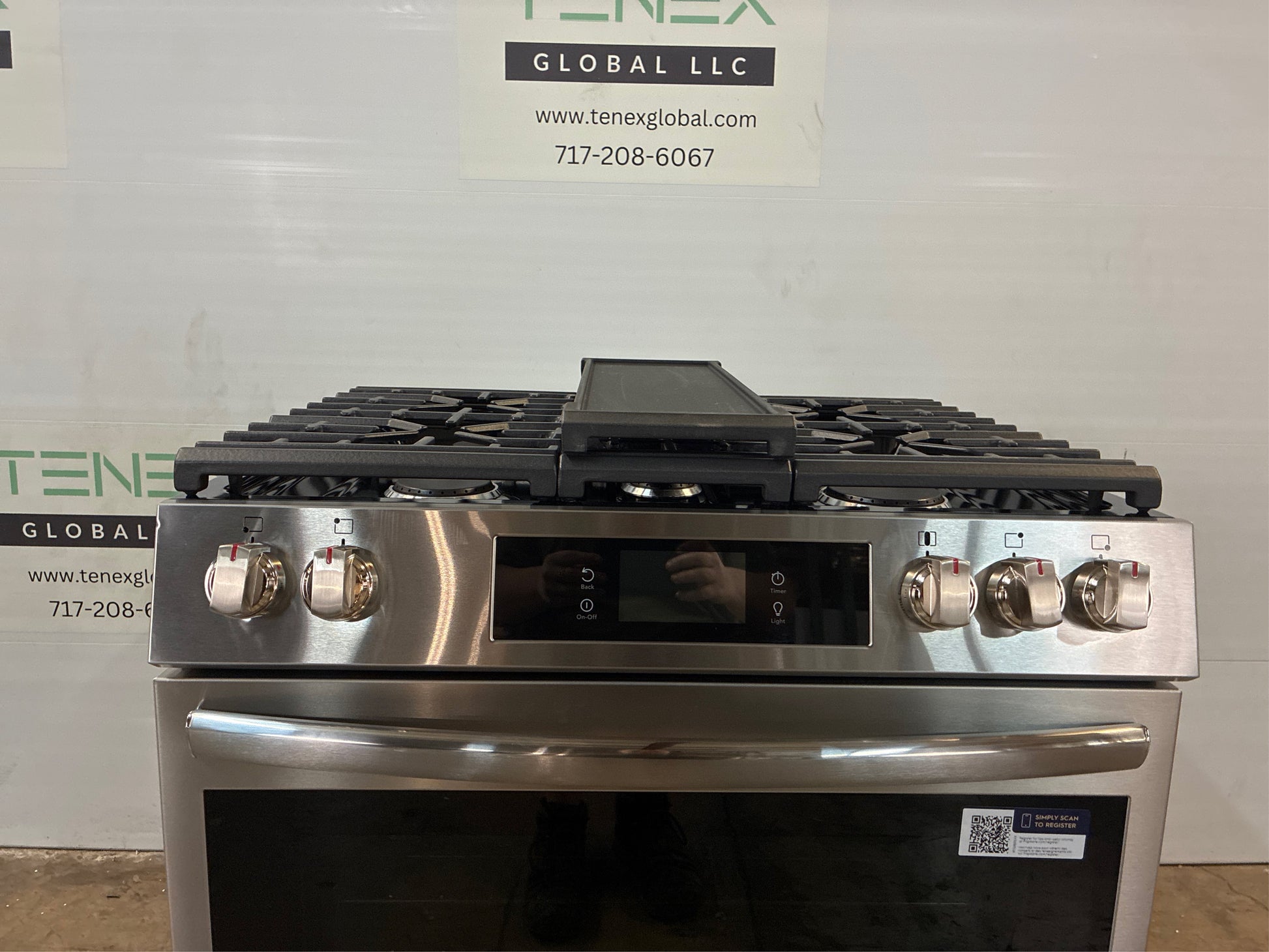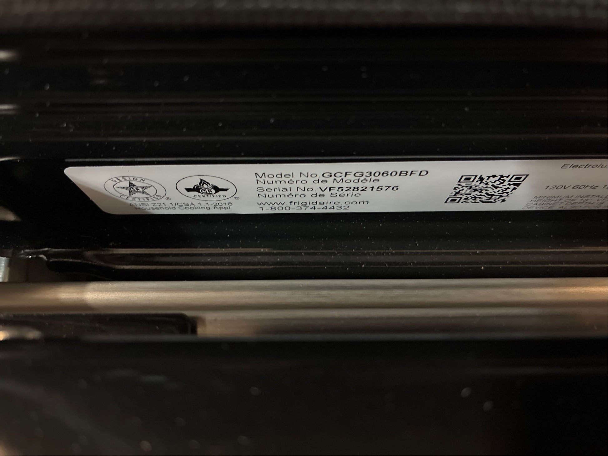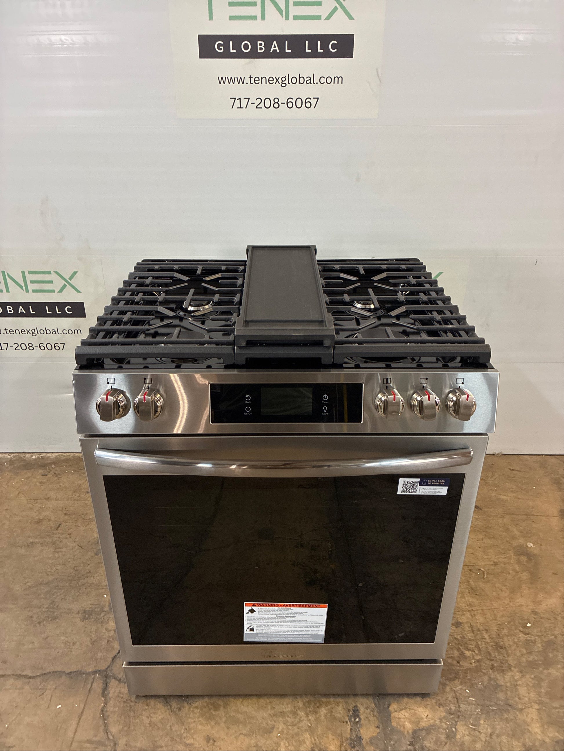 The FRIGIDAIRE GALLERY 30 in. Front Control Gas Range with Total Convection, features our most powerful and advanced convection system, which enables cooking modes like No Preheat, Air Fry, Slow Cook, Steam Bake, Steam Roast, Air Sous Vide, Convection Roast, Convection Bake, Bread Proof and more. The flexible five burner cooktop includes a powerful 18,000 BTU Quick Boil Burner and a center oval burner with an integrated cast iron griddle. This range also features backlit LED knobs, our premium touch screen digital control panel and our fingerprint resistant, Smudge-Proof finish.. Appliance Category: Range. Appliance Series: Frigidaire Gallery. Appliance Type: Gas Range. Burner Grate Material: Cast Iron. Burner No.1 BTU: 18000. Burner No.2 BTU: 5000. Burner No.3 BTU: 14000. Burner No.4 BTU: 10000. Burner No.5 BTU: 10000. Capacity of Oven (cu. ft.): 6 cu ft. Cleaning Type: Self Cleaning. Color of Cooktop: Black. Color/Finish: Smudge-Proof Stainless Steel. Color/Finish Family: Stainless Steel. Commercial/Residential: Residential. Control Type: Electro-Mechanical. Controls Location: Front Control. Cooktop Features: Bridge Element,Continuous Grates,Indicator Light- Heating Element On,LP Convertible,Melting Burner,Power Element,Sealed Burners,Smudge-Proof,Warming Zone,With Griddle. Cooktop Surface Type: Burner Grate. Drawer Type: Lower Storage Drawer. Fuel Type: Gas. Hardware Color/Finish: Stainless Steel. Hardware Color/Finish Family: Stainless Steel. Ignition Type: Electrical. Included: No Additional Items Included. Number of Burners: 5 burner. Number of Oven Racks: 2. Number of Rack Positions: 8. Oven Cleaning Options: Delay Clean,Self-Cleaning,Steam Clean. Oven Cooking Process: Air Fry,Air Sous Vide,Dehydrator Oven,Steam Oven,True Convection. Oven Features: Adjustable Leg Heights,Automatic Convection Conversion,Broiler in Oven,Delay Bake/Delay Start,Fingerprint Resistant,Oven Light,Oven Temperature Probe. Product Weight (lb.): 205 lb. Range Installation Type: Slide-In. Returnable: Non-Returnable. Certifications and Listings: CSA Listed. Depth With Door(s) Open 90 Degrees (in.): 47.3125 in. Oven Interior Depth (in): 19.875. Oven Interior Height (in): 20.6875. Oven Interior Width (in): 25.1875. Product Depth (in.): 26 in. Product Height (in.): 35.625 in. Product Width (in.): 30 in. Range Size (Width): 30 in.. Range Size (Width): 30 in.. Range Installation Type: Slide-In. No of Burners: 5 burner. Capacity (cu. ft.): 6 cu ft.. Capacity (cu. ft.): 6 cu ft. Cleaning Type: Self Cleaning. Oven Cooking Process: Air Fry. Drawer Type: Lower Storage Drawer